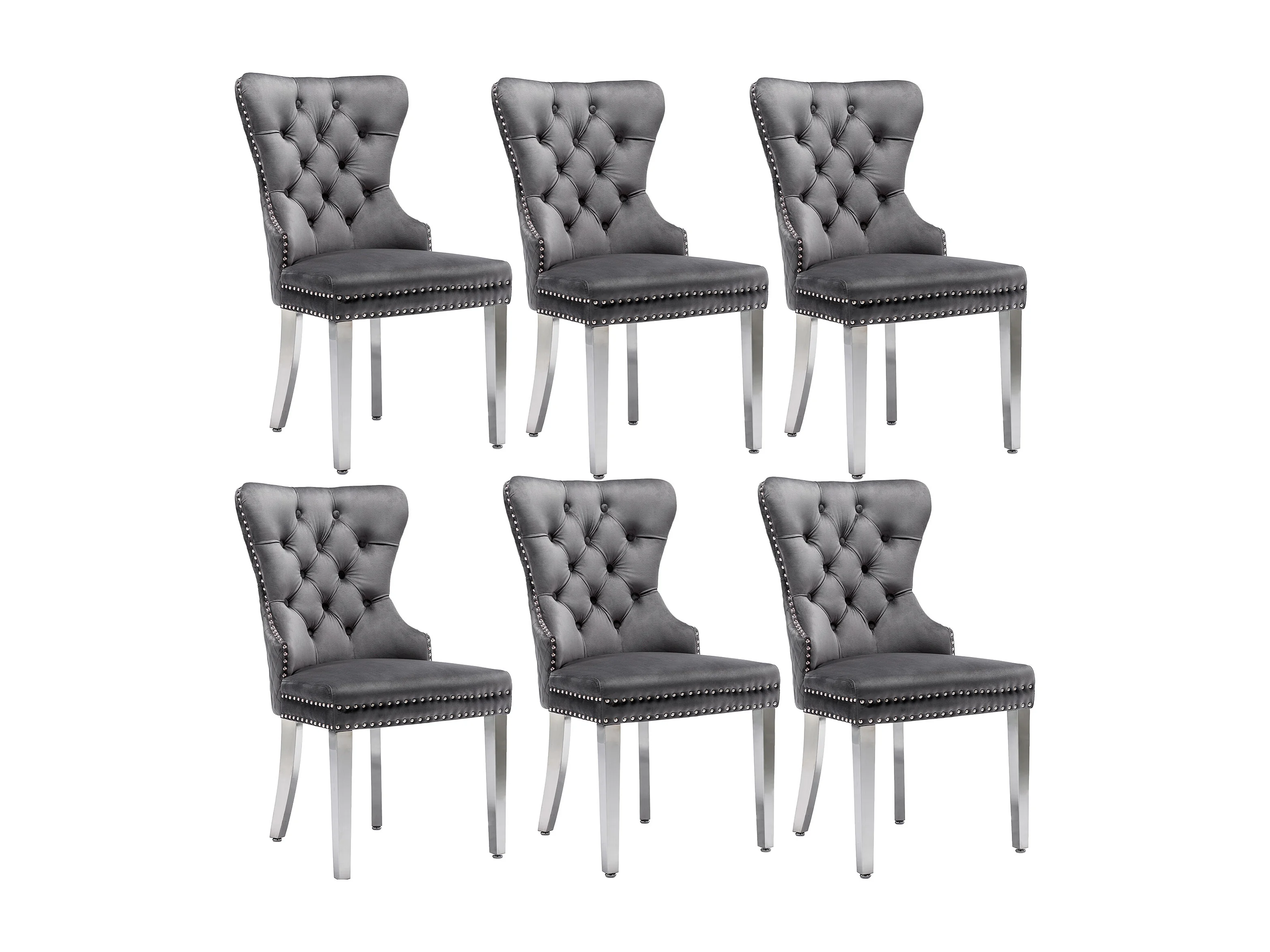 Chaise de salle à manger avec clous décoratifs et dossier en forme de cloche, structure en métal, revêtement en velours, gris (53x62.5x94.5 cm)