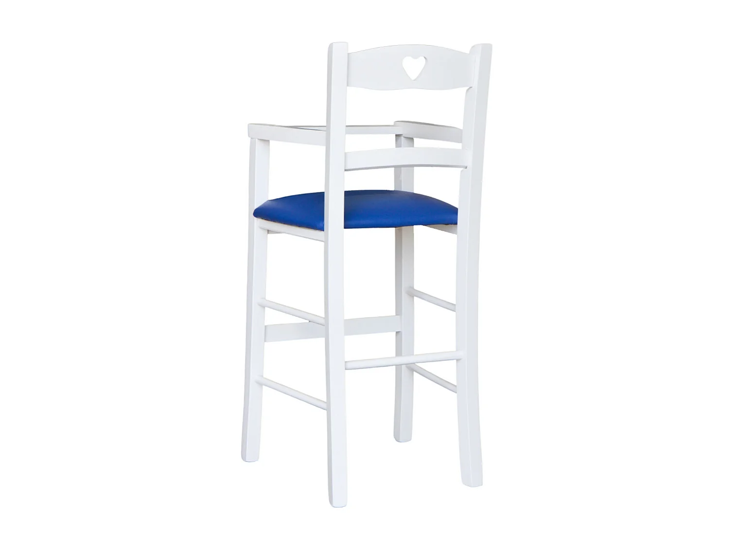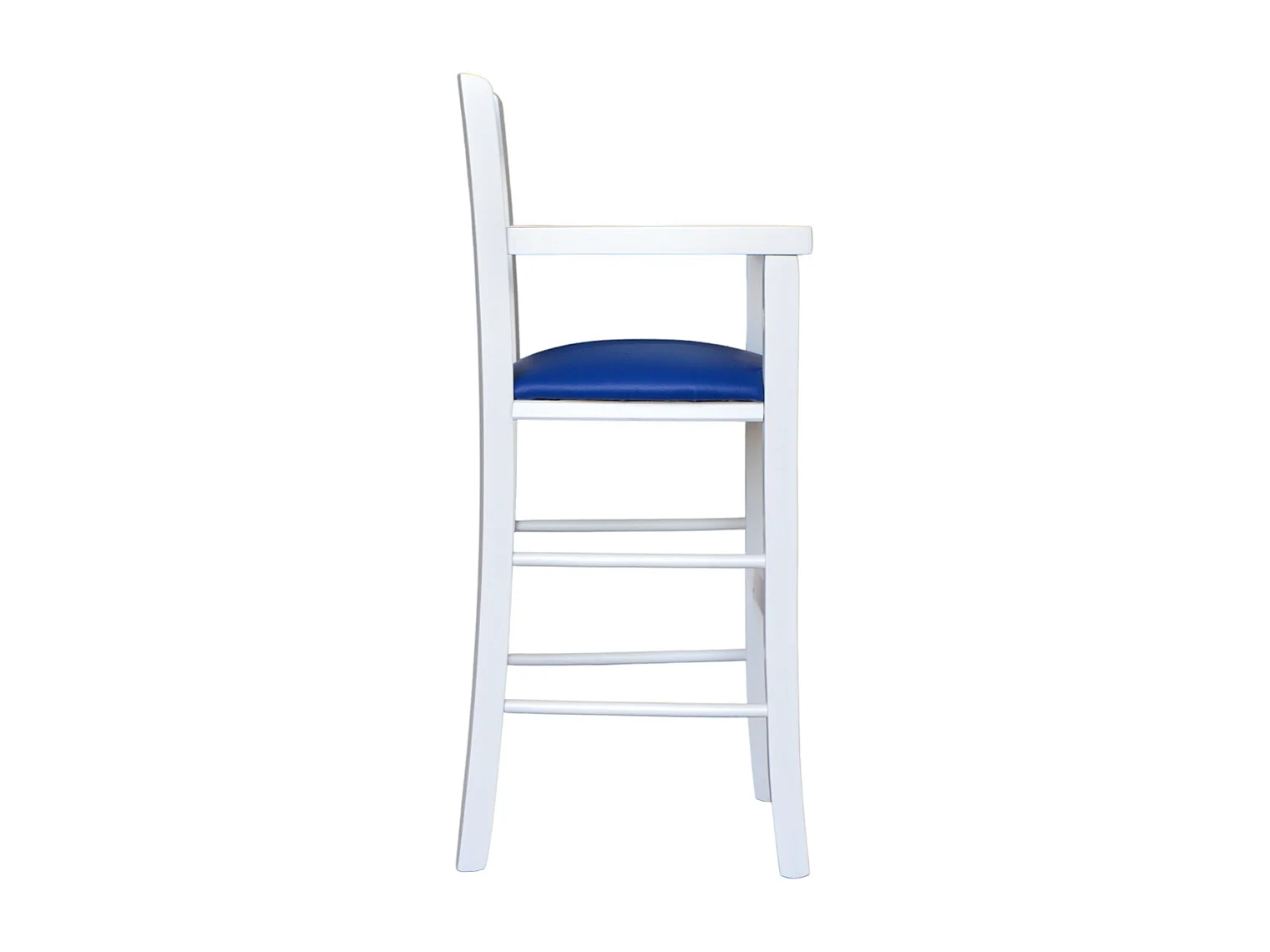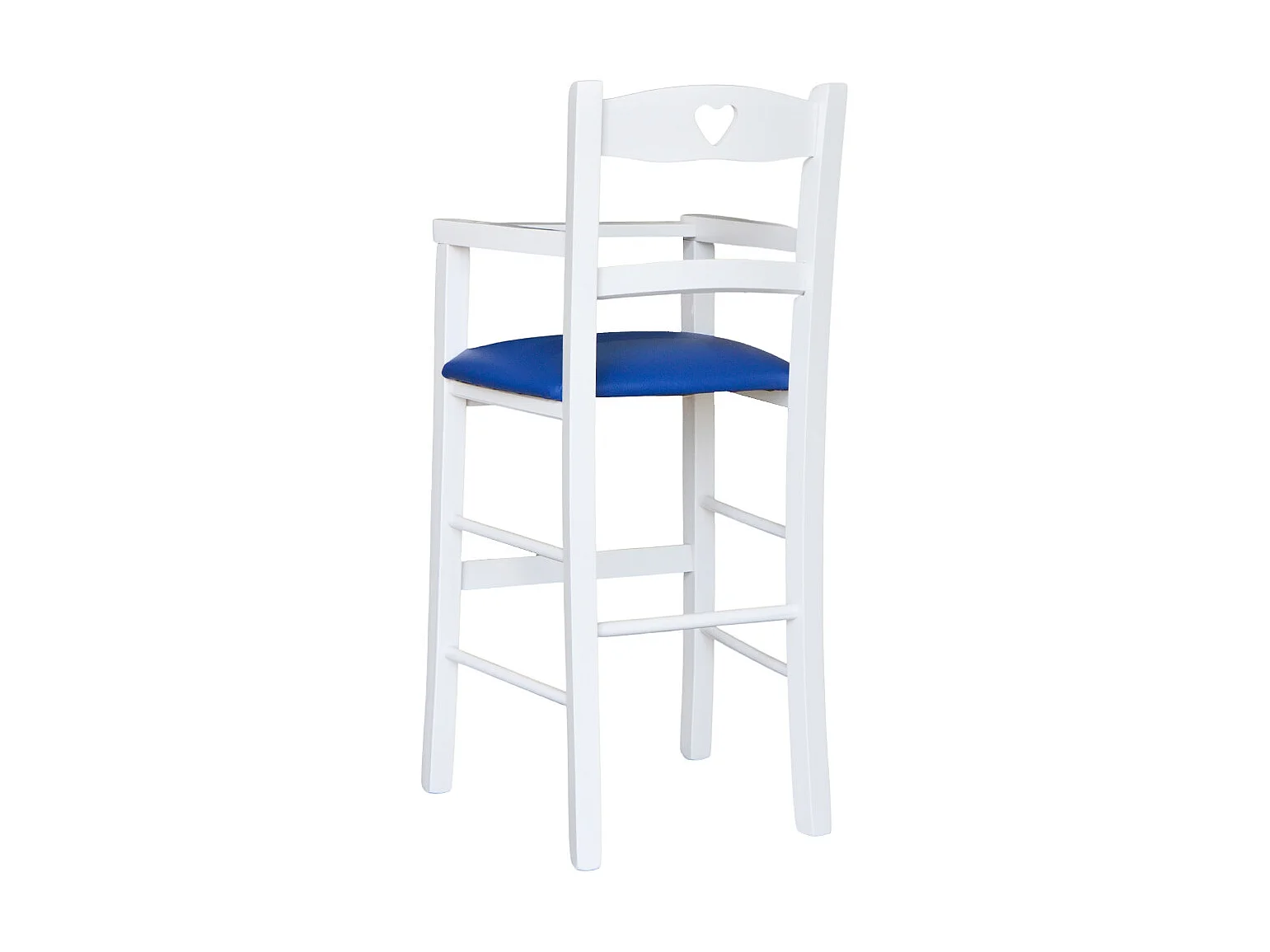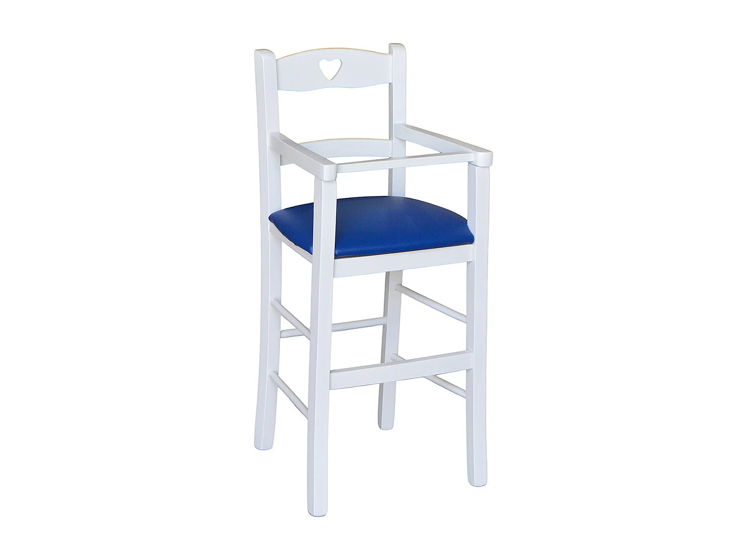Chaise haute en bois blanc avec assise rembourrée en similicuir bleu
