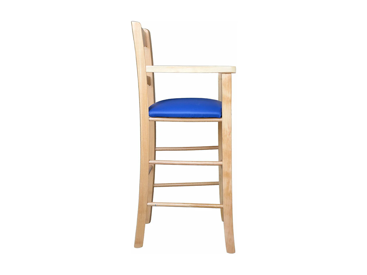 Chaise haute en bois naturel avec assise rembourrée en simili cuir bleu