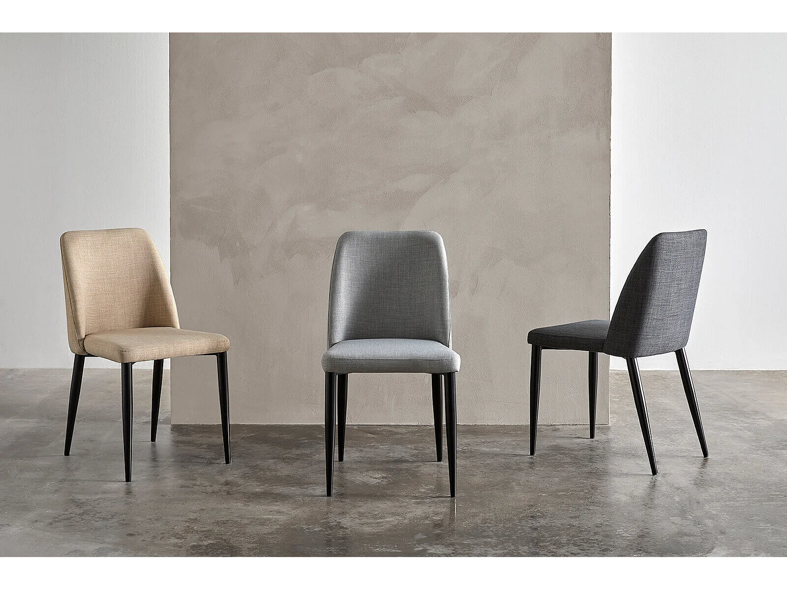 Chaise moderne tissu beige clair rembourré et pieds métal noir Maliza