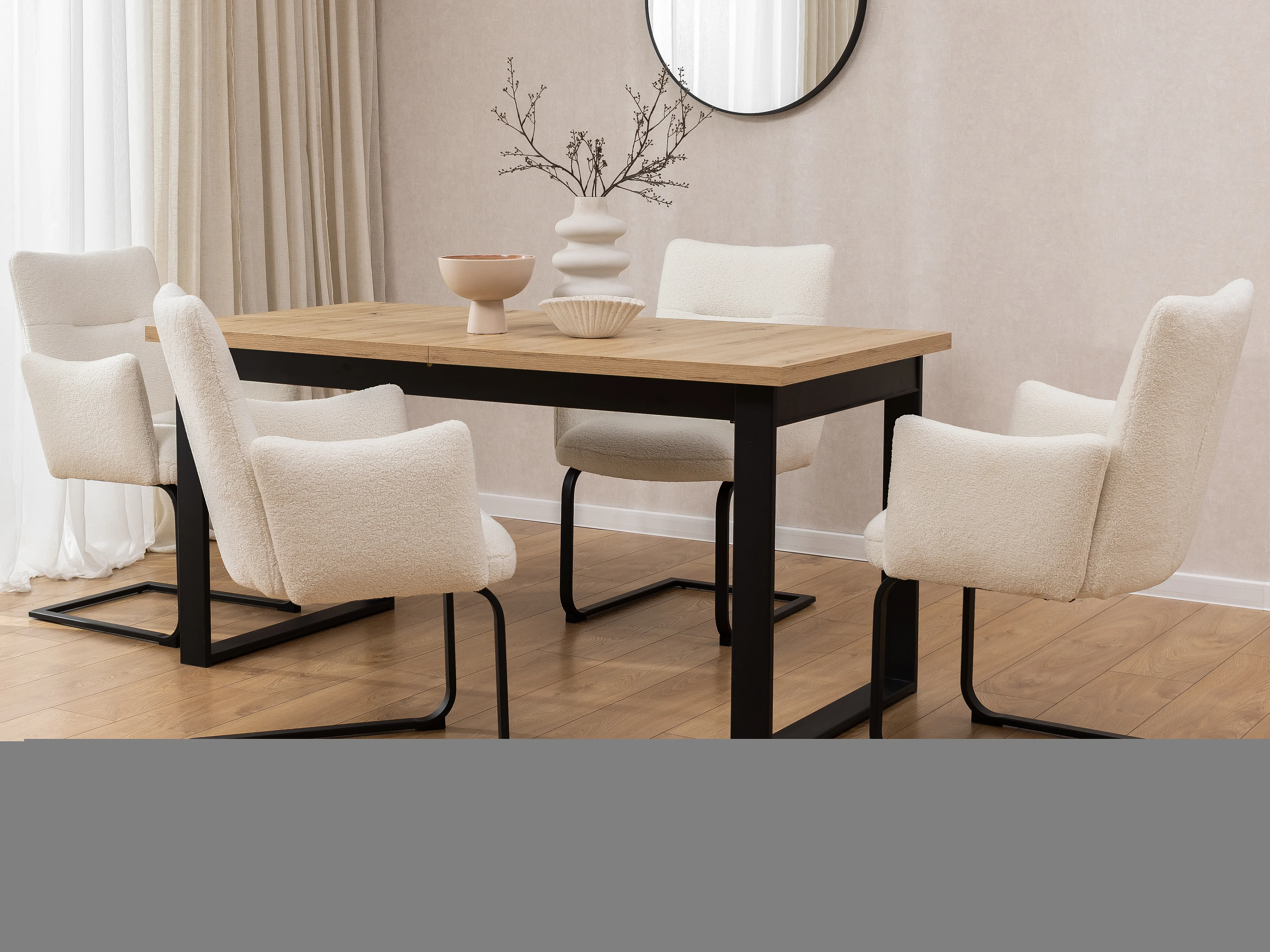 Chaise rembourrée au design moderne, en bouclé blanc, avec accoudoirs et piètement luge en métal noir - Hera