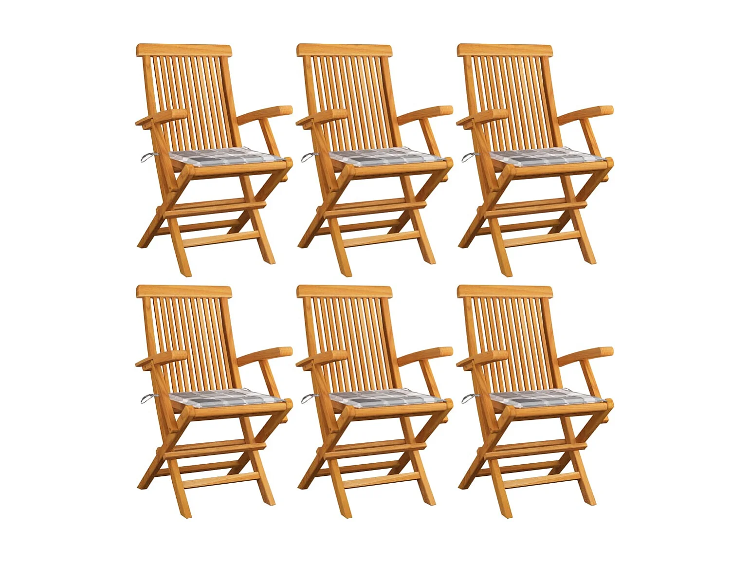 Chaises de jardin et coussins à carreaux gris 6 pcs Teck massif