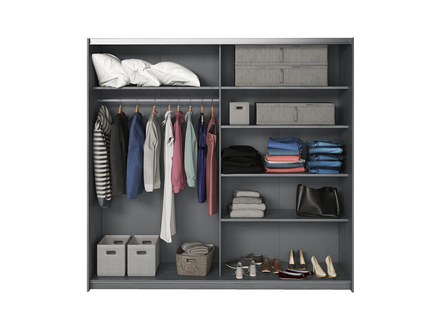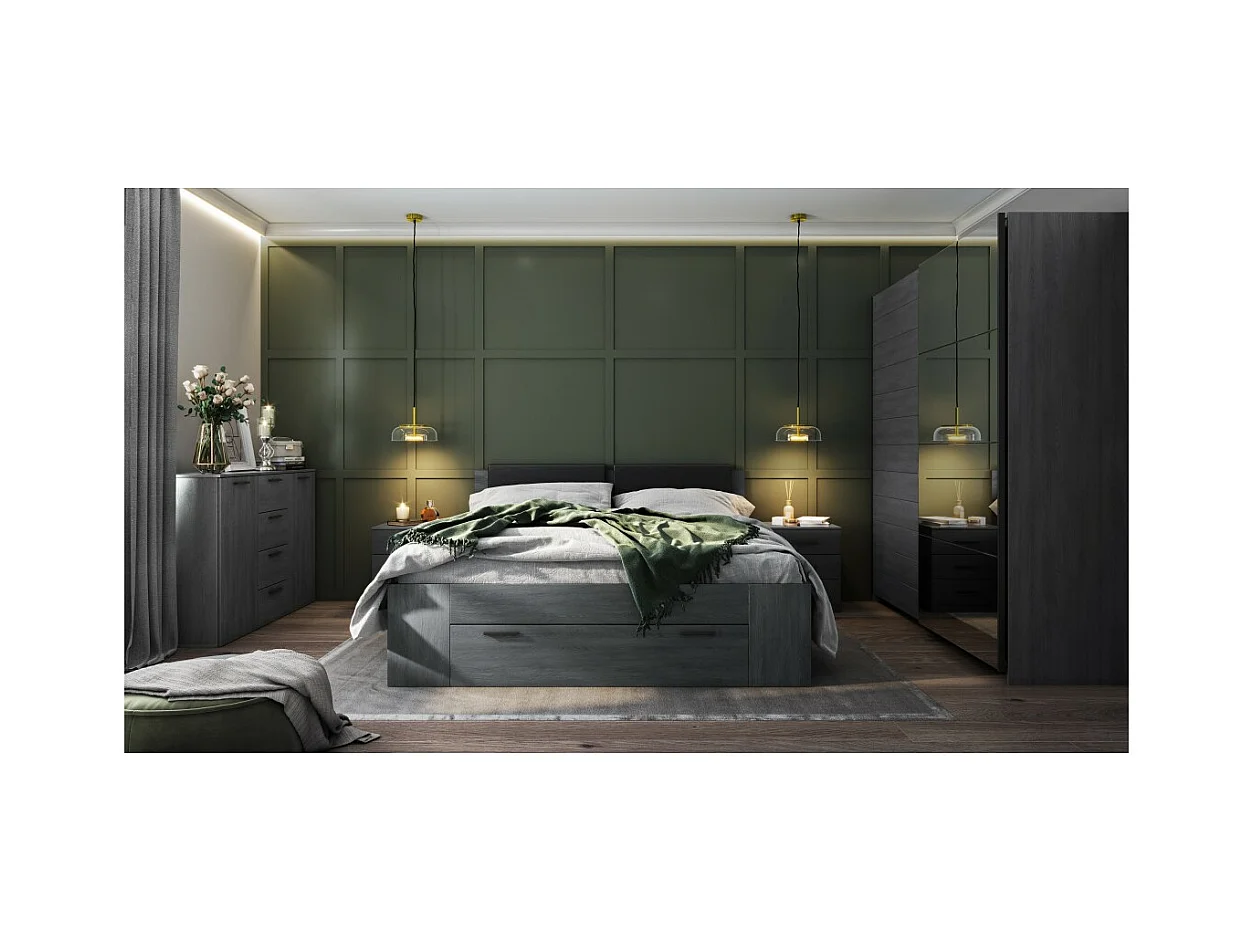 Chambre à coucher FLOYD : Armoire 220cm, Lit 160x200, commode, chevets. Coloris gris effet bois.