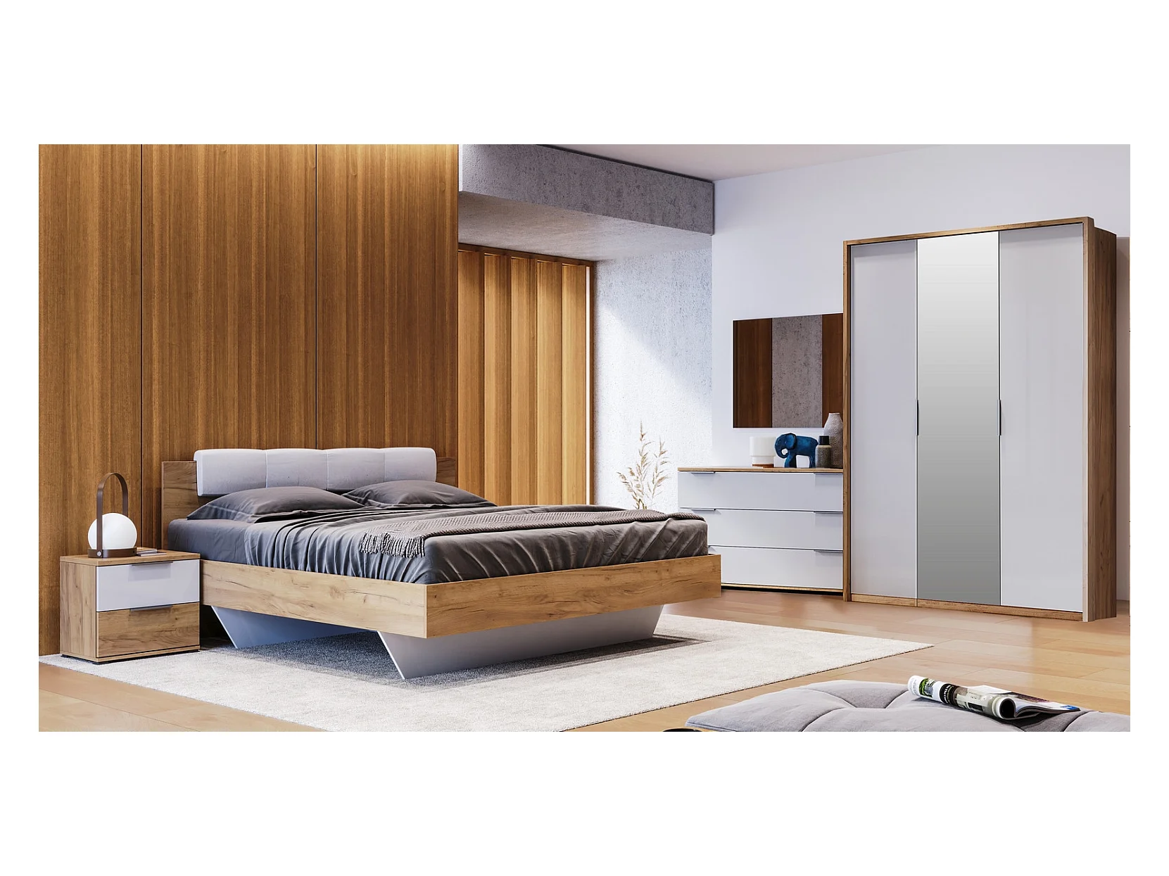 Chambre ASTO , blanc laqué et chêne clair 160x200 cm - AVEC ARMOIRE