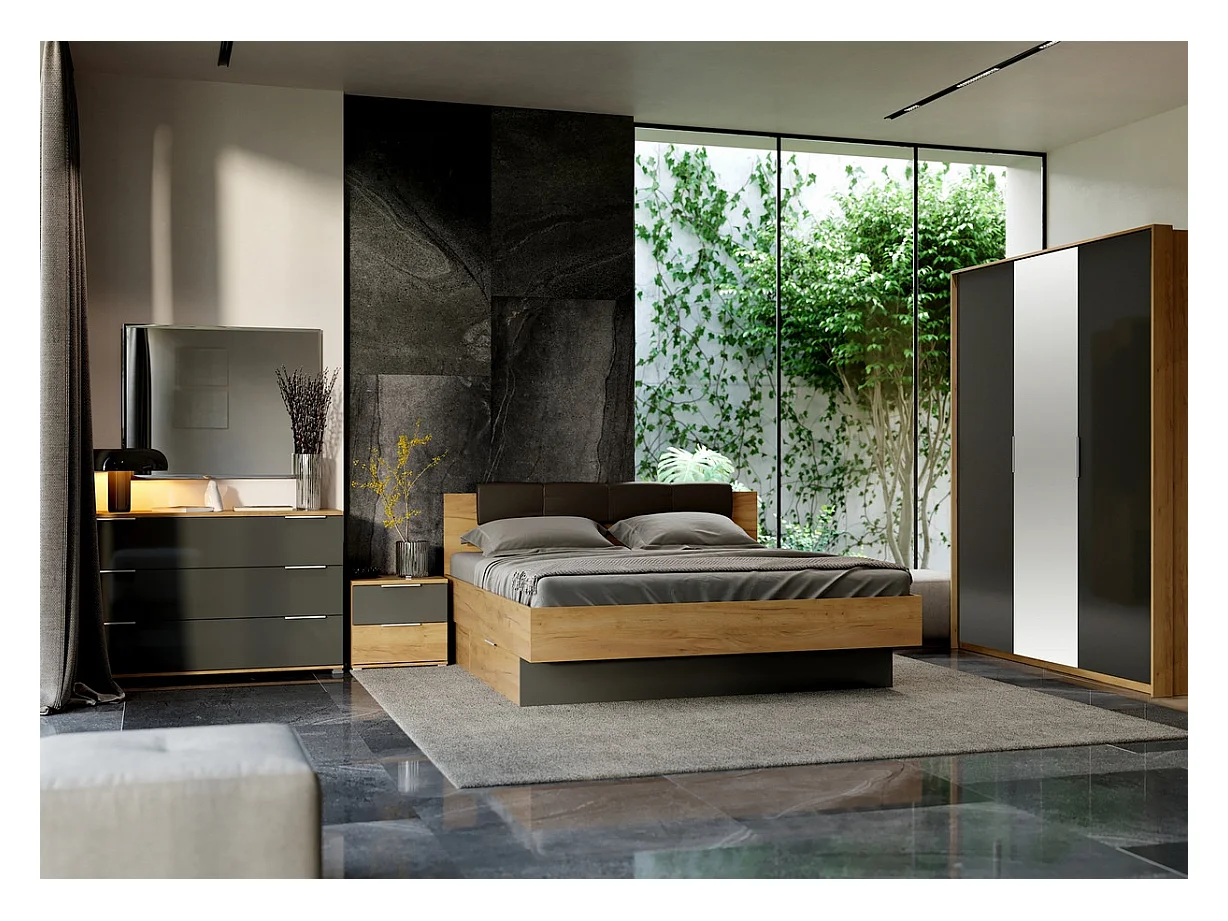 Chambre LUNA avec tiroir de rangement, chevets posés, lave mat et chêne clair 160x200 cm - SANS ARMOIRE