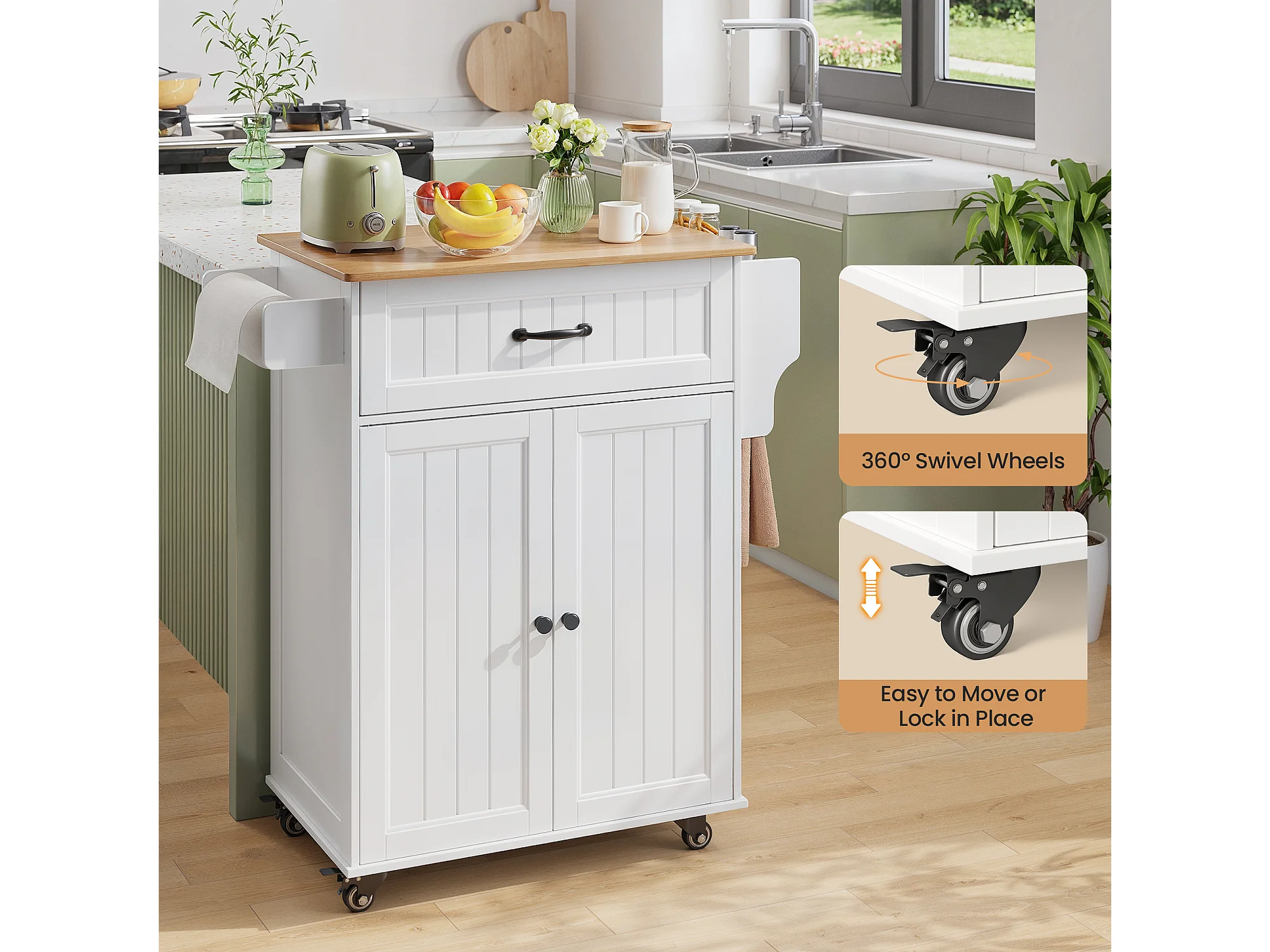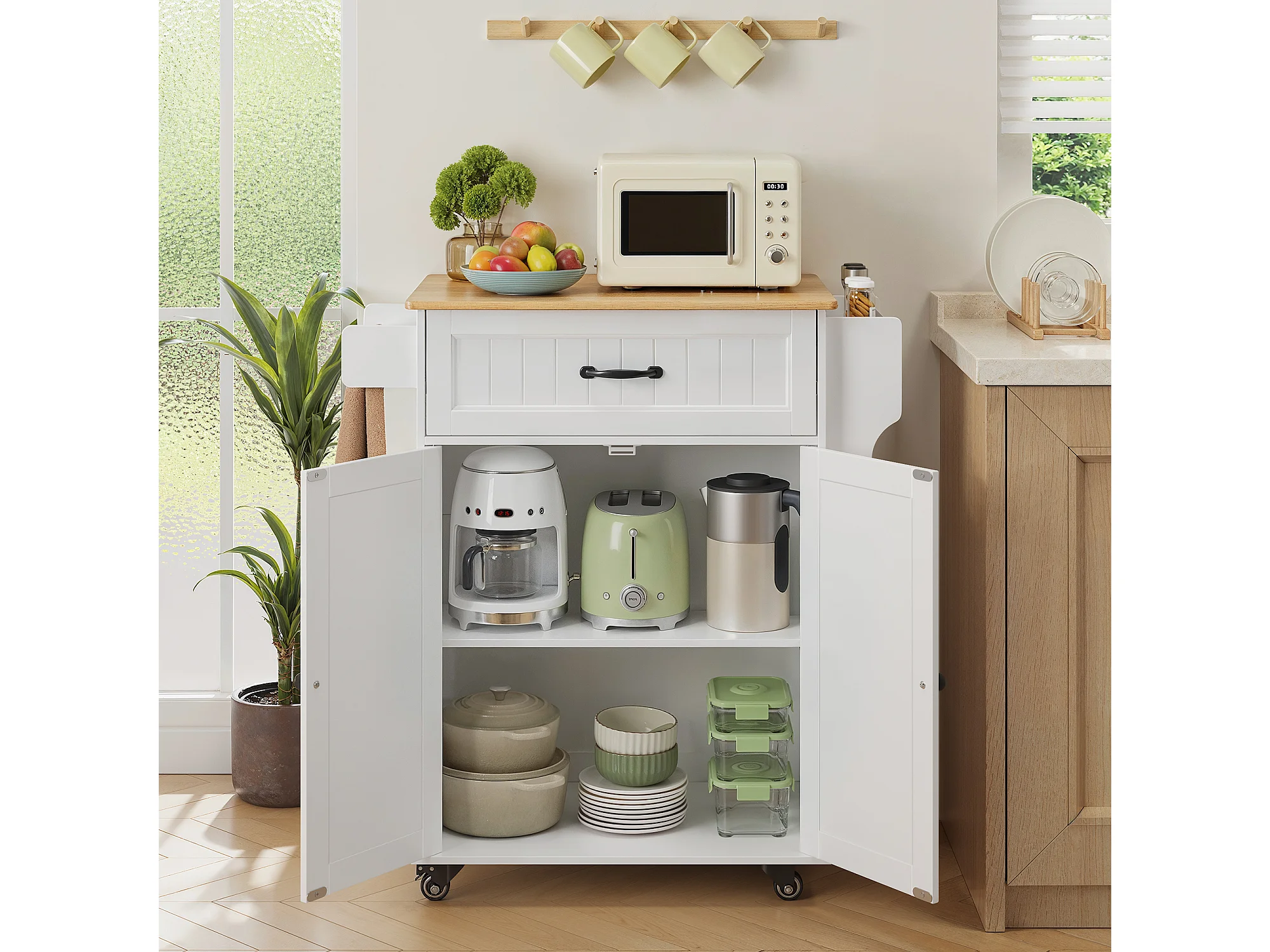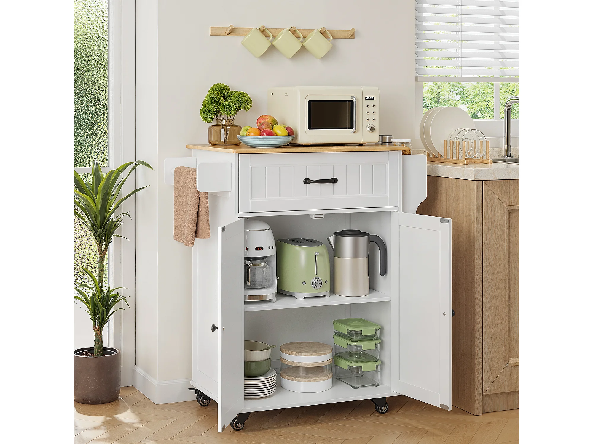 Desserte de cuisine à roulettes avec 2 tiroirs et portes, plateau extensible en finition bois, blanc