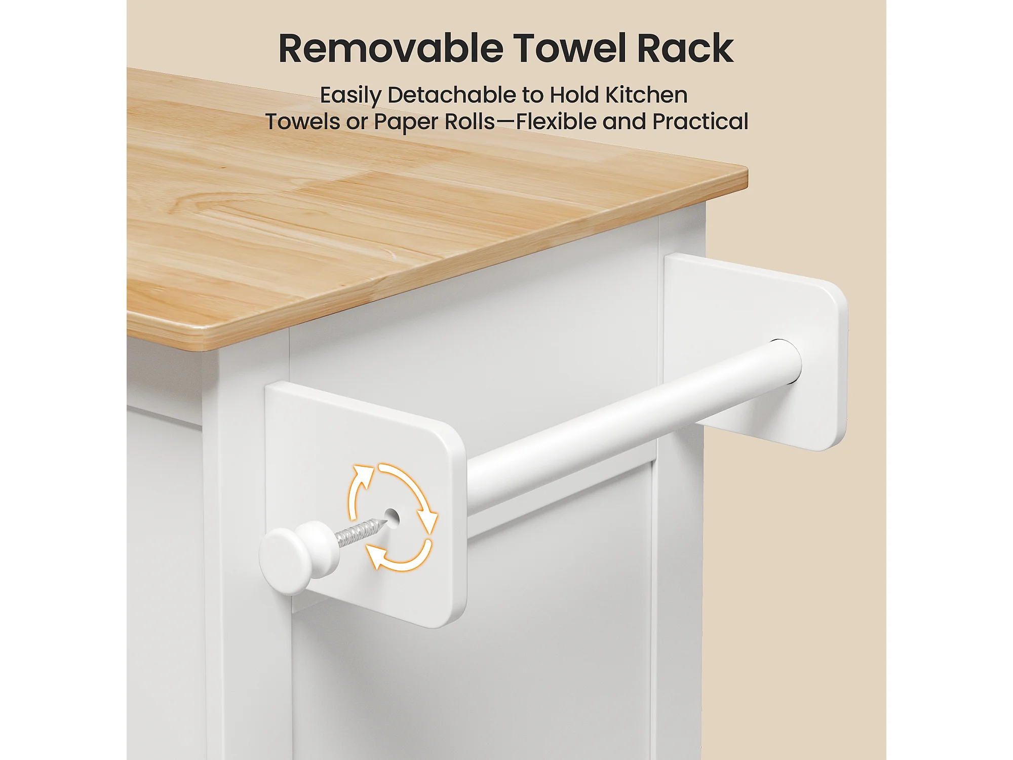 Desserte de cuisine blanche (118×43×98 cm) avec plateau bois, rangement multifonction, roulettes et porte-serviette