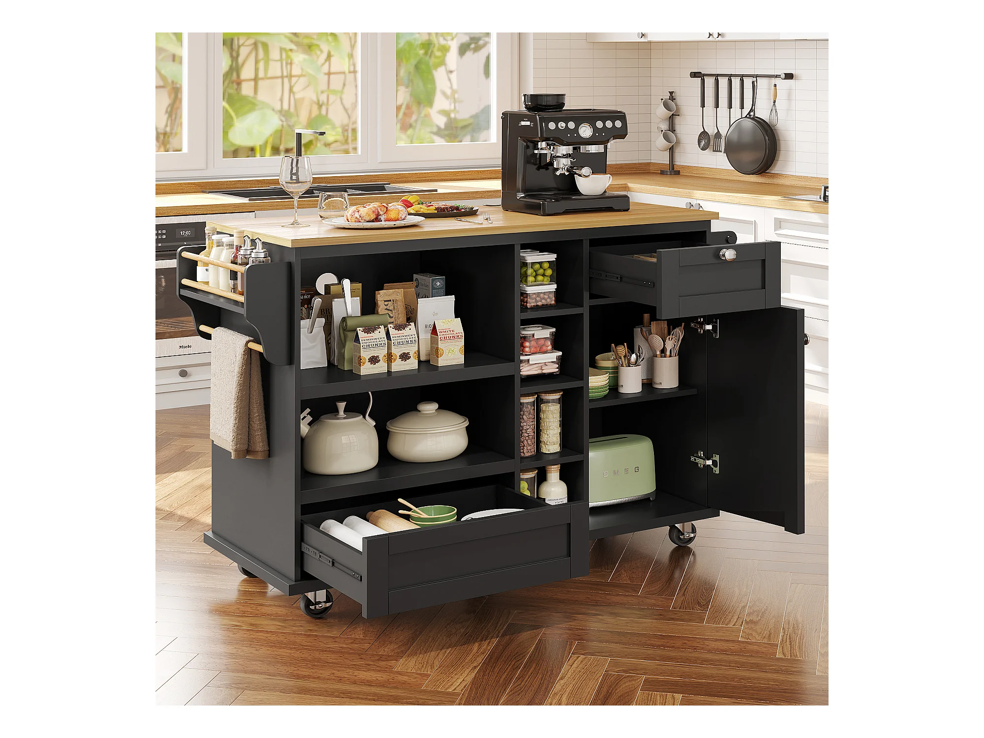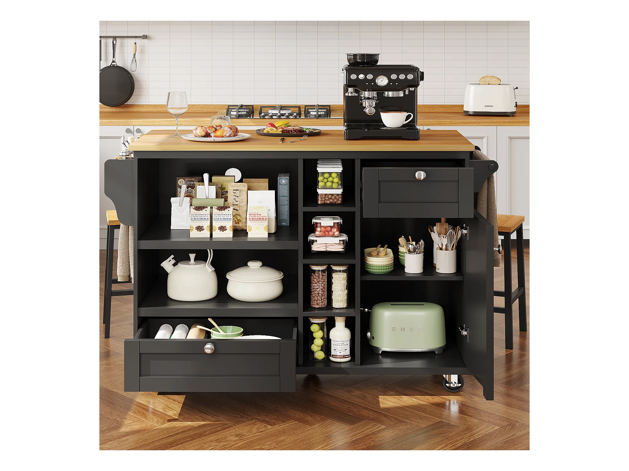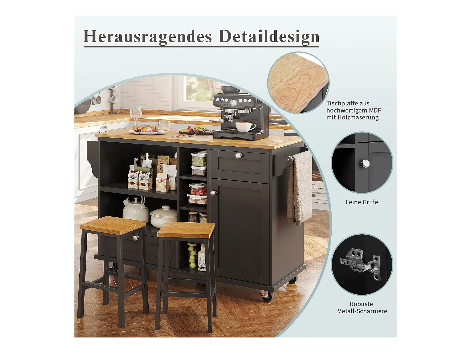 Chariot de Cuisine mobile, moderne et simple, noir, avec étagères et tiroirs, plan de travail en bois clair (129 x 46 x 92 cm)