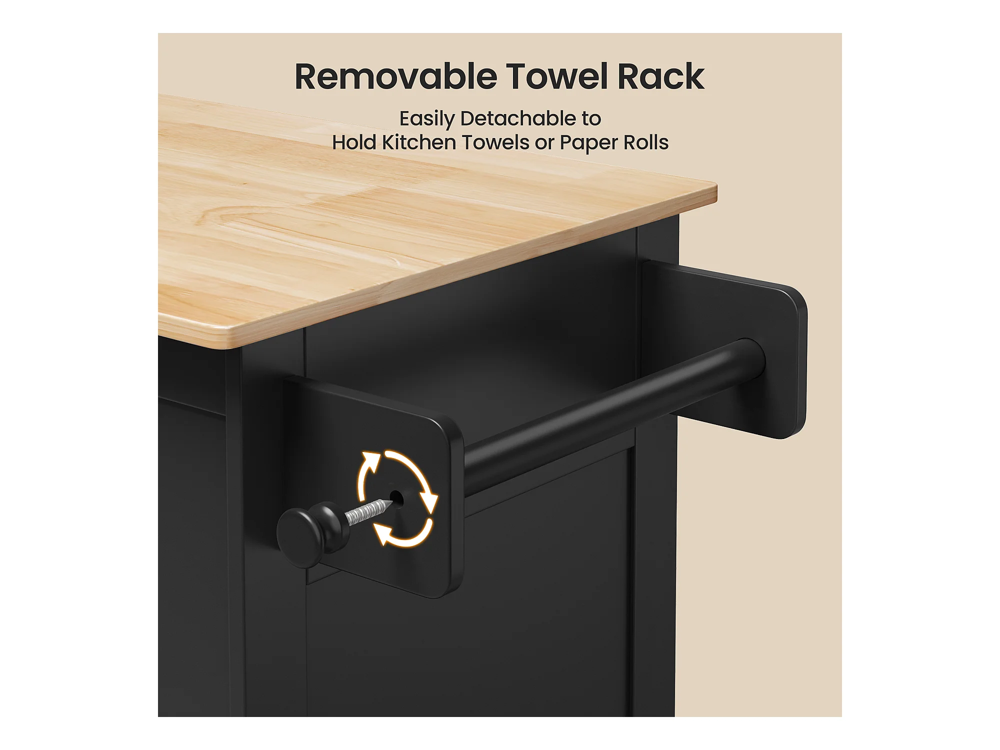 Desserte de cuisine noire (118×43×98 cm), avec roulettes, plateau bois, rangements modulables et porte-serviette