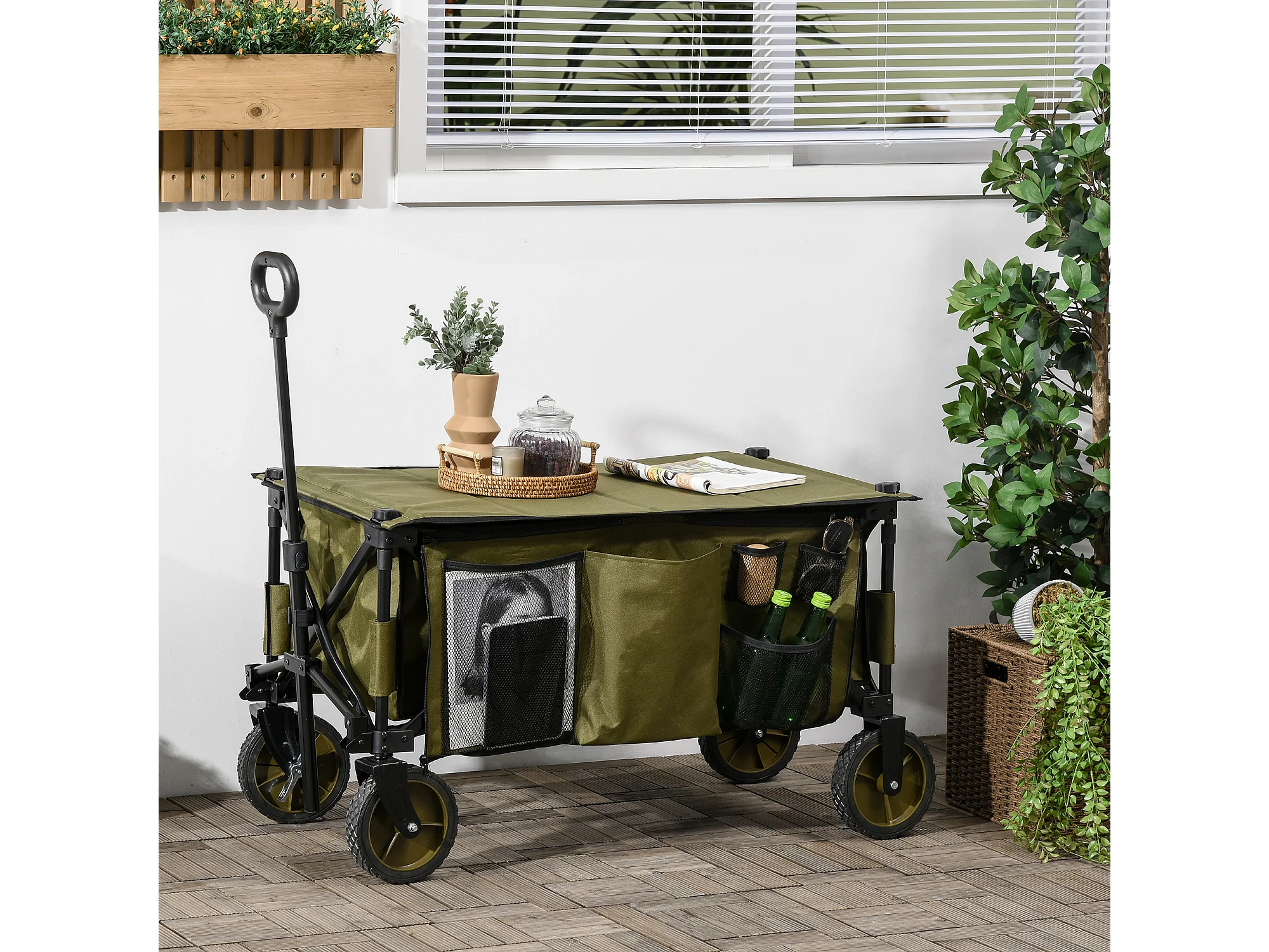Chariot de jardin pliable 4 roues - bâche amovible, poignée télescopique réglable, 5 pochettes rangement - acier polyester kaki