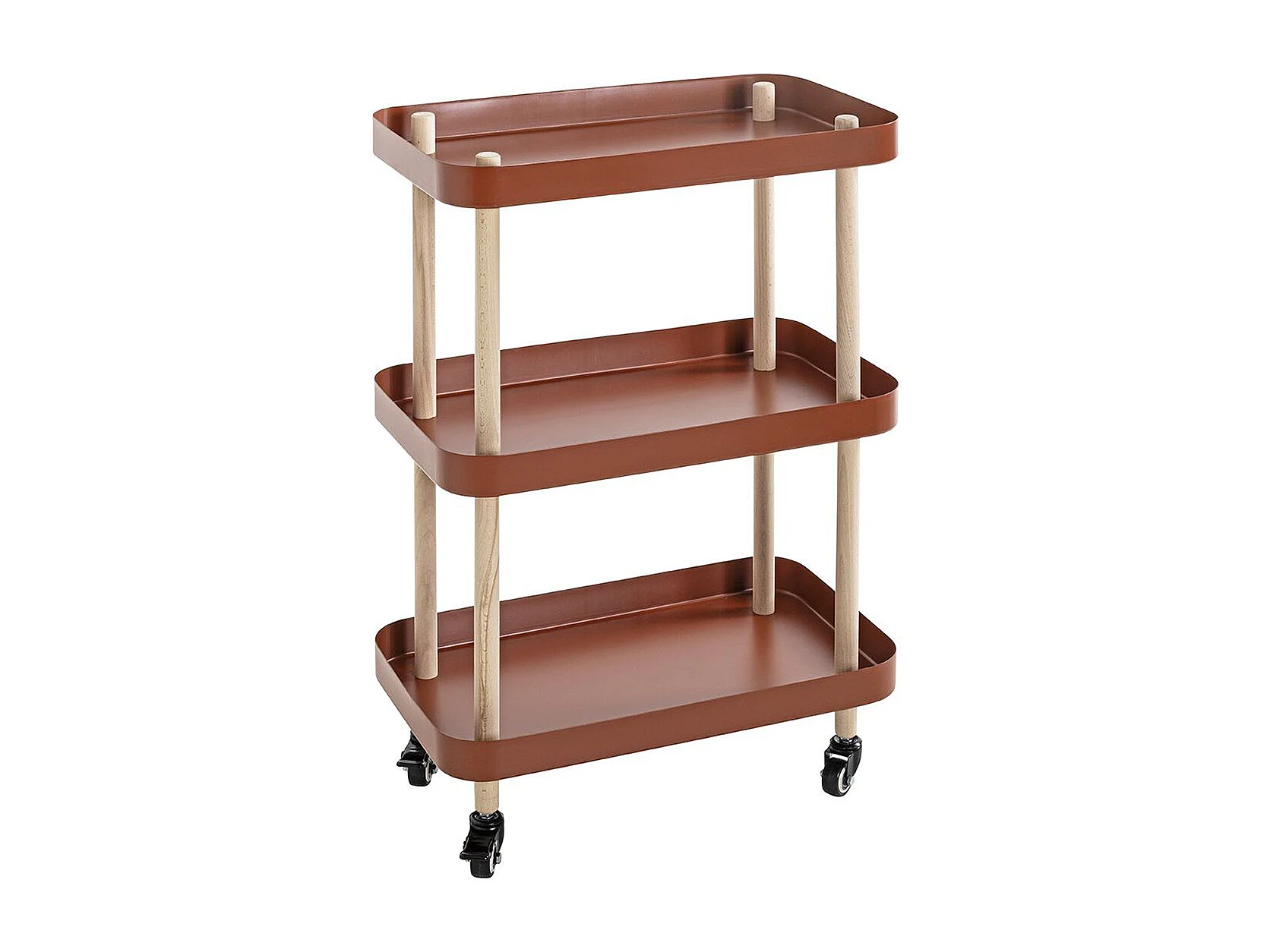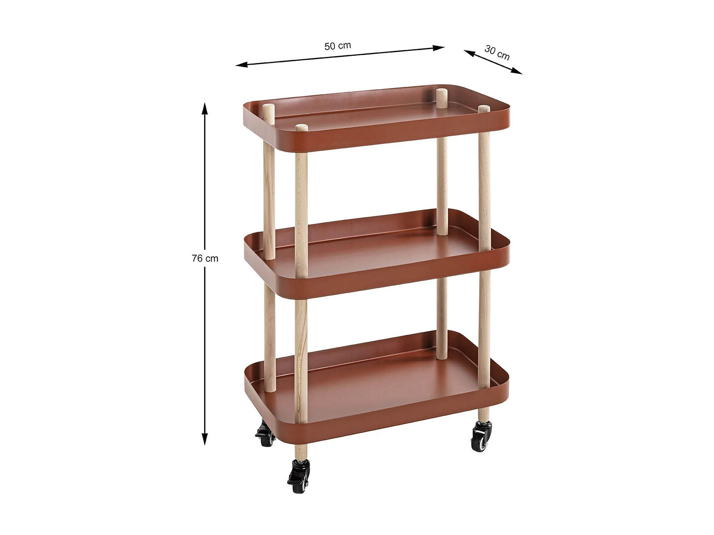 Chariot de service, desserte en bois coloris naturel et métal rouge - longueur 50 x profondeur 30 x hauteur 76 cm