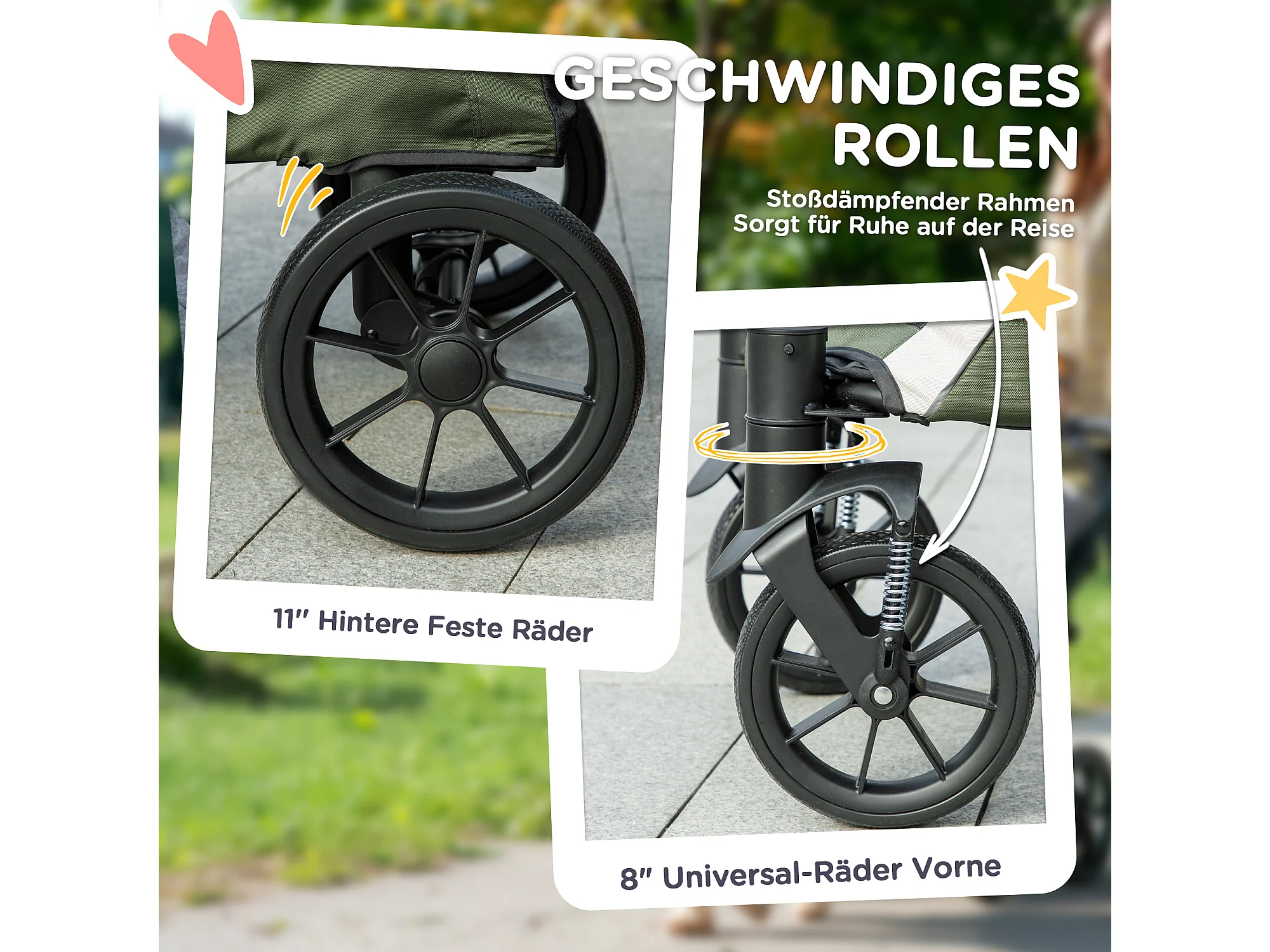 Chariot pliable pour chien et chat jusqu'à 30 kg, polyester, vert foncé, avec coussin et freins (124x67x100 cm)