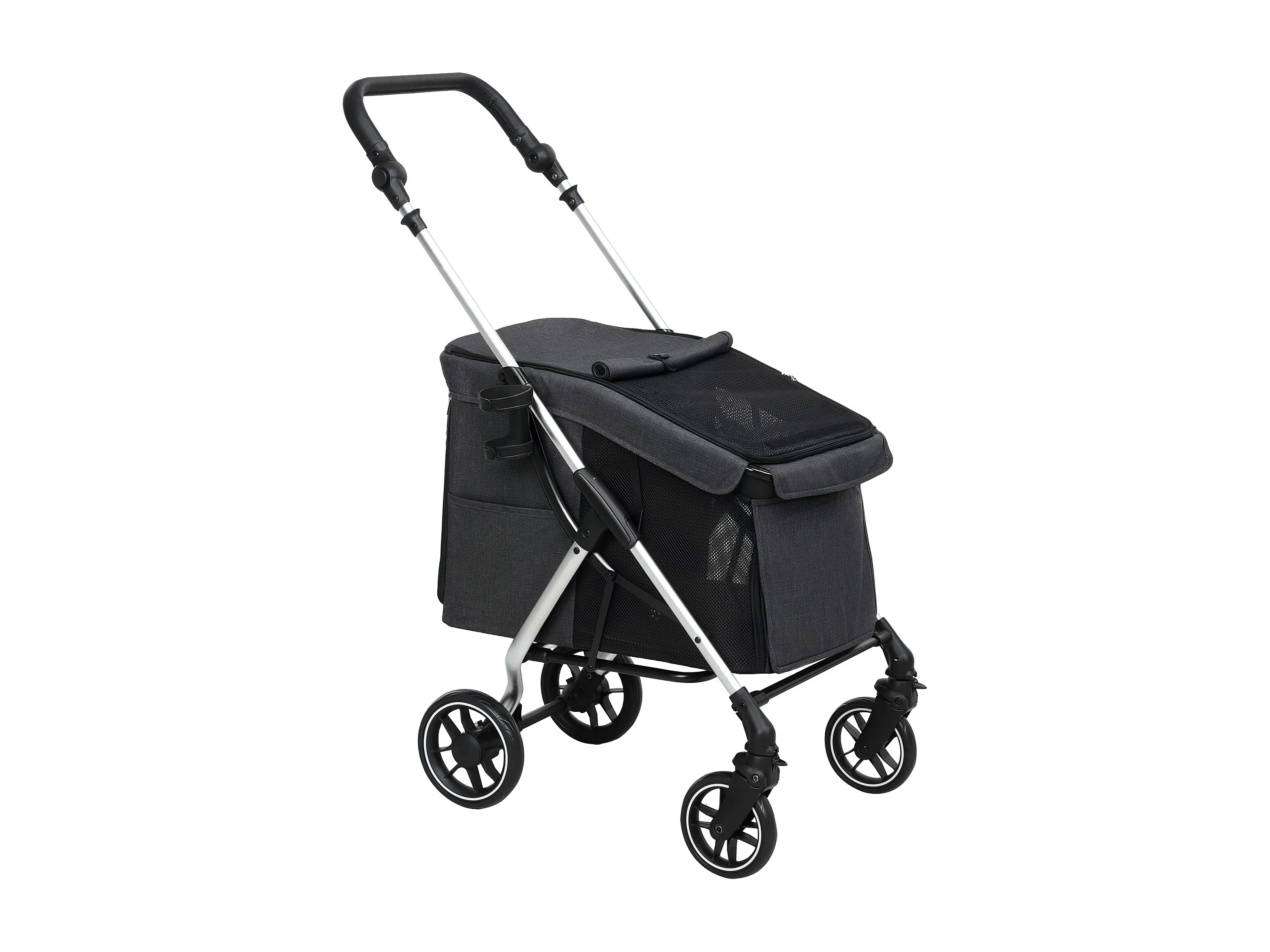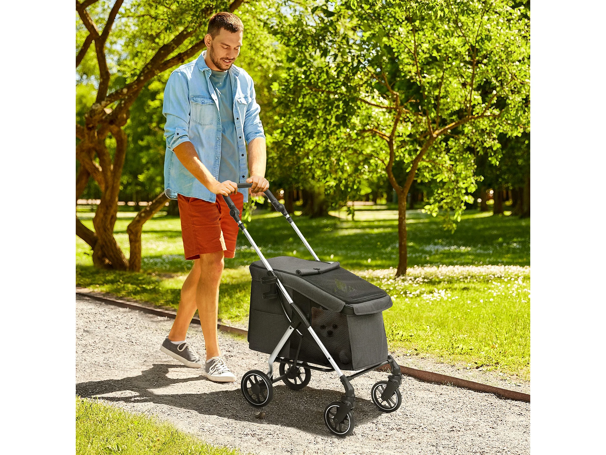 Chariot pliable pour chien et chat, léger en aluminium, avec coussin et panier de rangement, gris (80x48.5x106 cm)