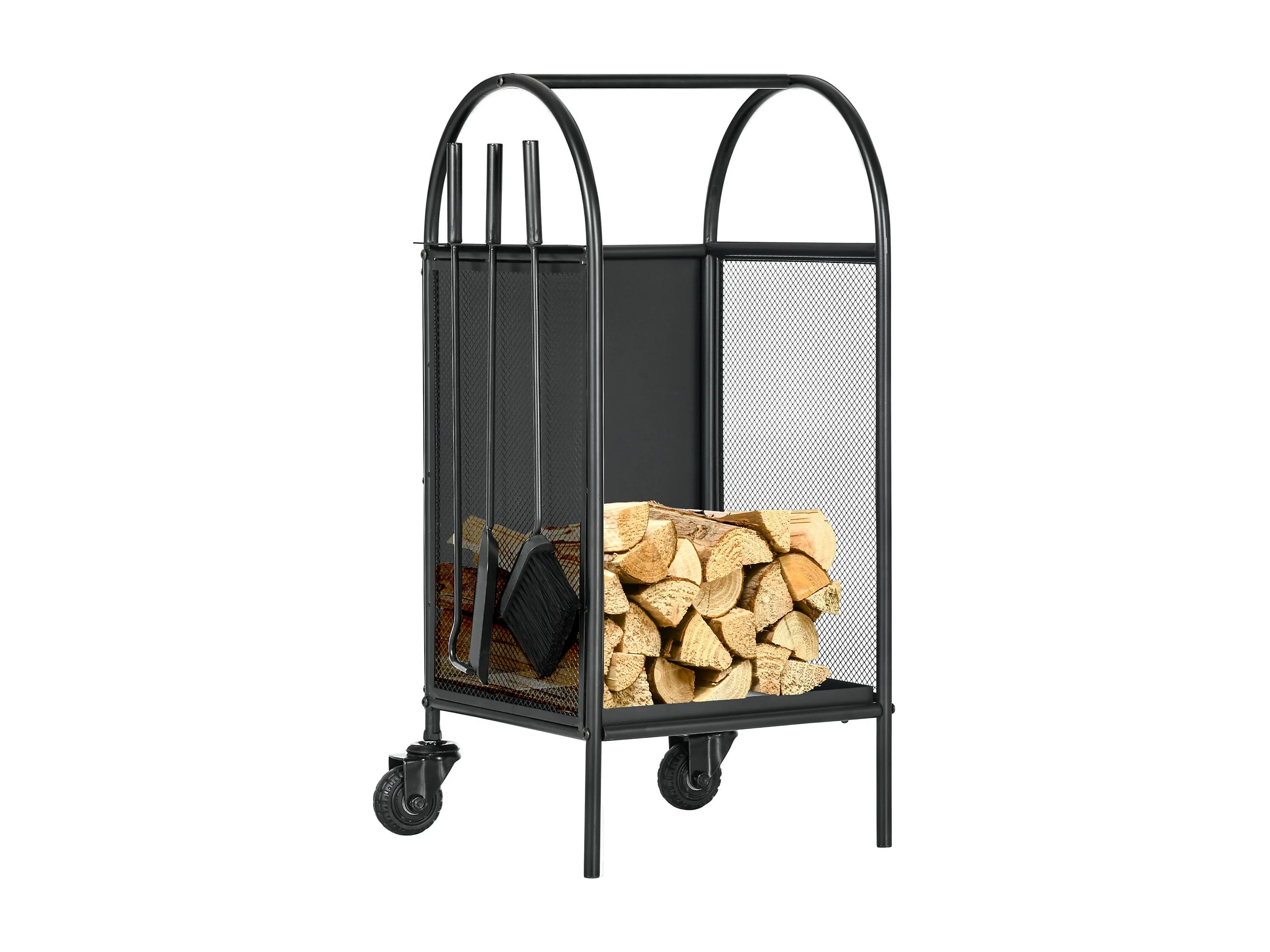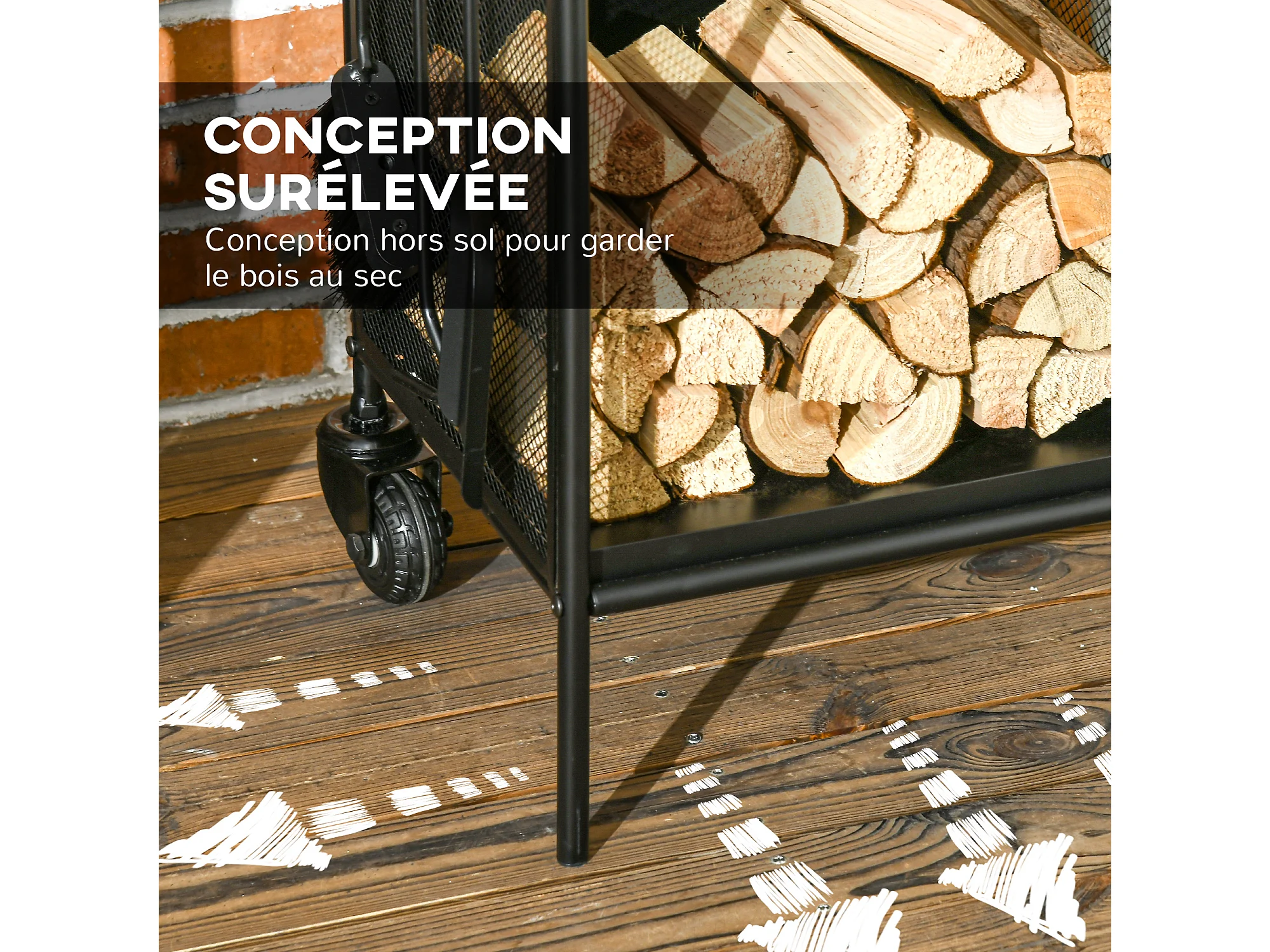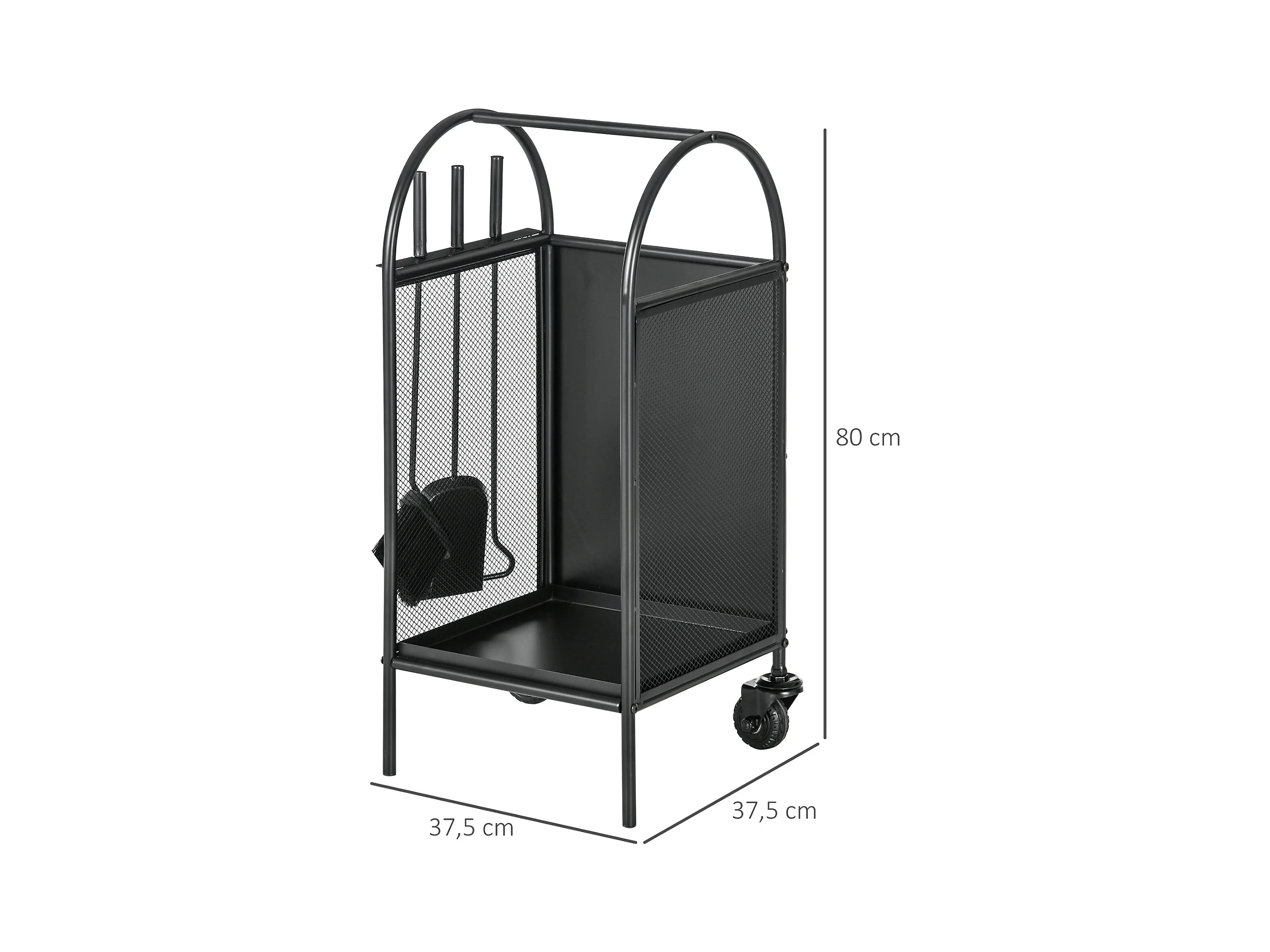 Chariot - porte bûches - range bûches - multi-accessoires avec 2 roulettes métal noir