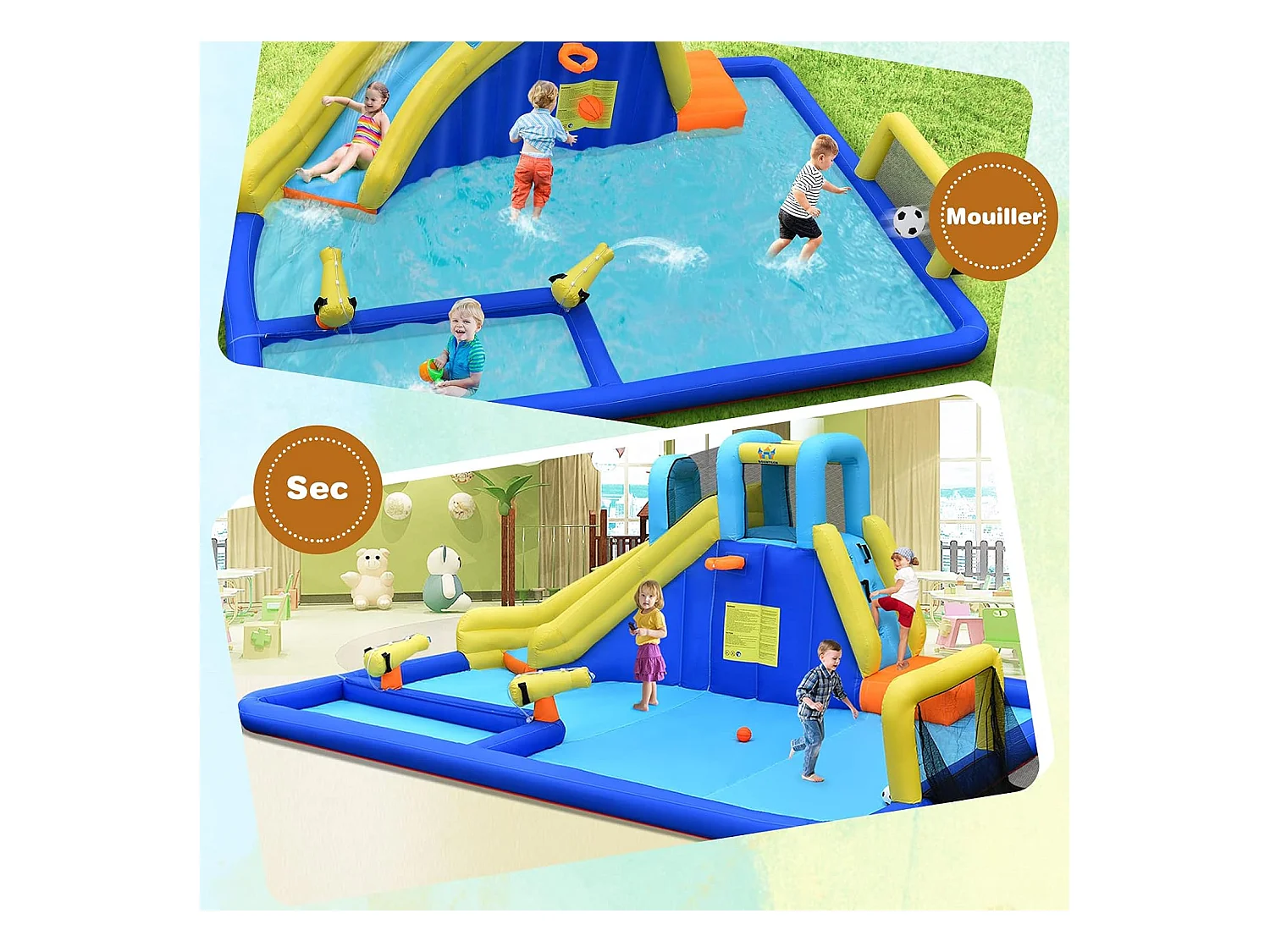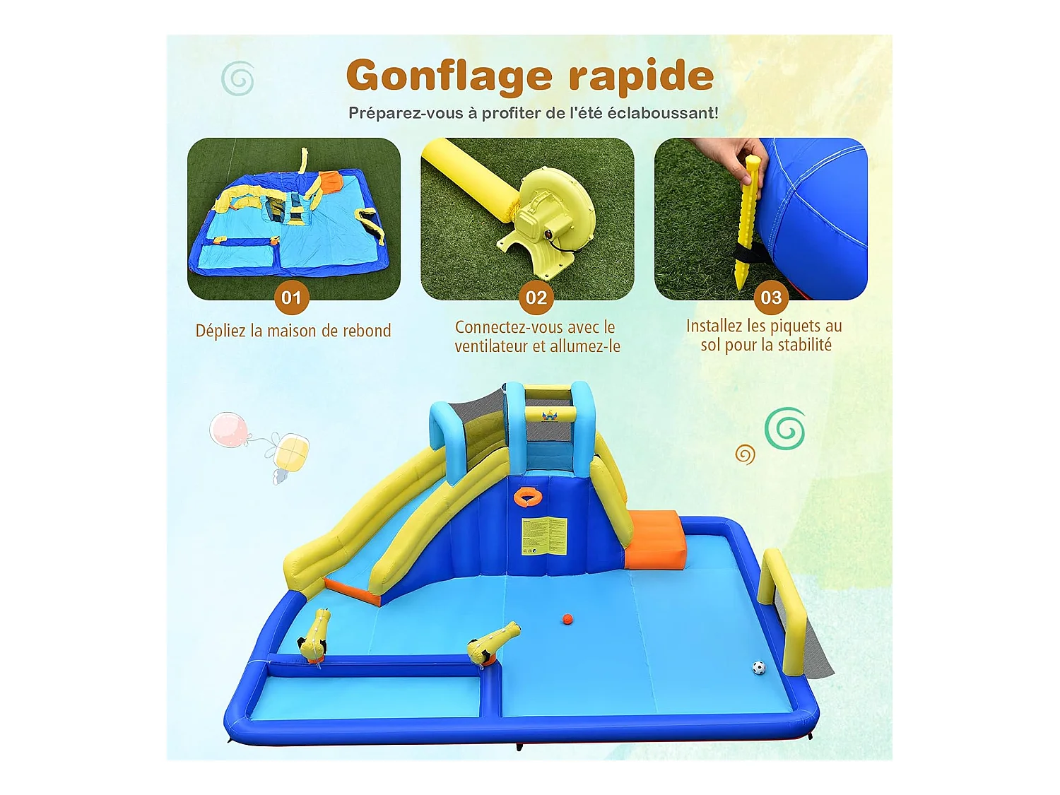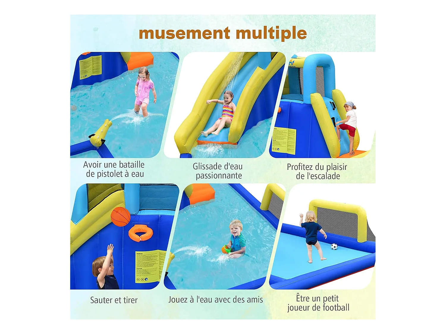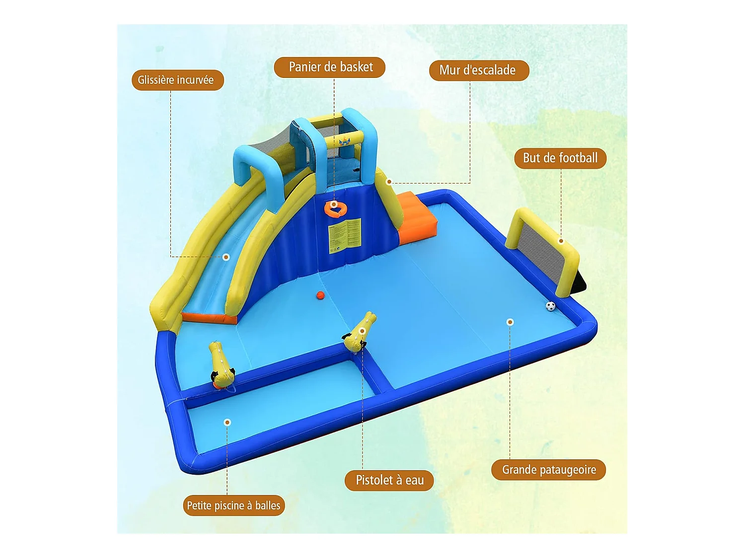 6 en 1 Château Gonflable Aquatique avec Piscine et Toboggan, Maison de Rebond Gonflable avec Panier de Basket, Mur d’Escalade, Pataugeoire pour Enfants de 3 Ans+