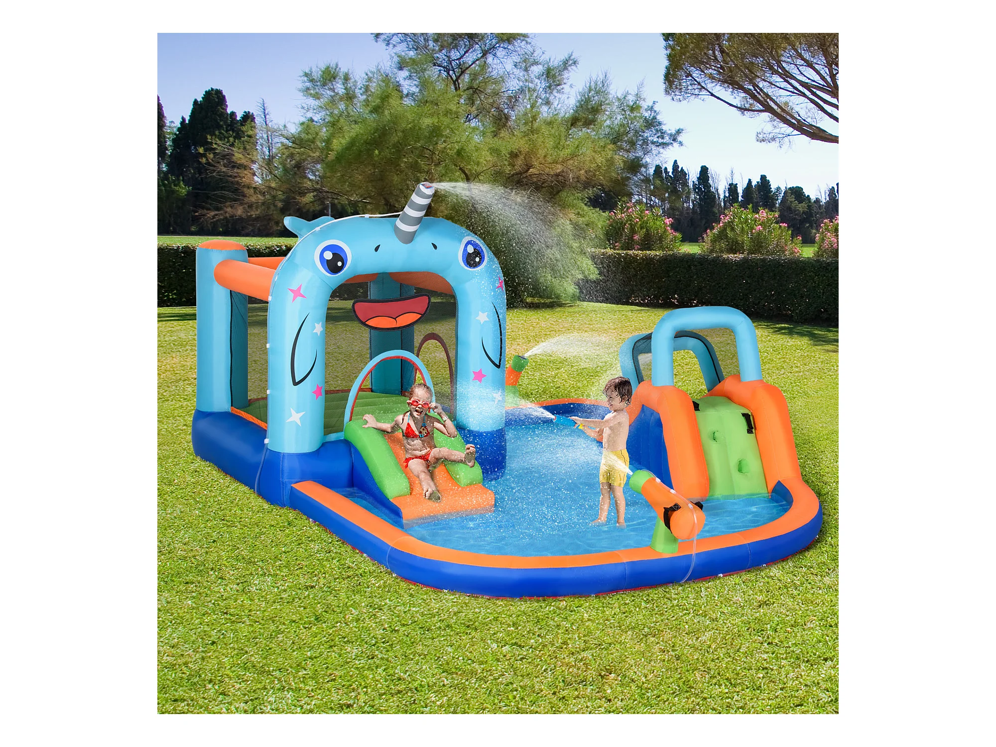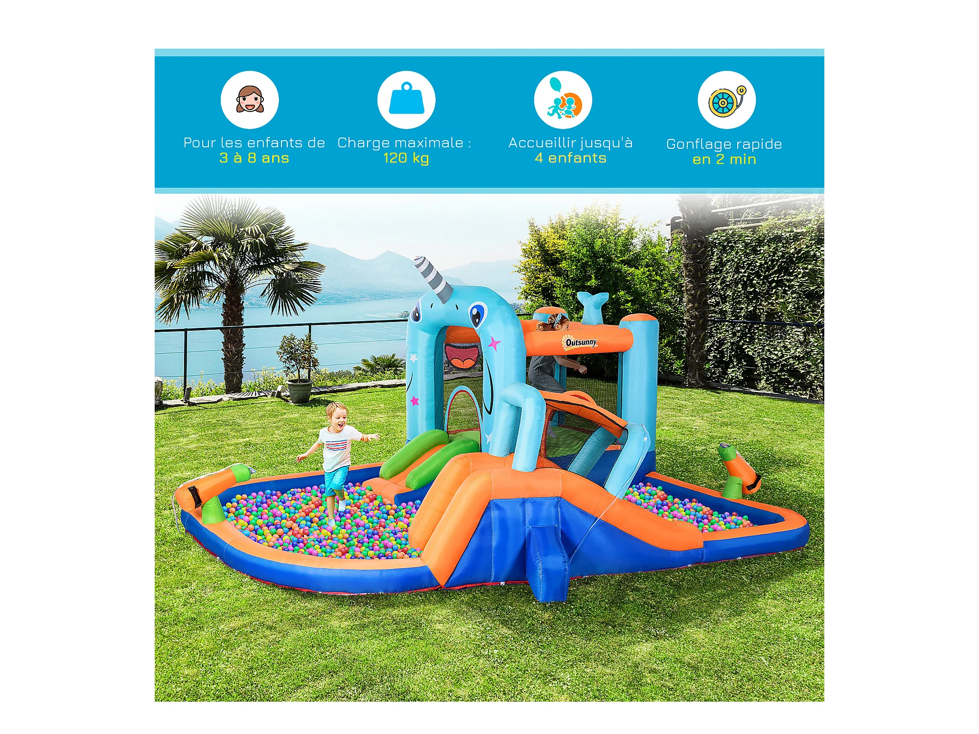 Château gonflable enfant - trampoline, toboggans, piscine, mur d'escalade, panier, pistolets eau, gonfleur, sac transport - polyester multicolore