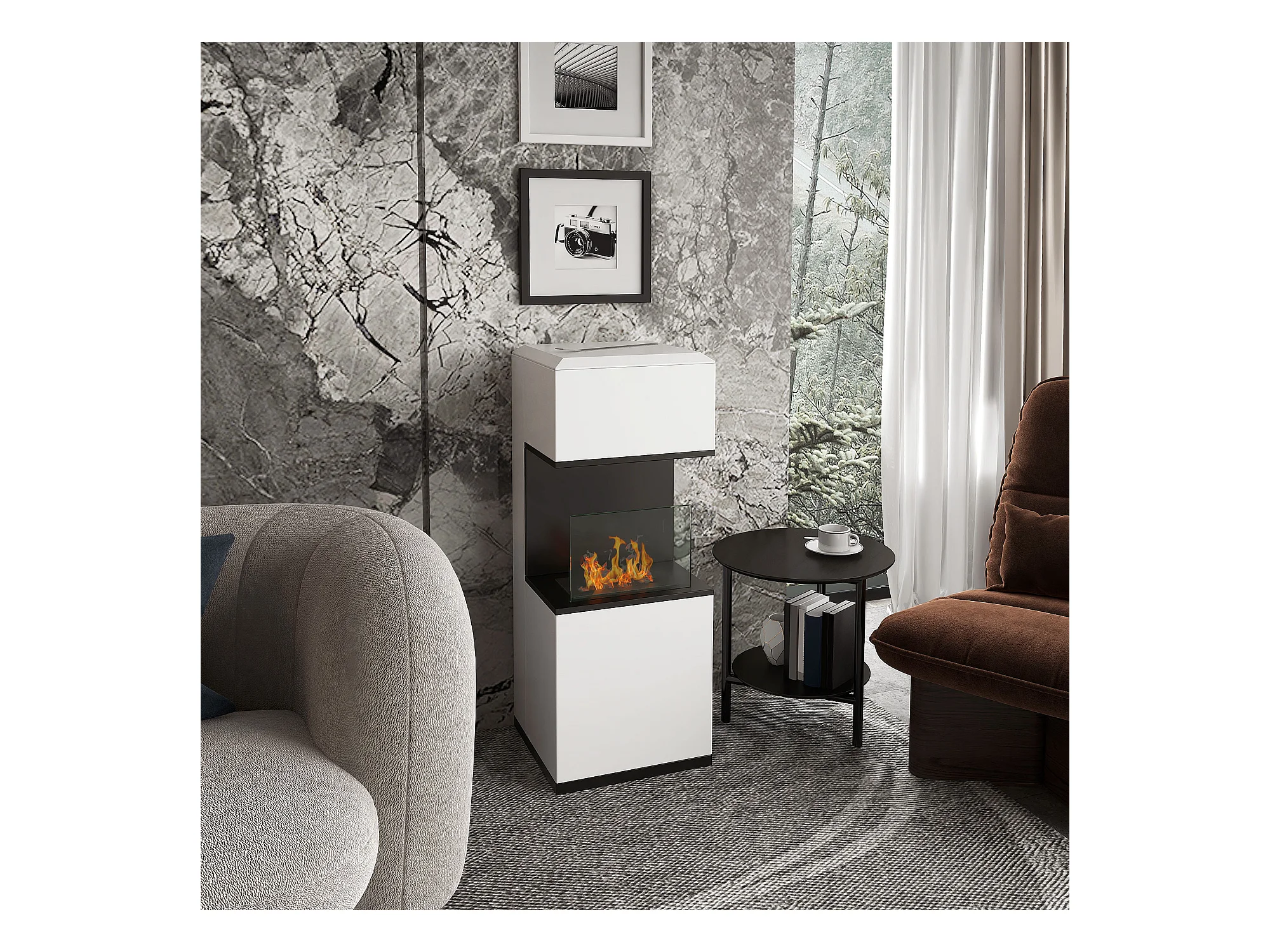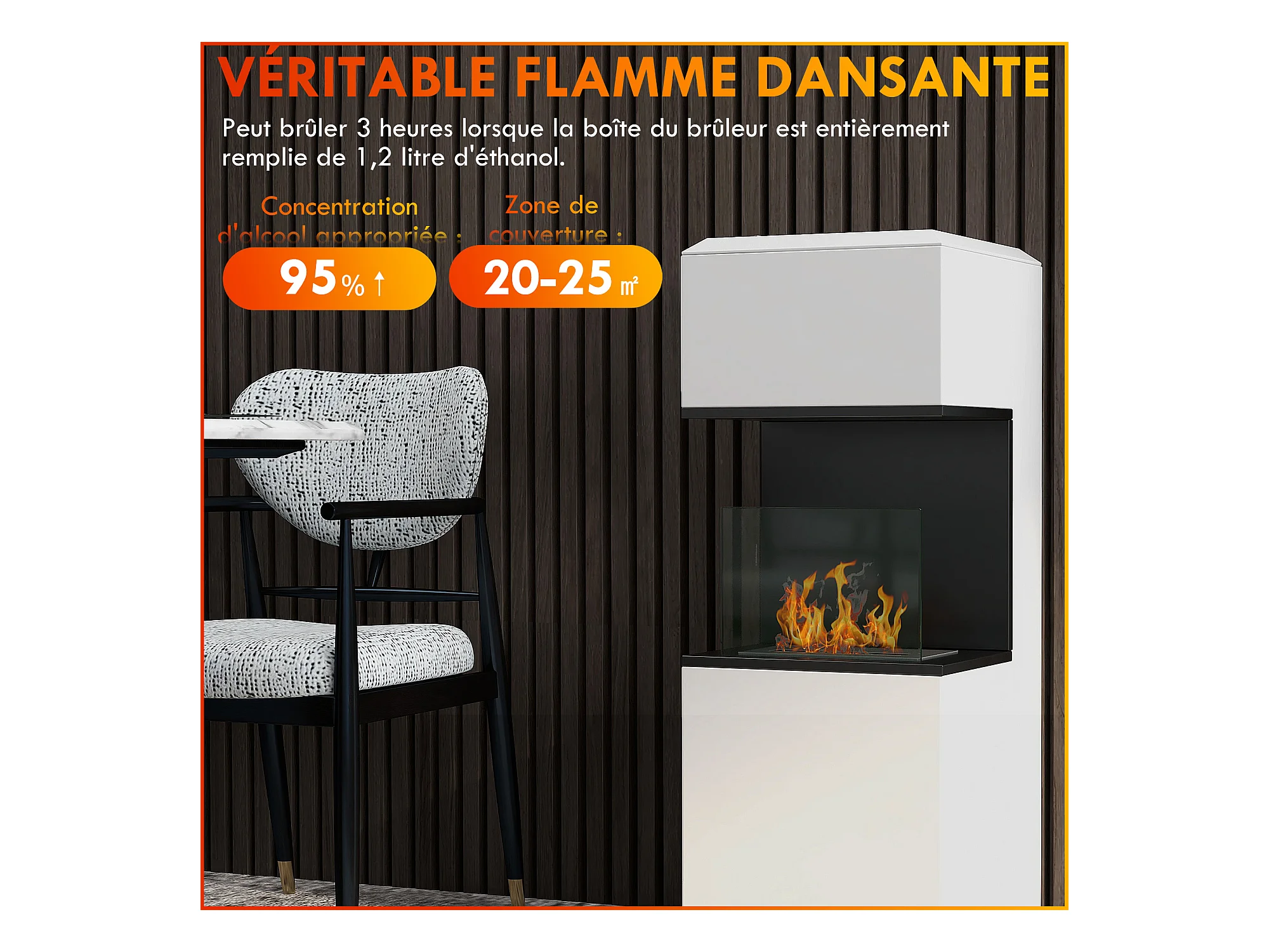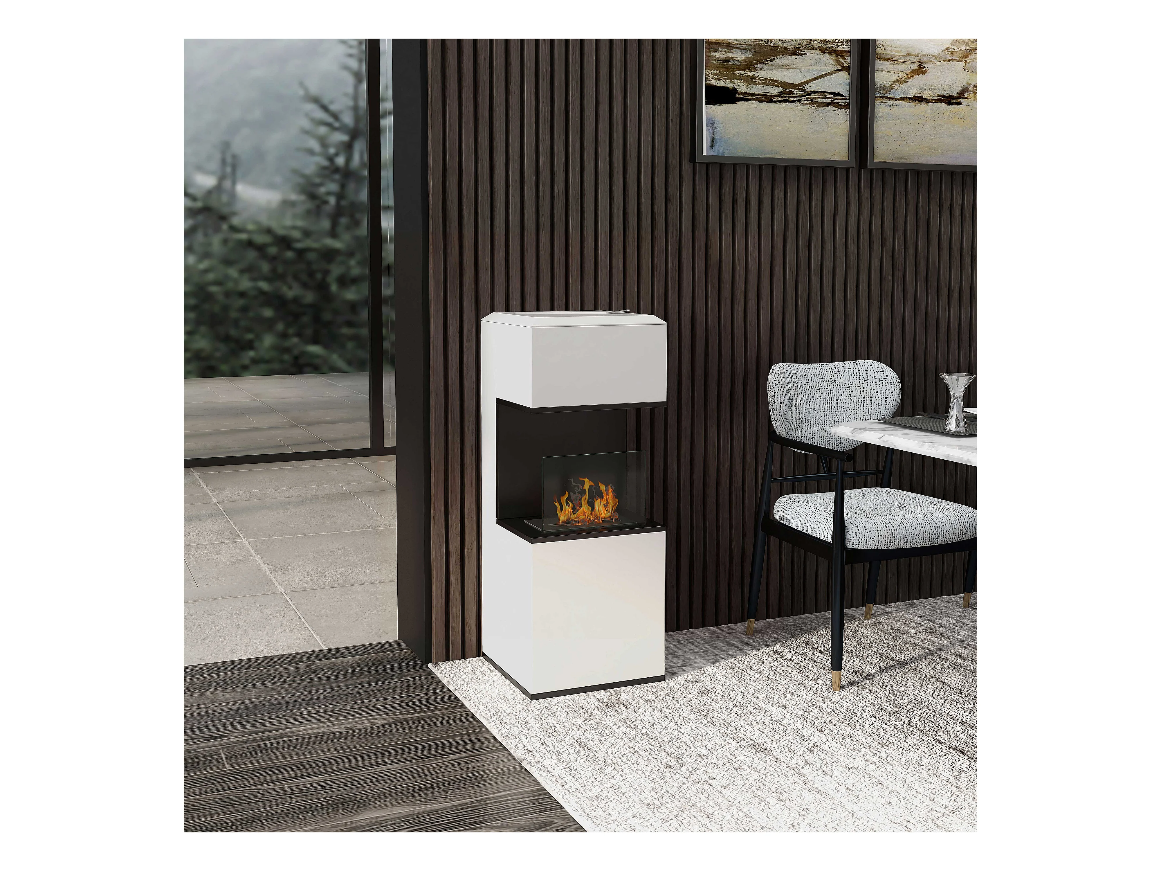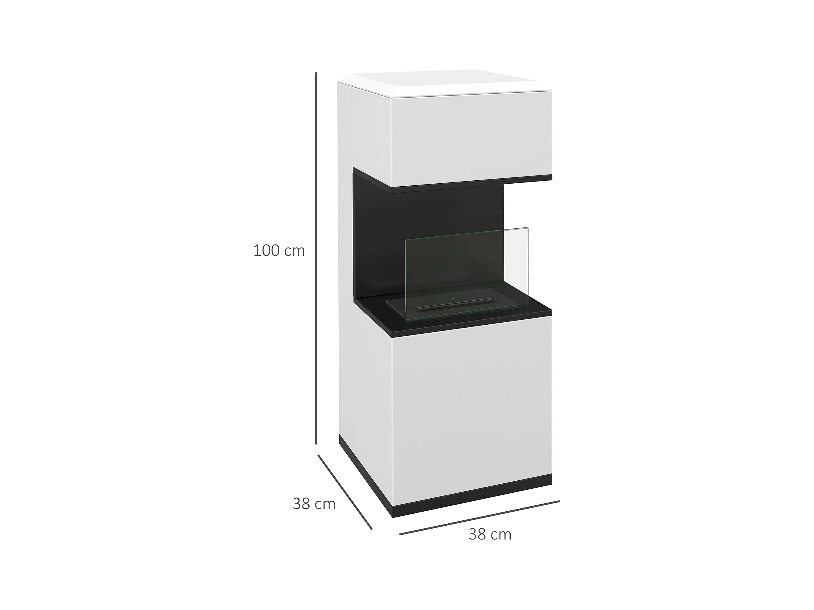Cheminée bioéthanol design - brûleur 1,2L - contrôle de flamme, manche inclus - verre trempé acier blanc noir