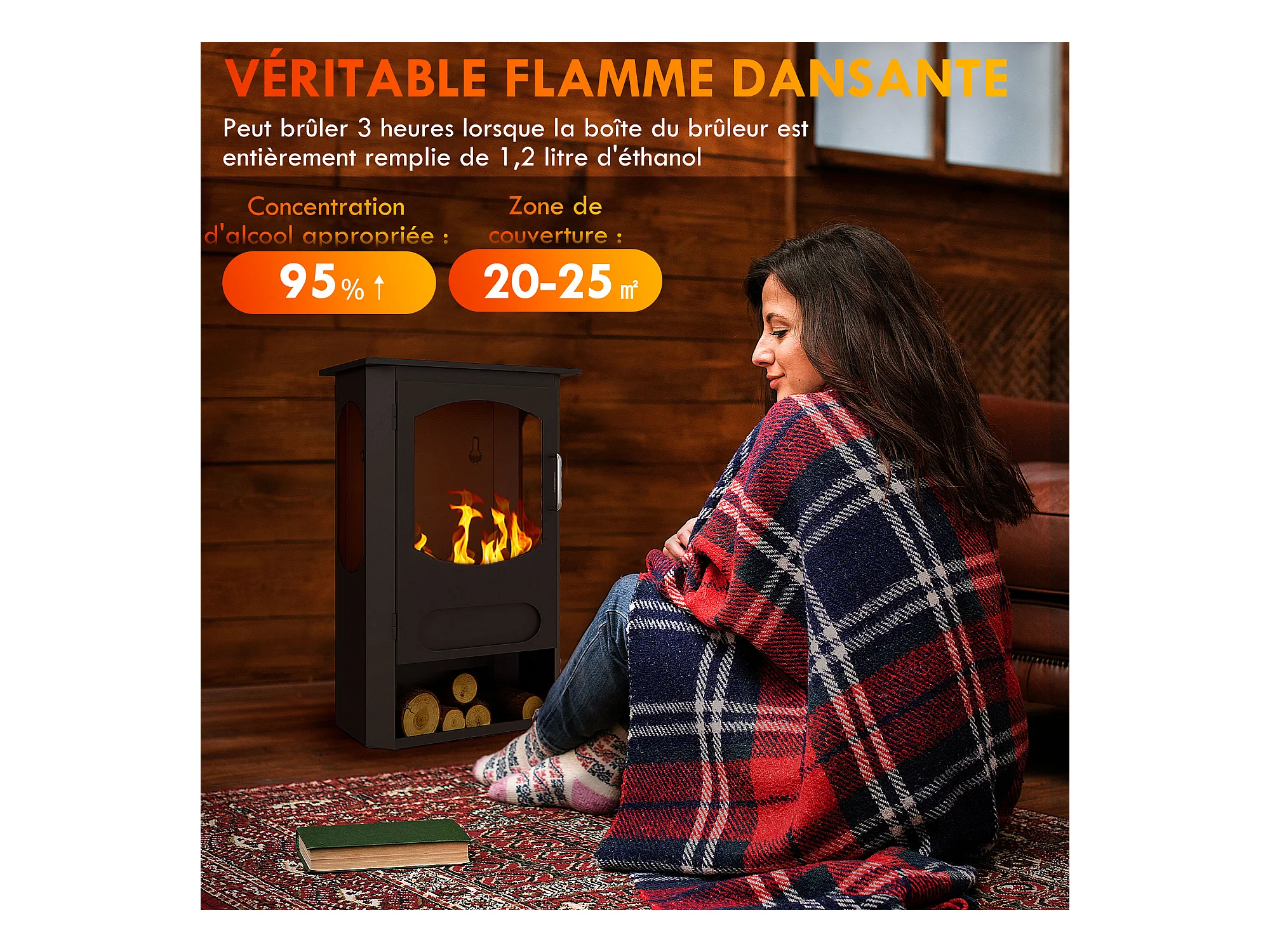 Cheminée bioéthanol sur pied style néo-rétro poêle 1 brûleur 1,2 L dim. 45L x 28l x 54H cm couverture 20-25 m² acier noir