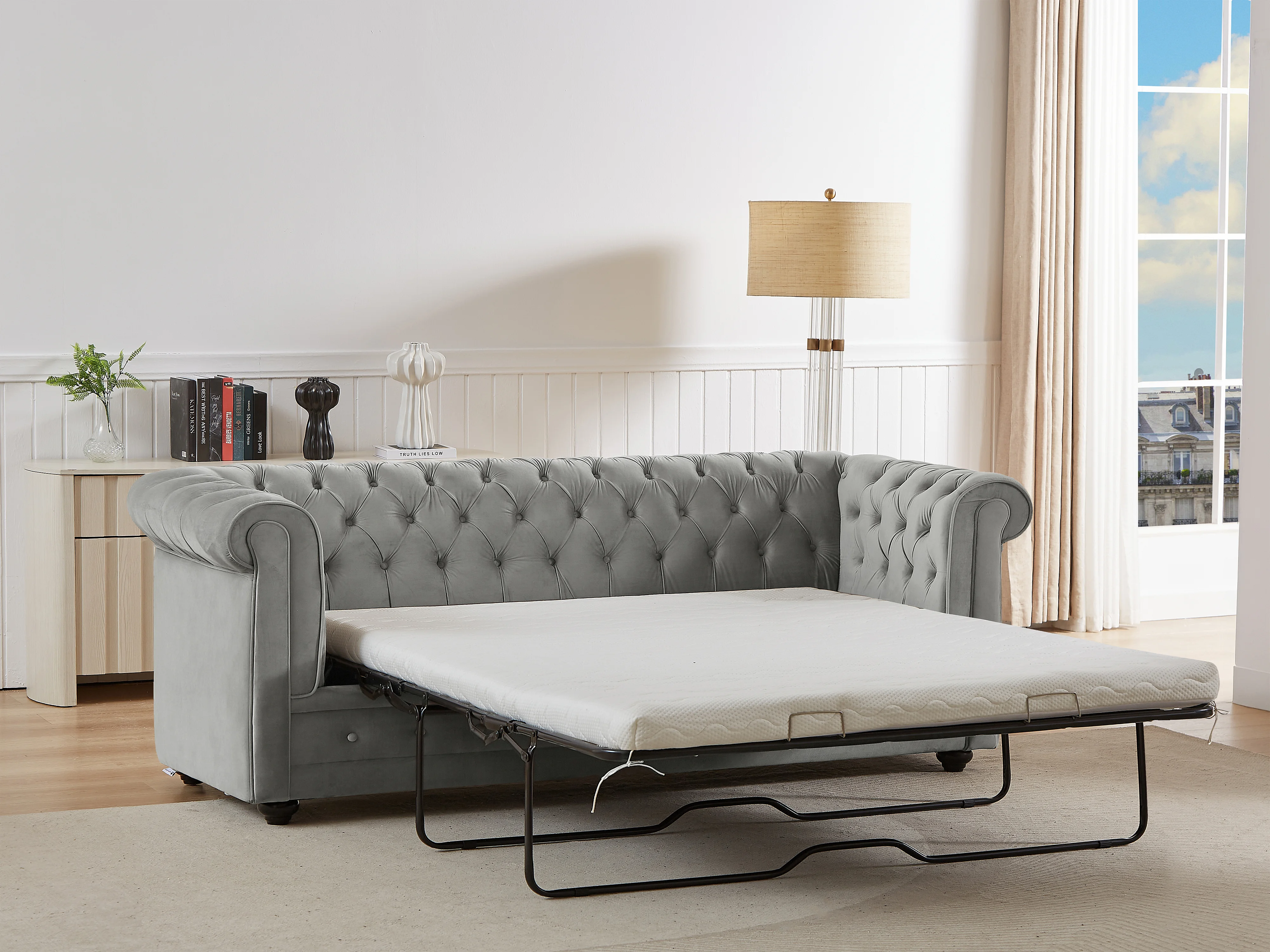 Canapé 3 places convertible en velours gris clair CHESTERFIELD
