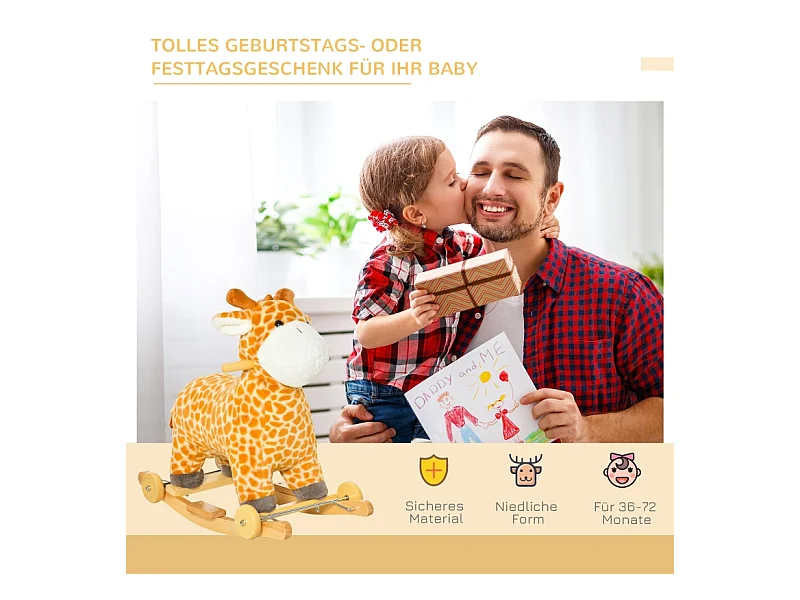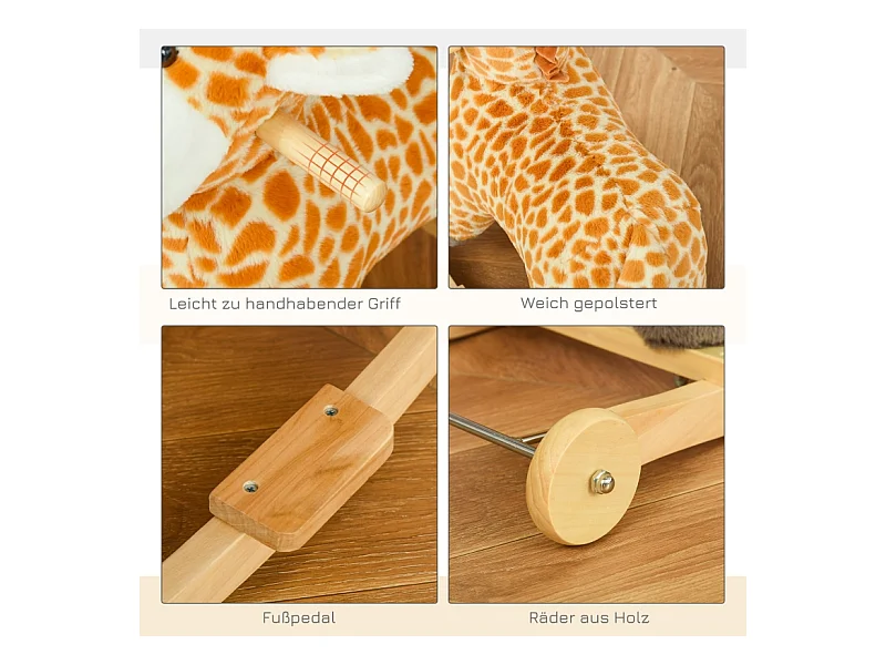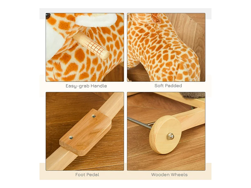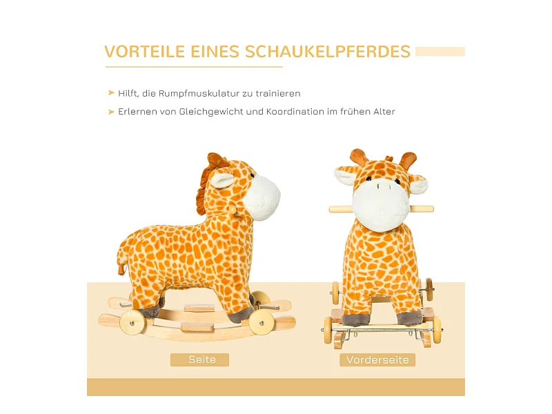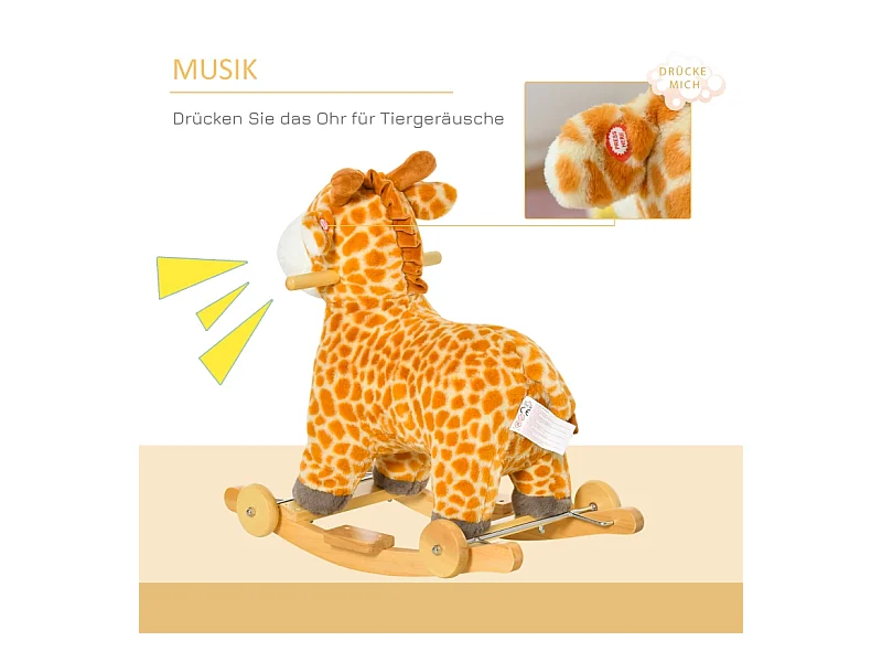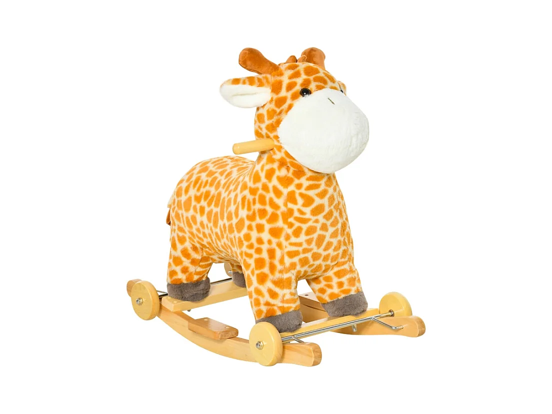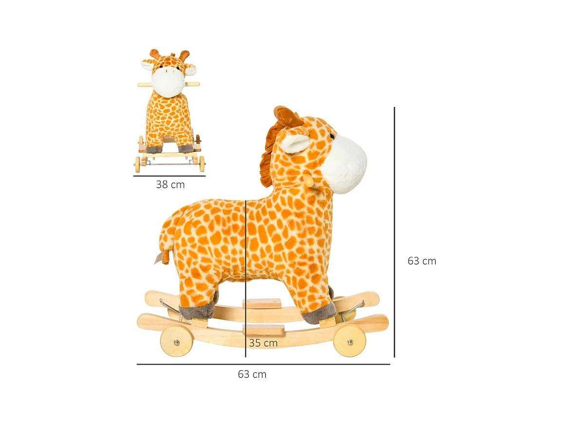 Cheval à bascule 2-en-1 girafe avec effets sonores, roues et poignées, peluche, pour enfants 3-6 ans, métal, jaune (63x38x63cm)