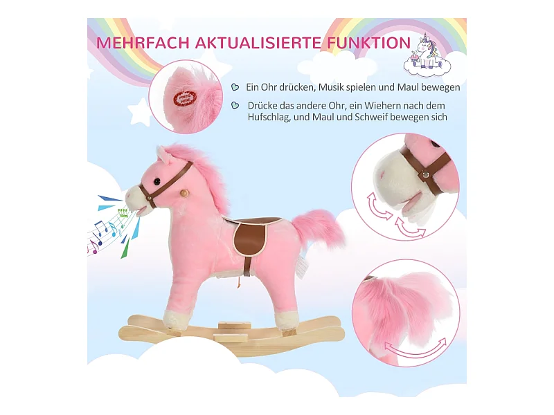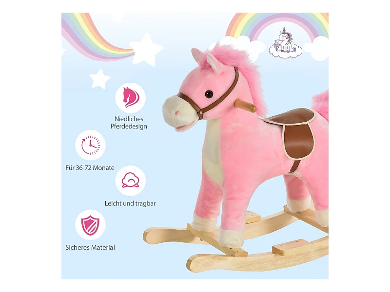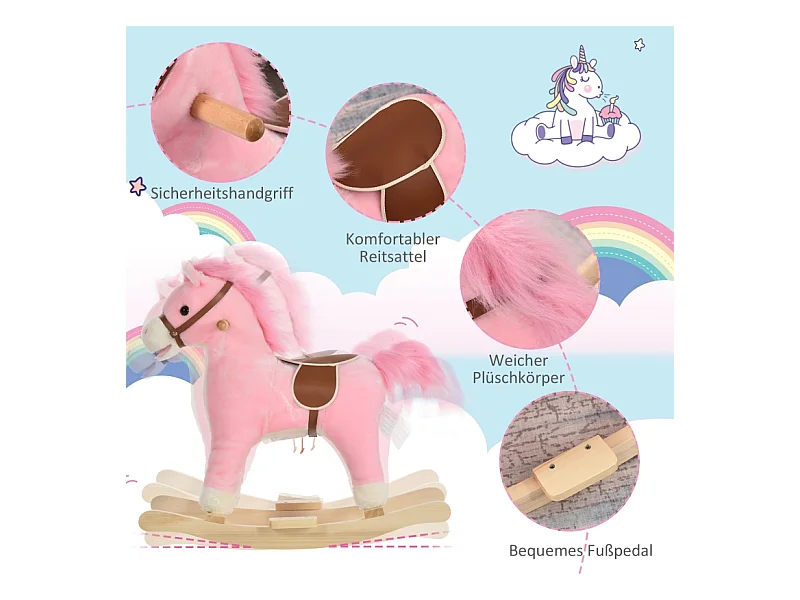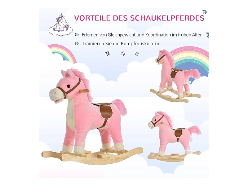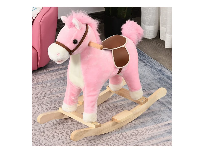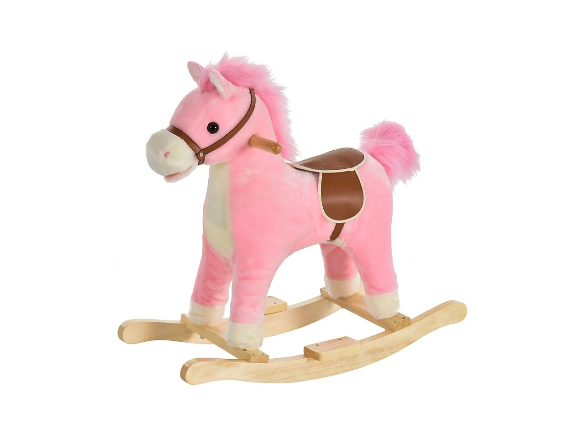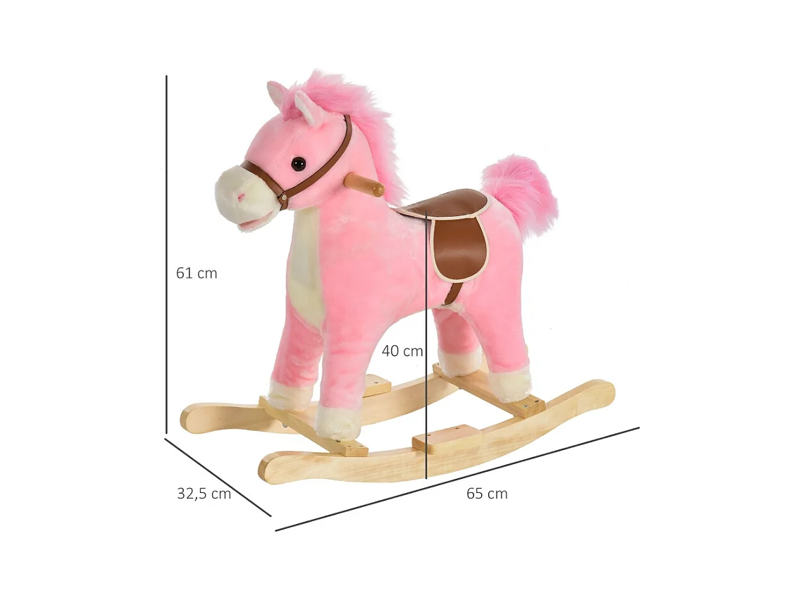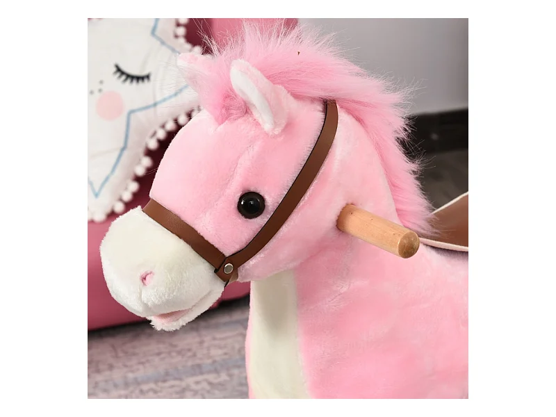 Cheval à bascule en peluche rose avec sons d'animaux, acier, pour enfants (65x32.5x61cm)