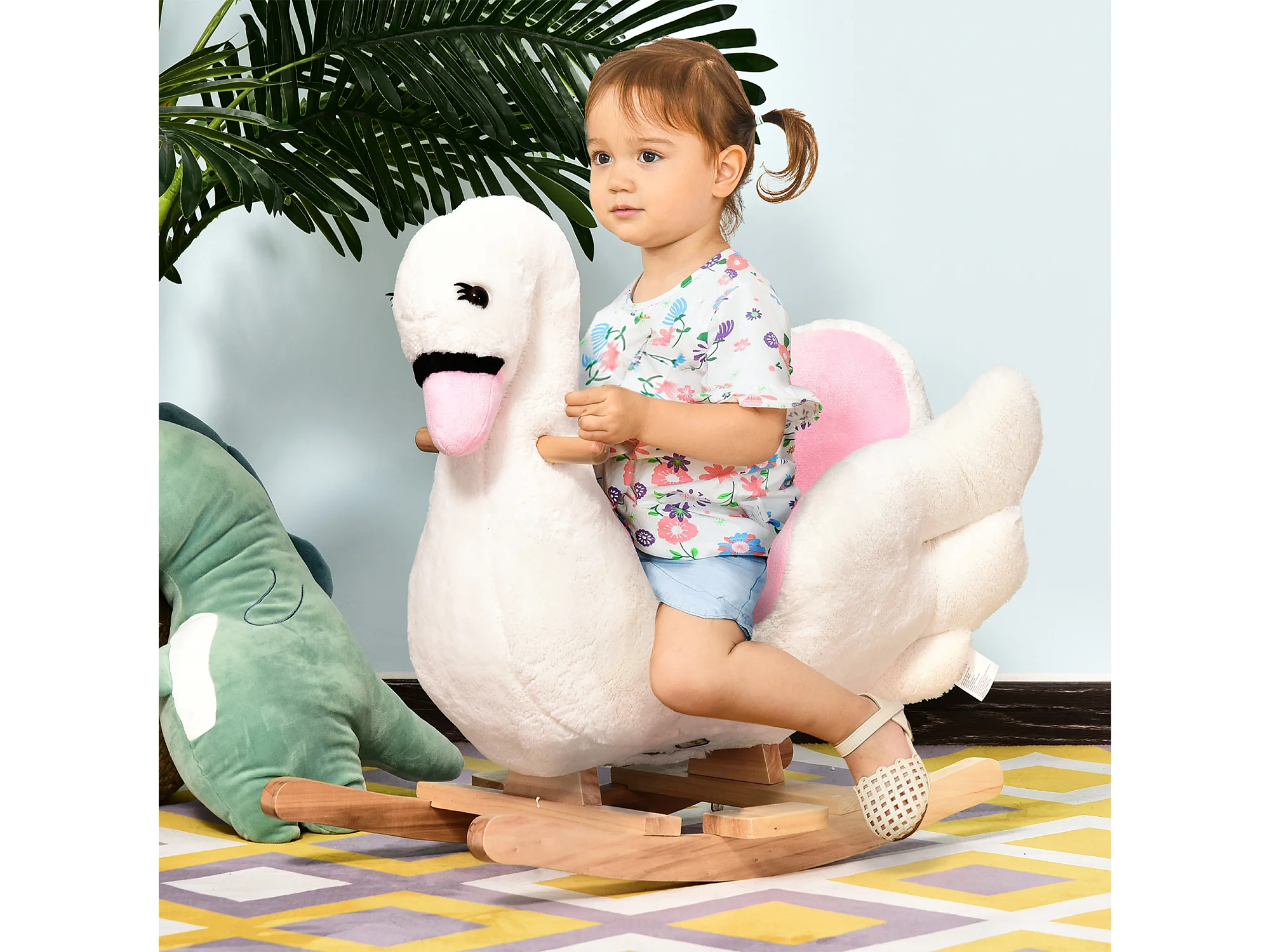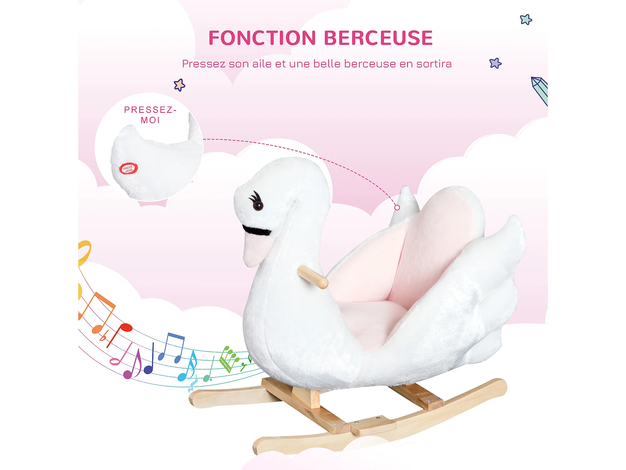 Cheval à bascule modèle cygne fonction musicale assise enveloppante cale-pieds bois peluche douce blanc rose