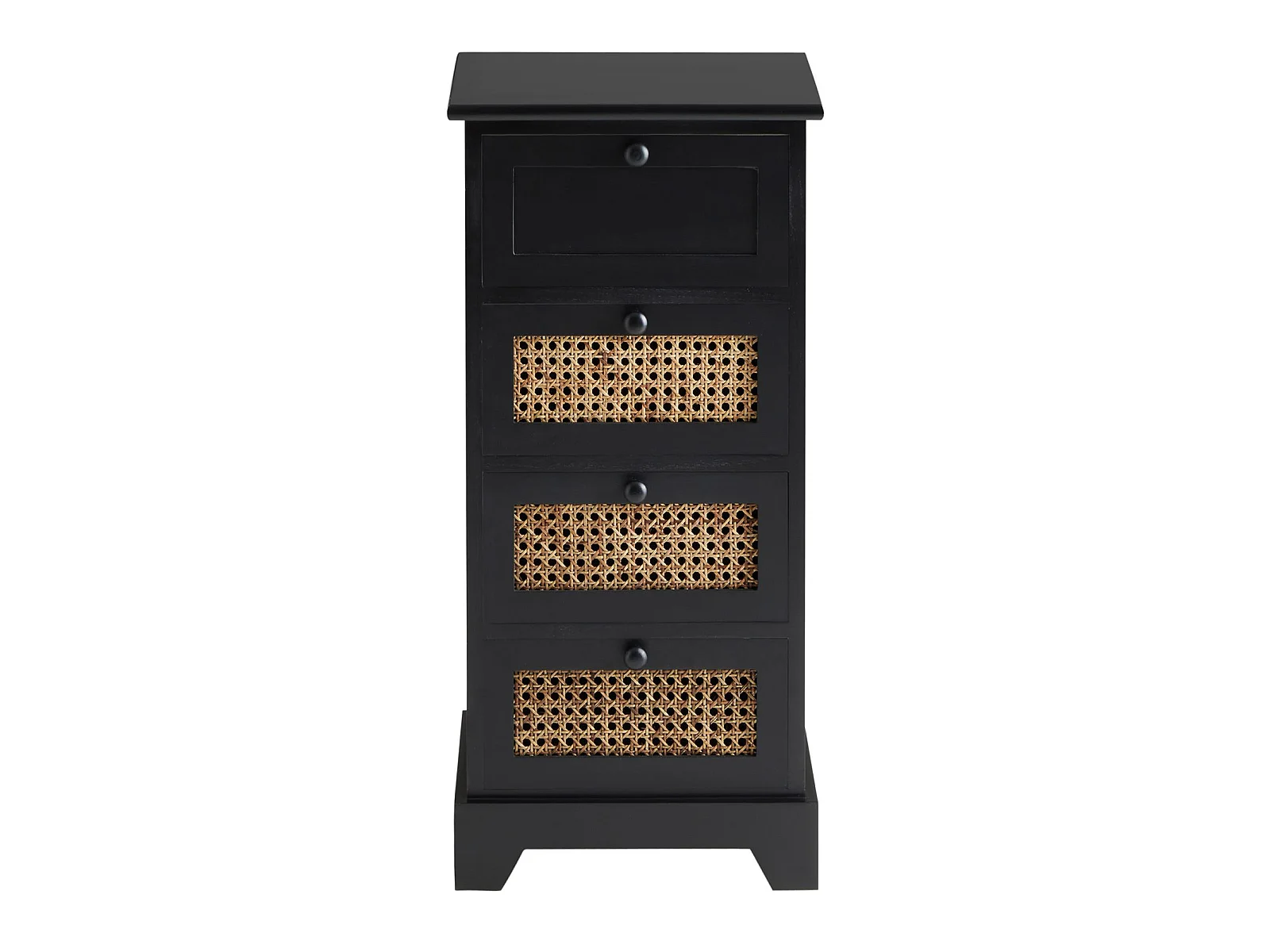 Chiffonnier JASMIN petite commode avec 4 tiroirs, style vintage bohême, en bois de paulownia lasuré noir et rotin