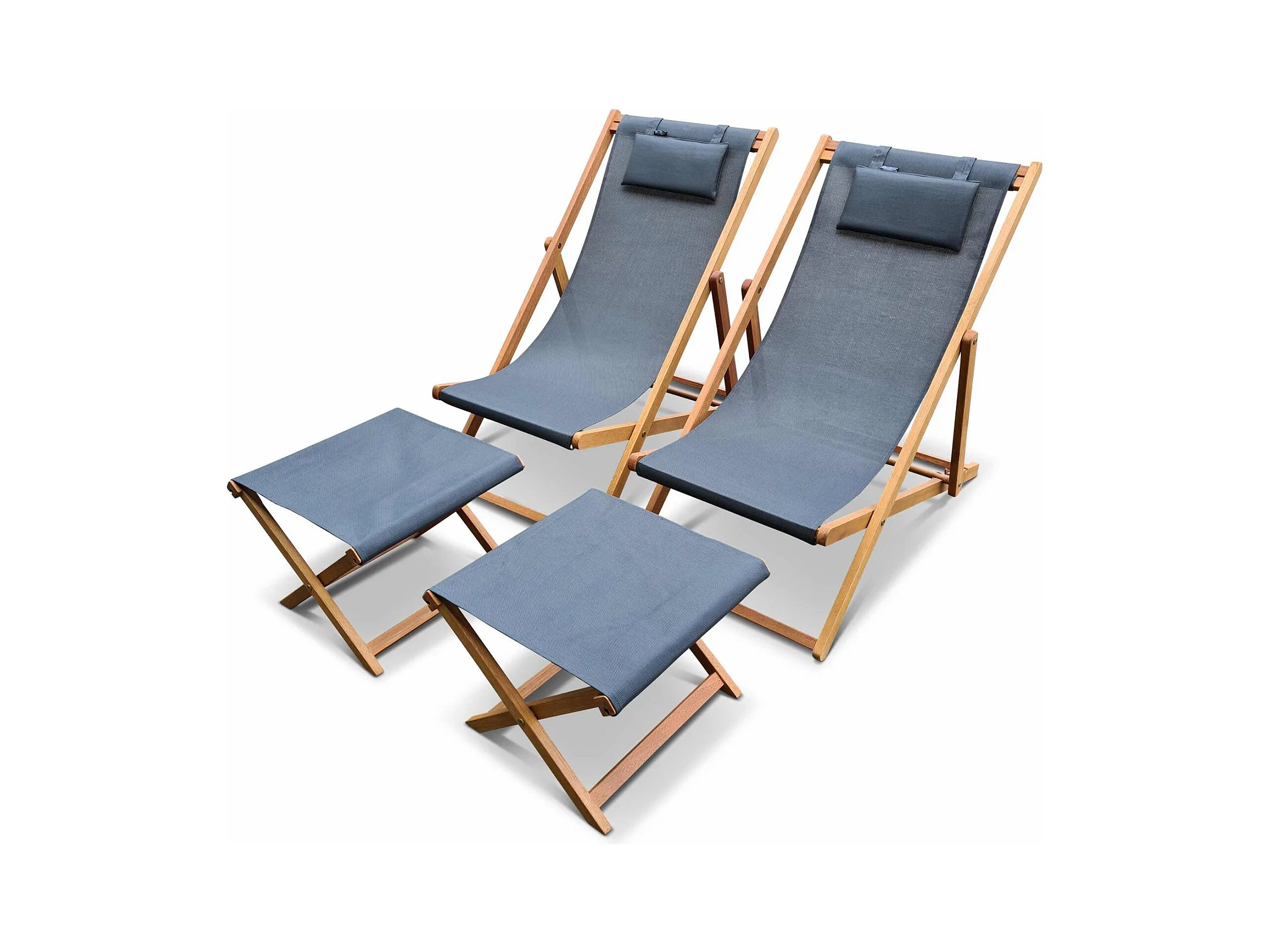 Chiliennes bois - Creus - 2 transats en bois d'Eucalyptus huilé avec coussin repose-tête gris et repose-pieds