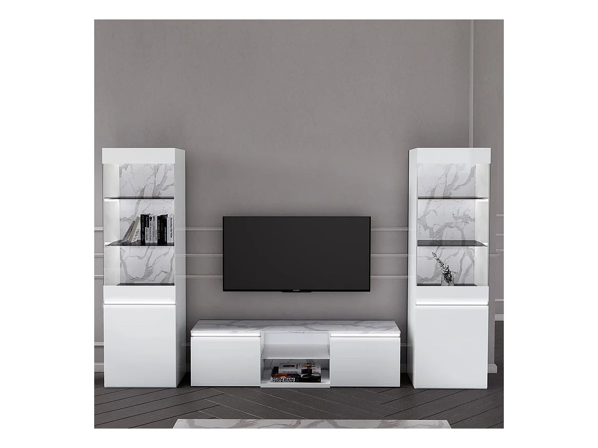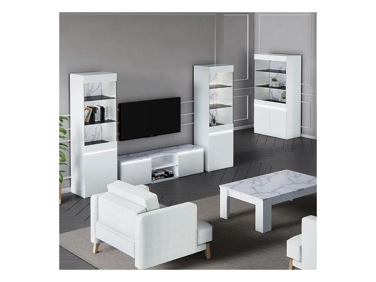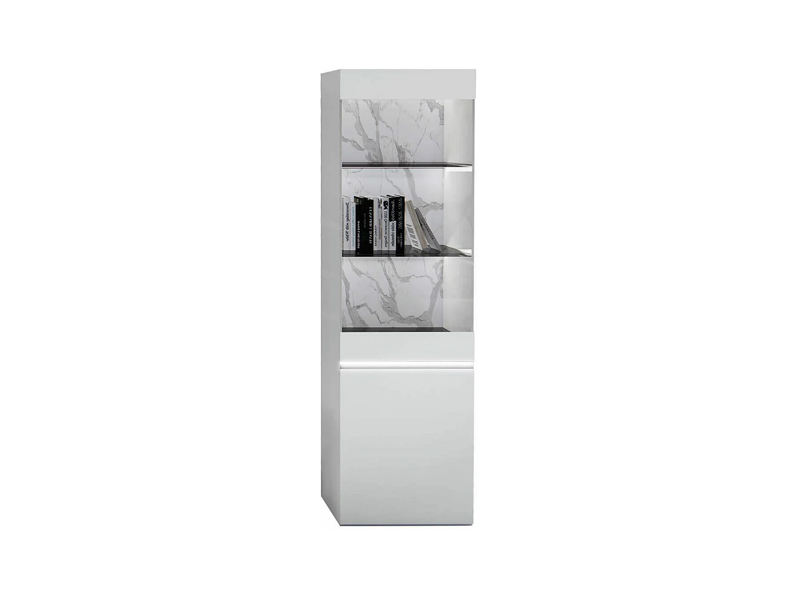 CHRIS WHITE - Vitrine 1 Porte Laquée Blanc Brillant Fond Imitation Marbre avec Led