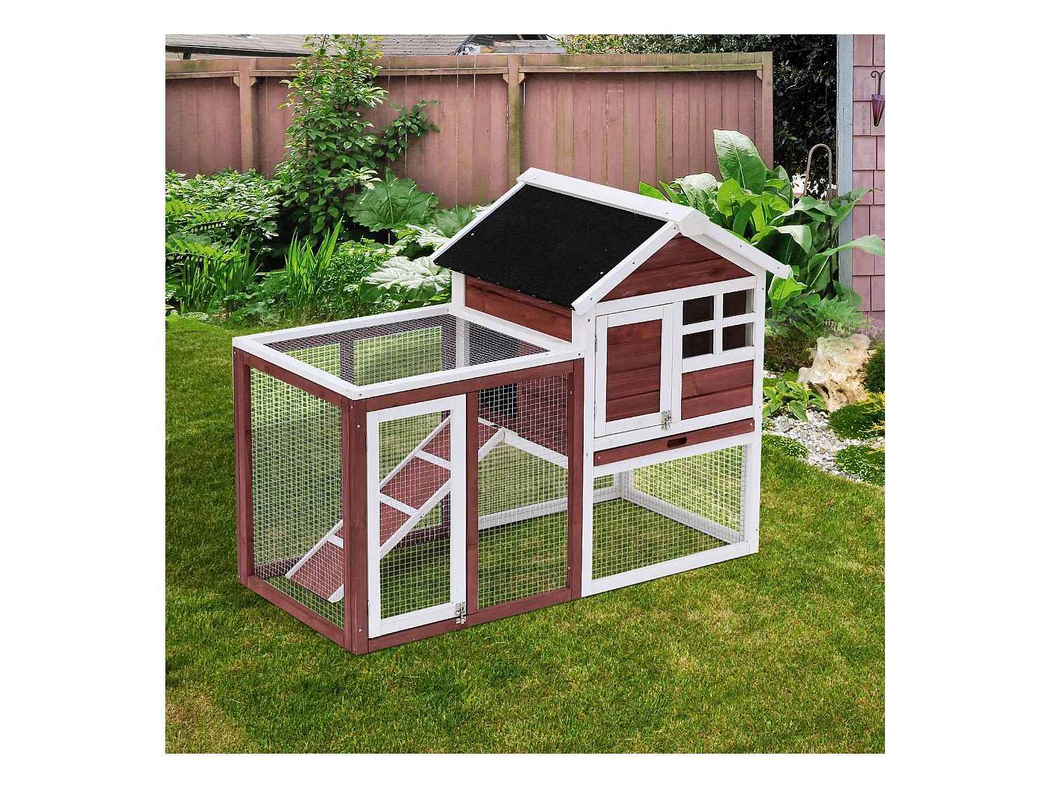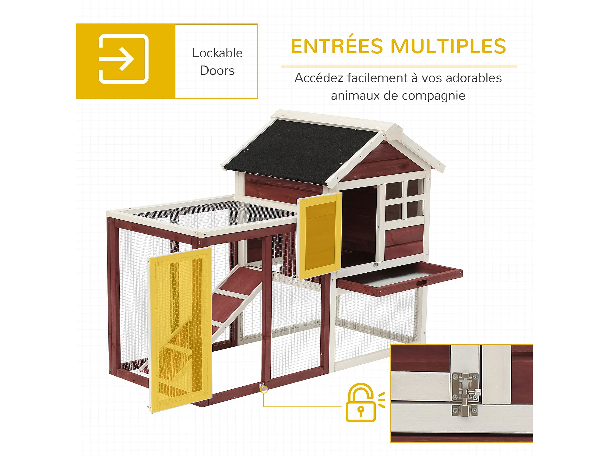 Clapier cage à lapins multi-équipé : niche supérieure avec rampe, plateau excrément, fenêtre + enclos extérieur sécurisé 2 portes 122L x 63l x 92H cm rouge brique