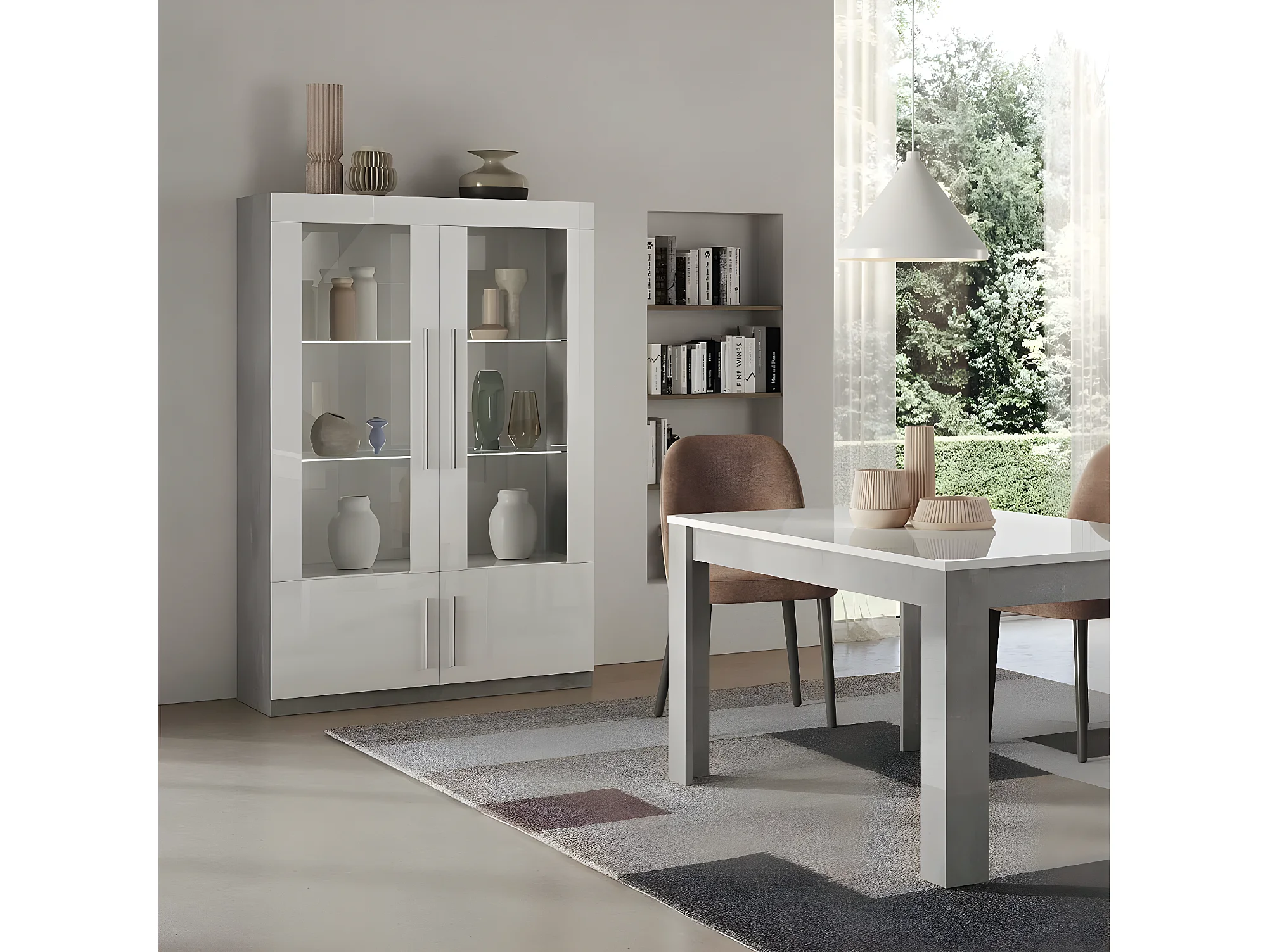 CLARK - Ensemble Séjour Blanc et Marbre Table 160cm + Vitrine 4 Portes avec Leds