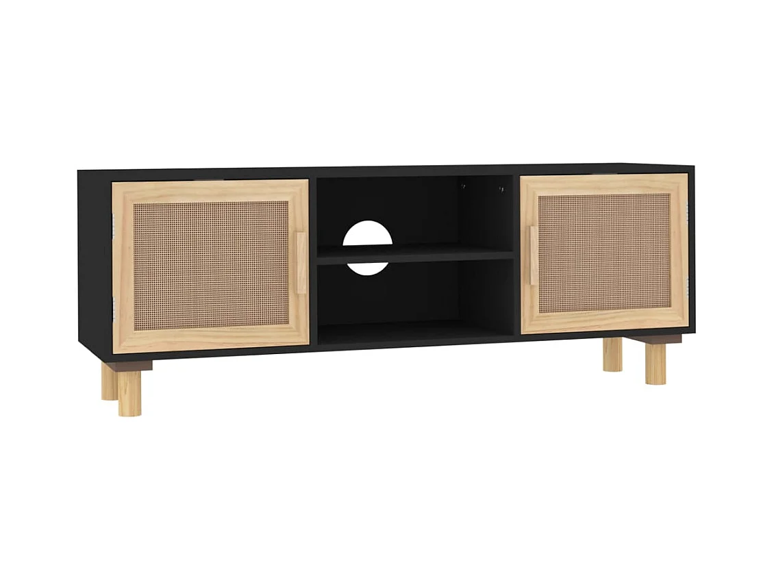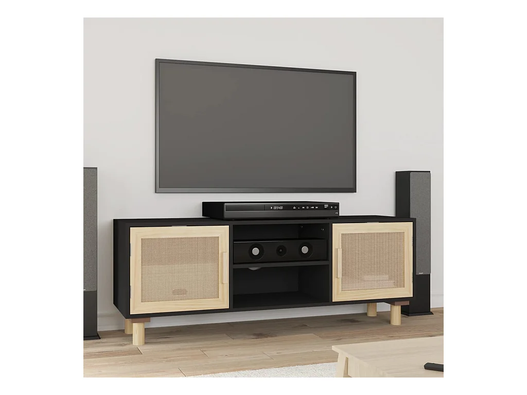 Claudia Meuble TV Noir 105x30x40cm Bois de pin massif et rotin l