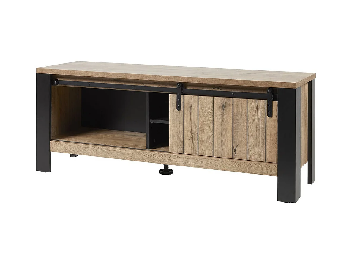 CLODIUS - Meuble TV 1 Porte Coulissante 2 Niches Métal et Aspect Bois