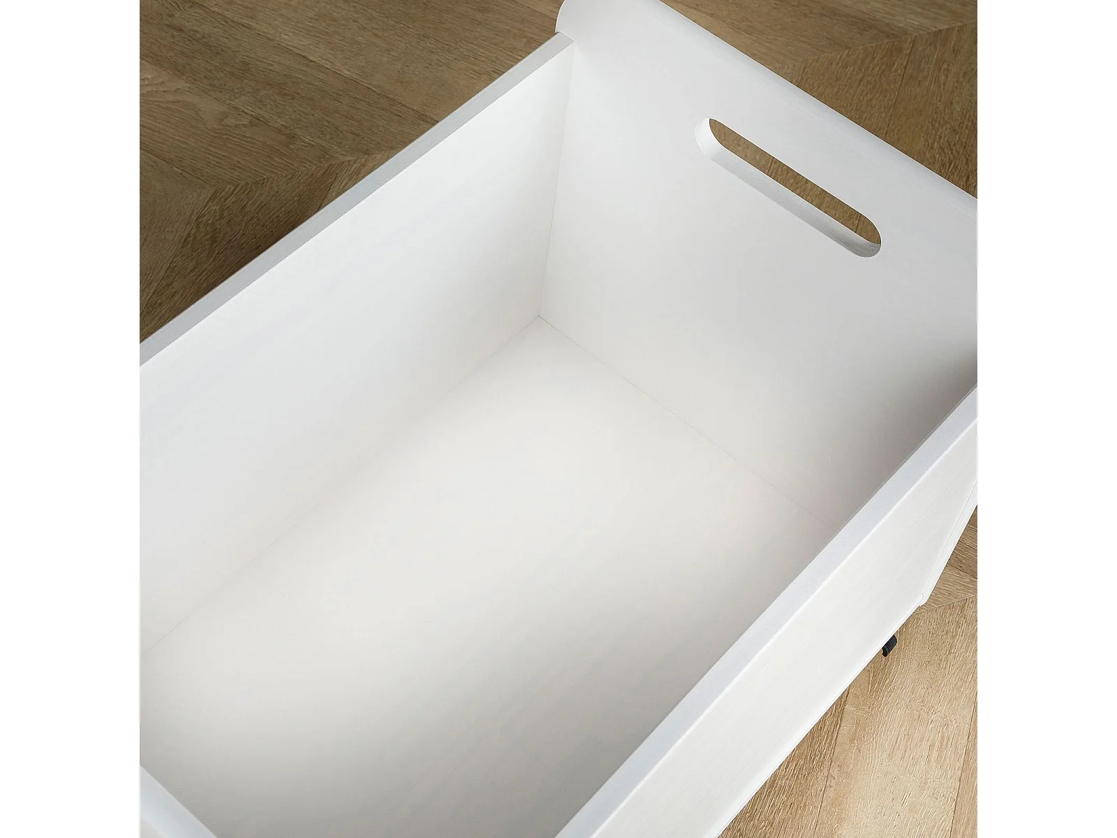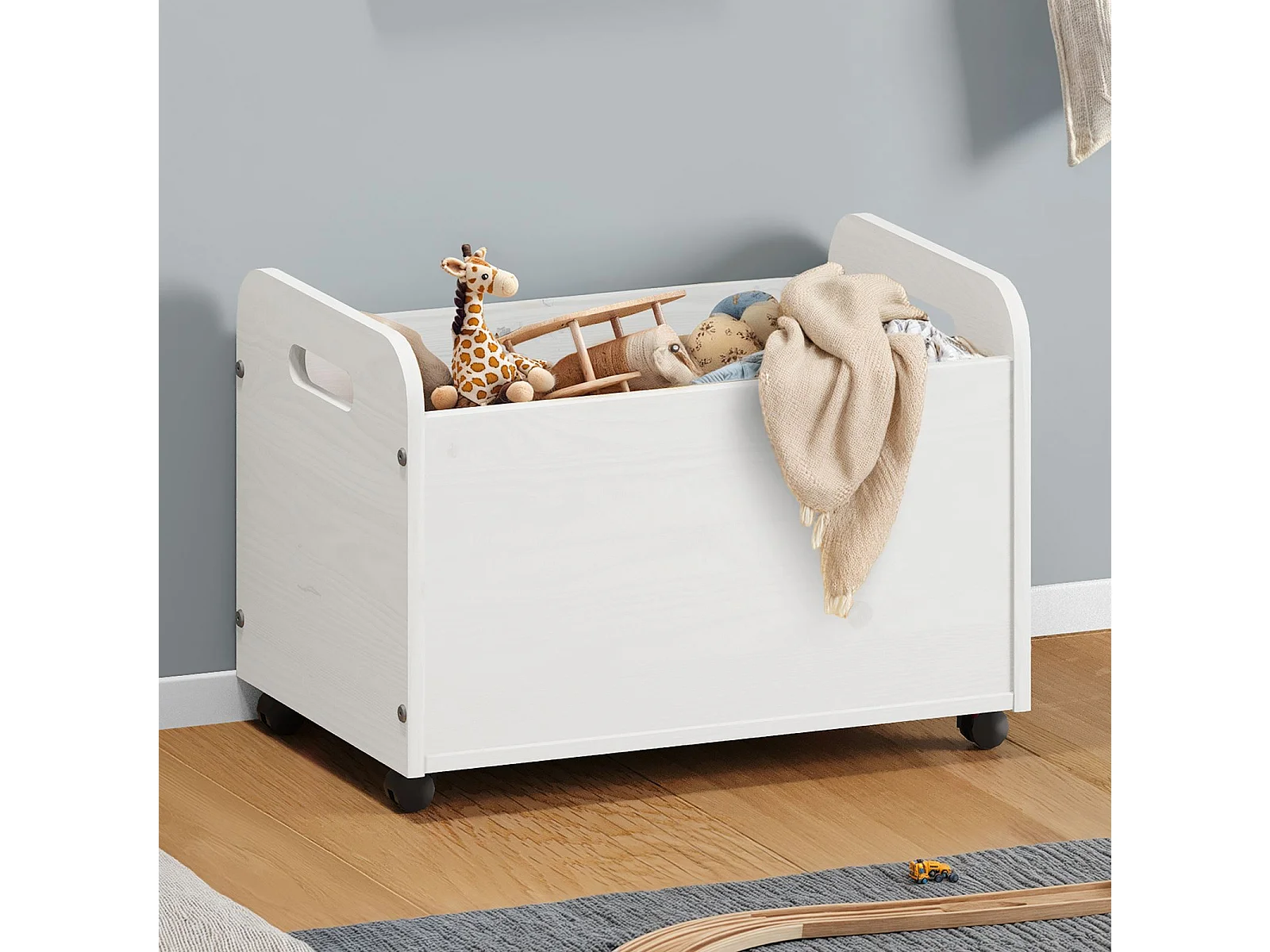 Coffre à jouets BENJAMIN sur roulettes 60 x 43 x 40 cm en bois pour chambre d'enfant, Rangement Montessori jouets et peluches, Blanc