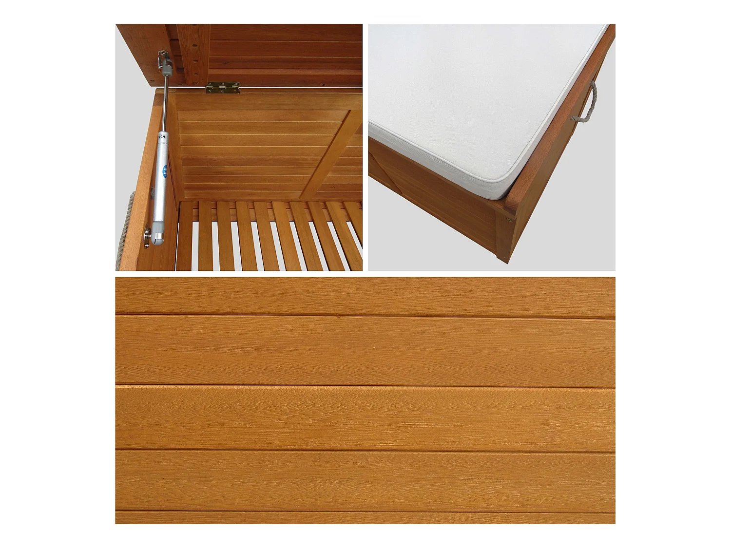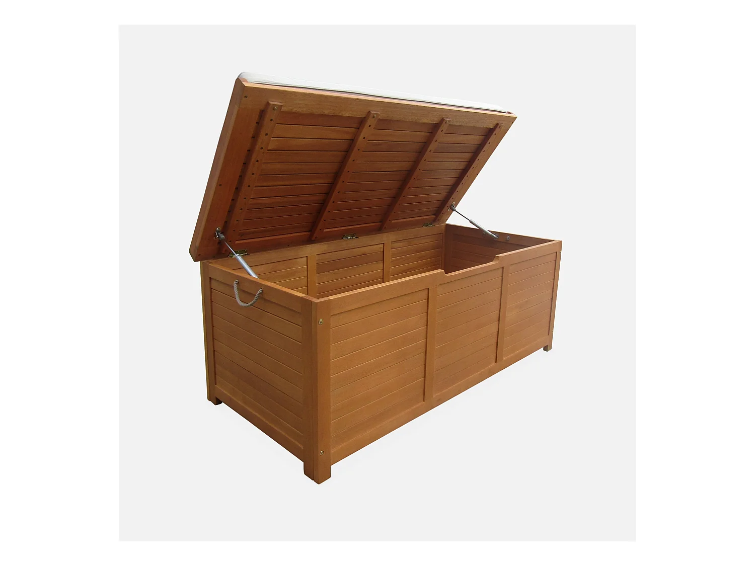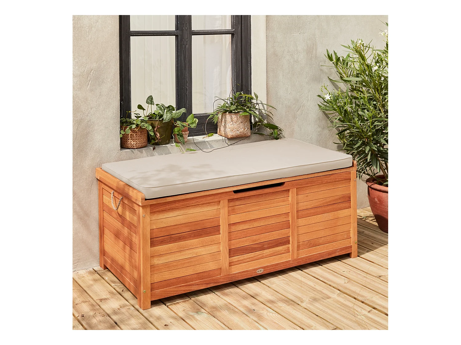 Coffre de jardin 200L en bois - Caja beige - 125x60cm rangement coussins avec 2 vérins et poignées