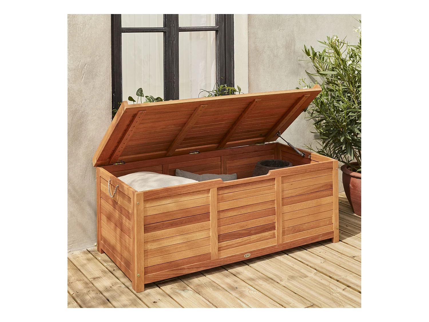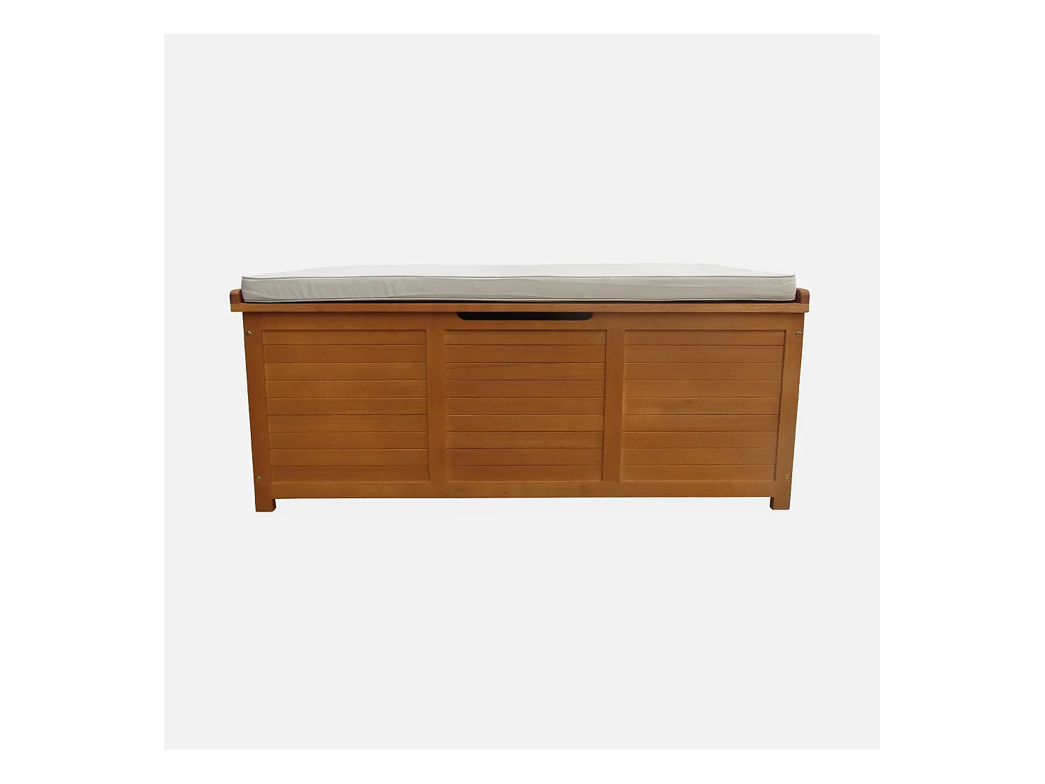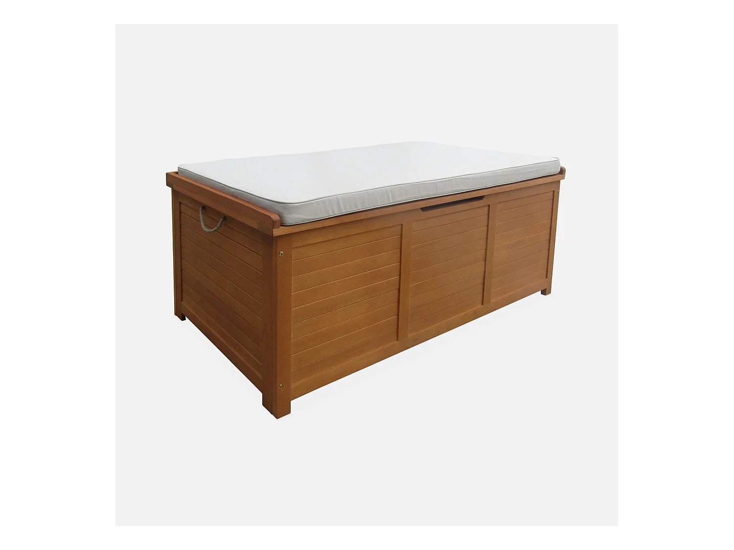 Coffre de jardin 200L en bois - Caja beige - 125x60cm rangement coussins avec 2 vérins et poignées