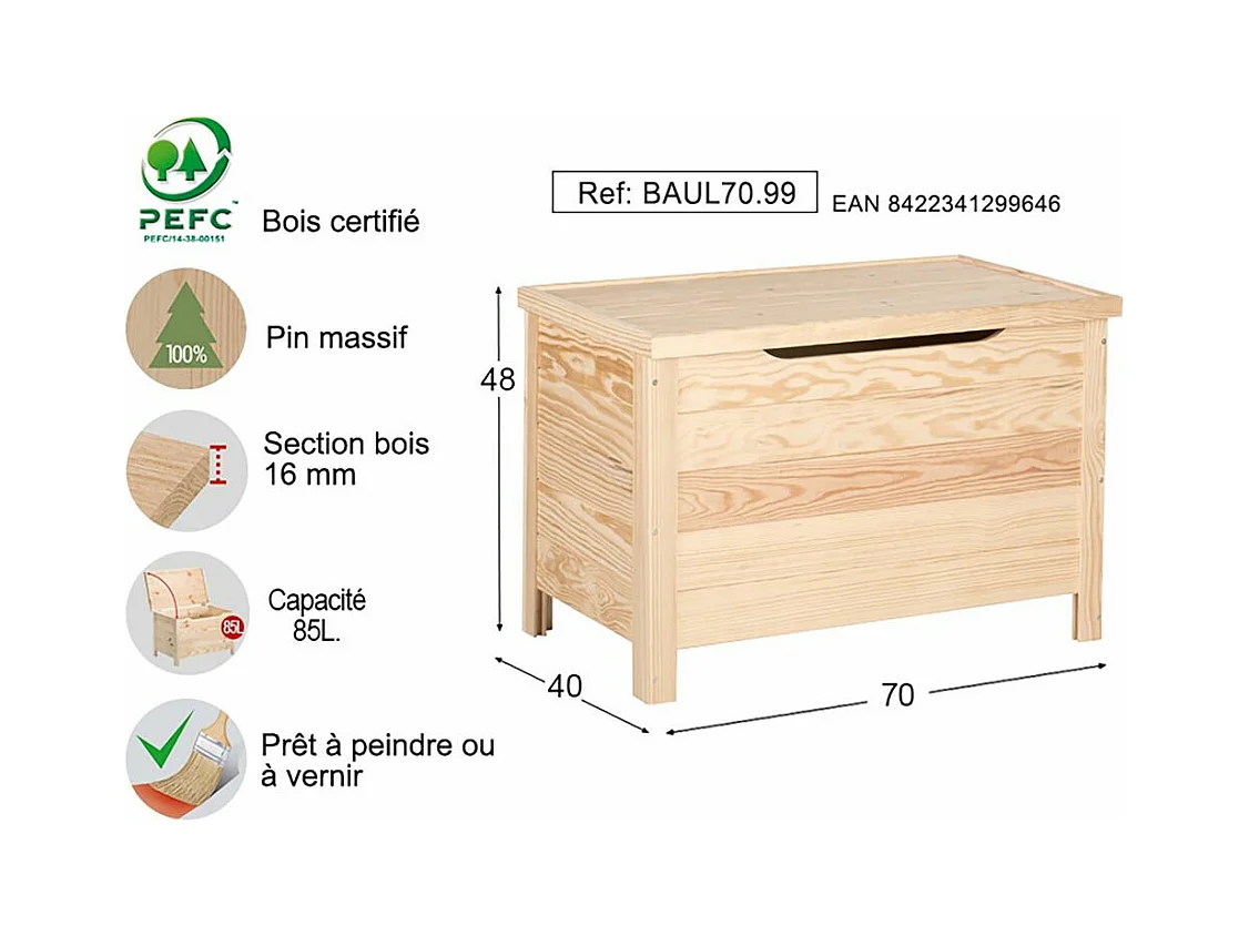Coffre de rangement en pin 85L
