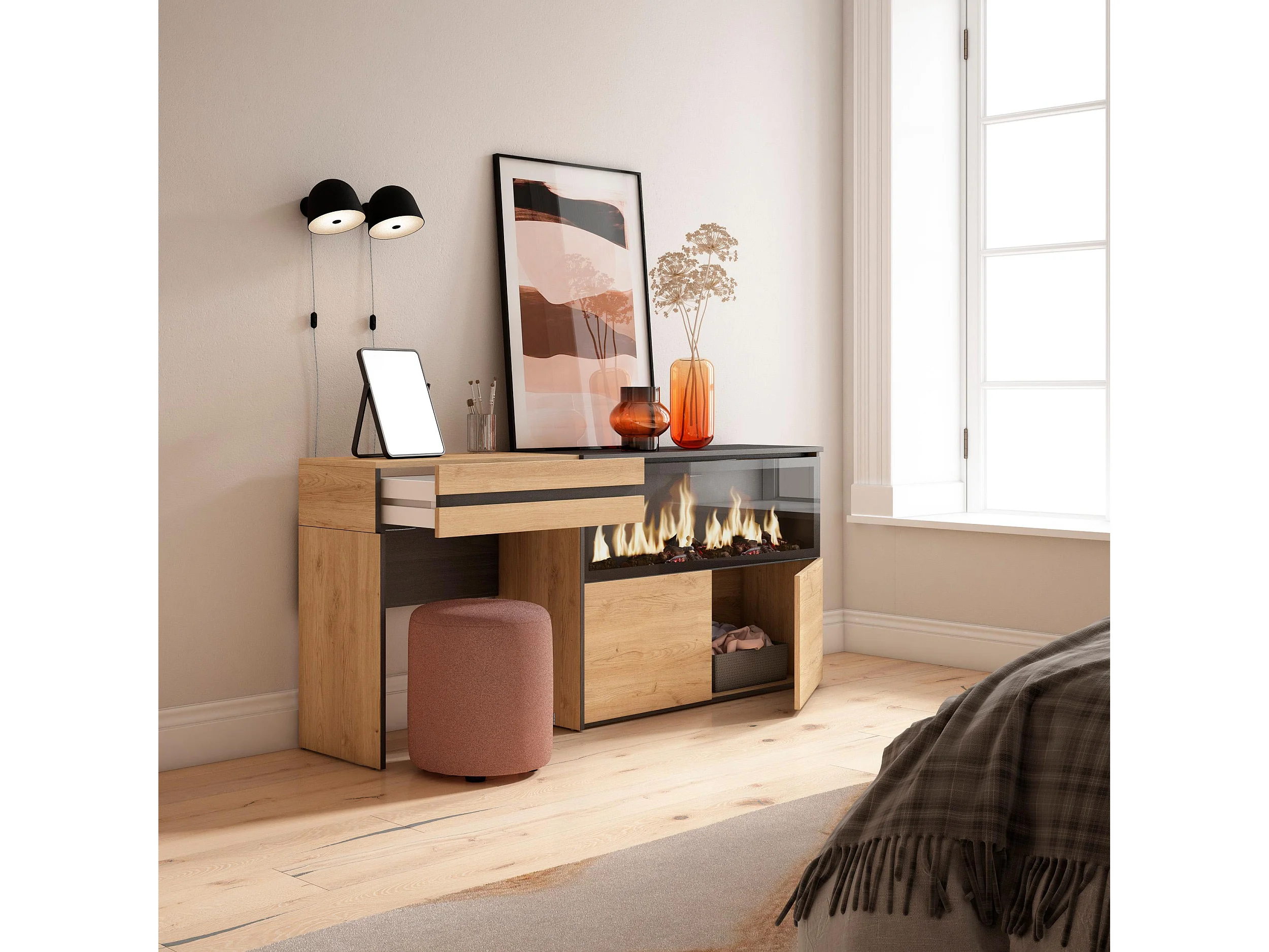 Coiffeuse, 177x35x75 cm, Avec tiroir, Cheminée électrique XXL, Chêne