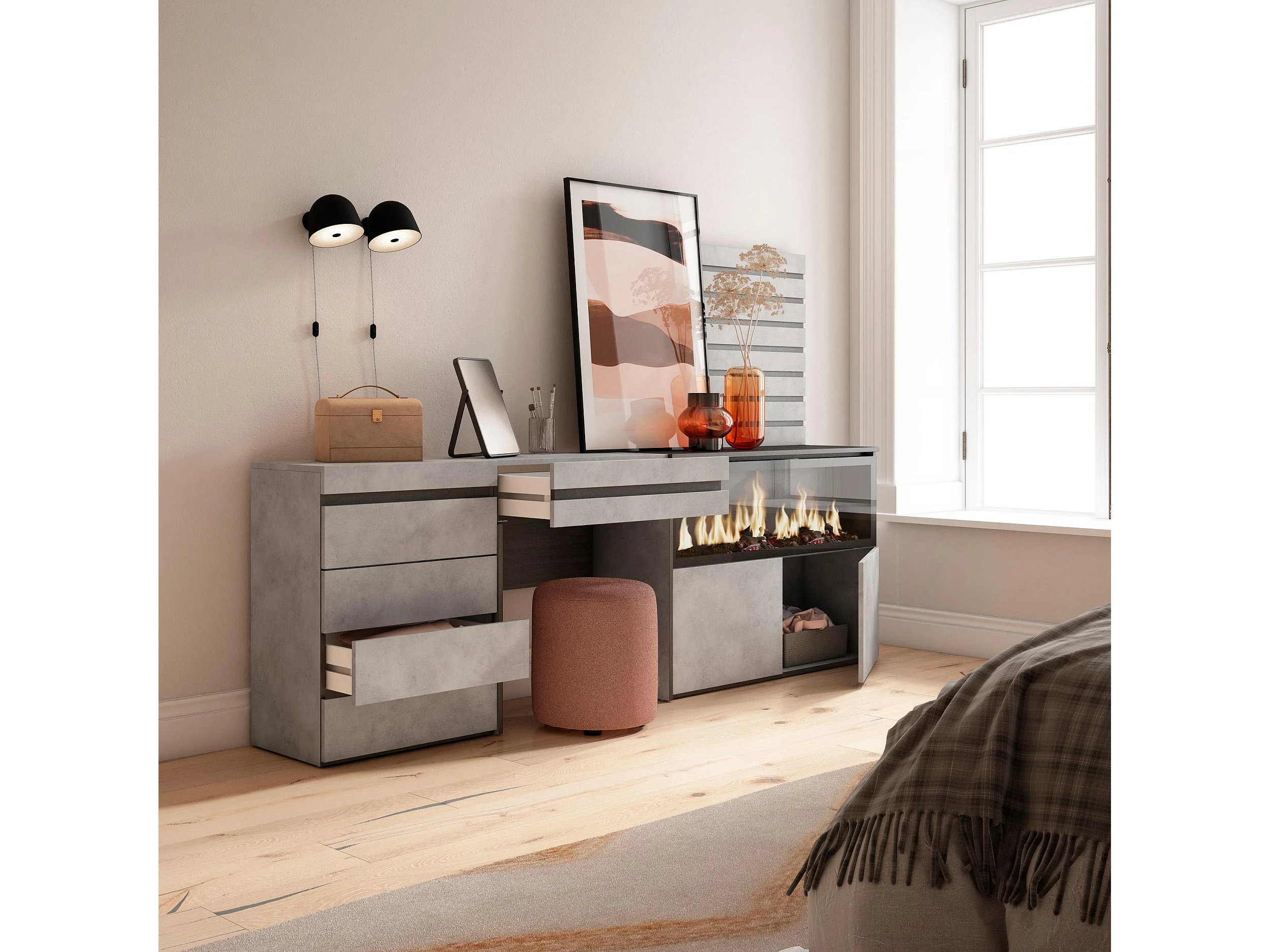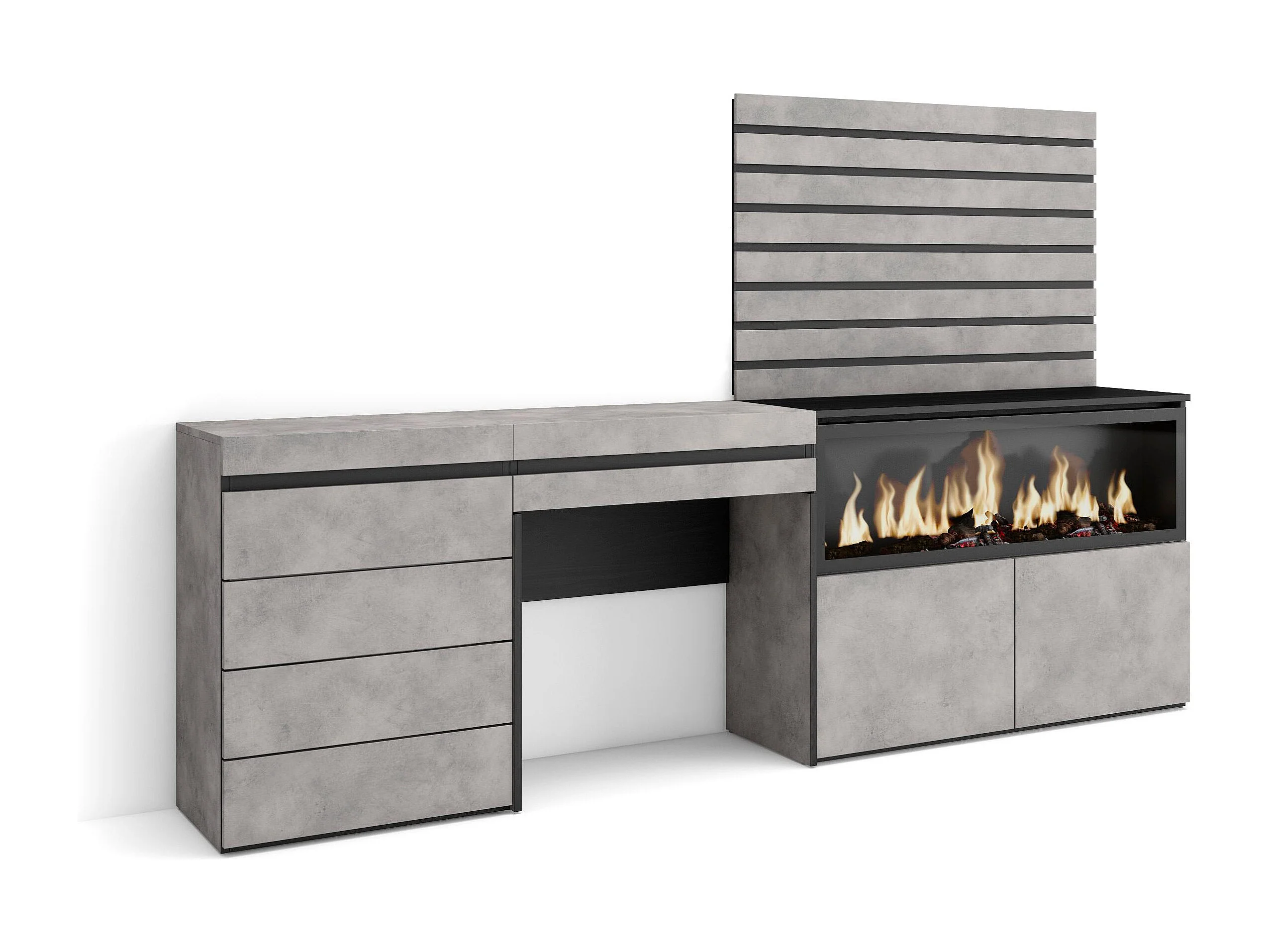 Coiffeuse, 234x35x145 cm, Avec tiroir, Cheminée électrique XXL, Commode, Buffet, Panneaux Muraux en Bois, Ciment