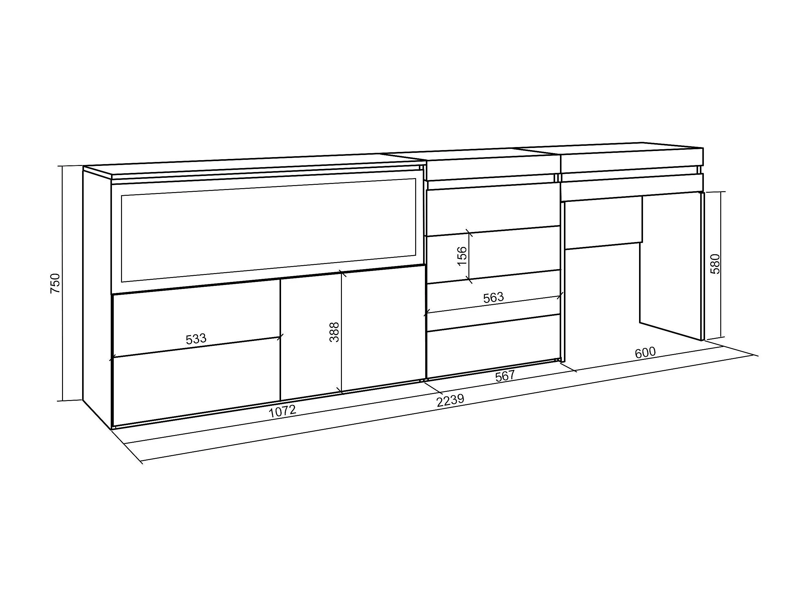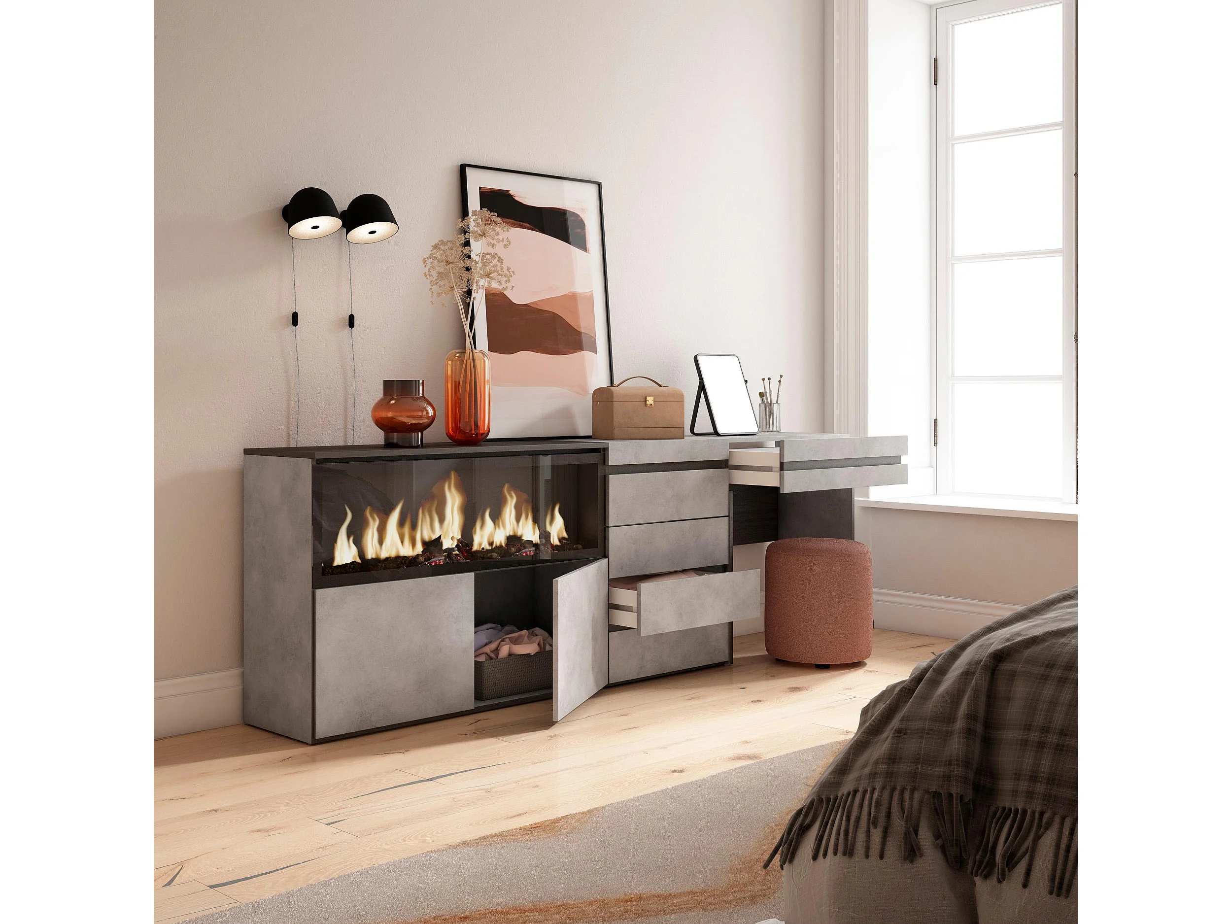 Coiffeuse, 234x35x75 cm, Avec tiroir, Cheminée électrique XXL, Commode, Buffet, Ciment