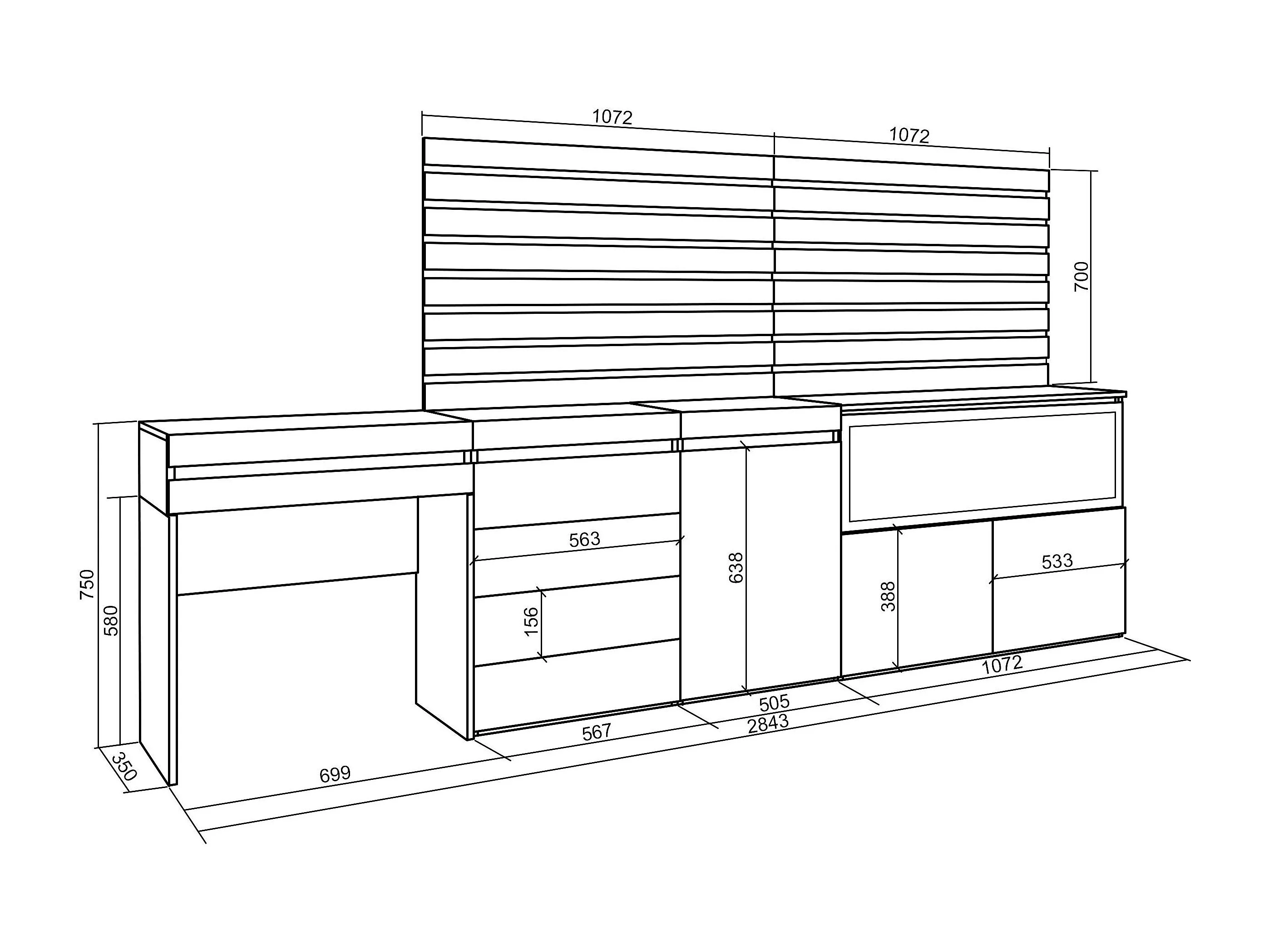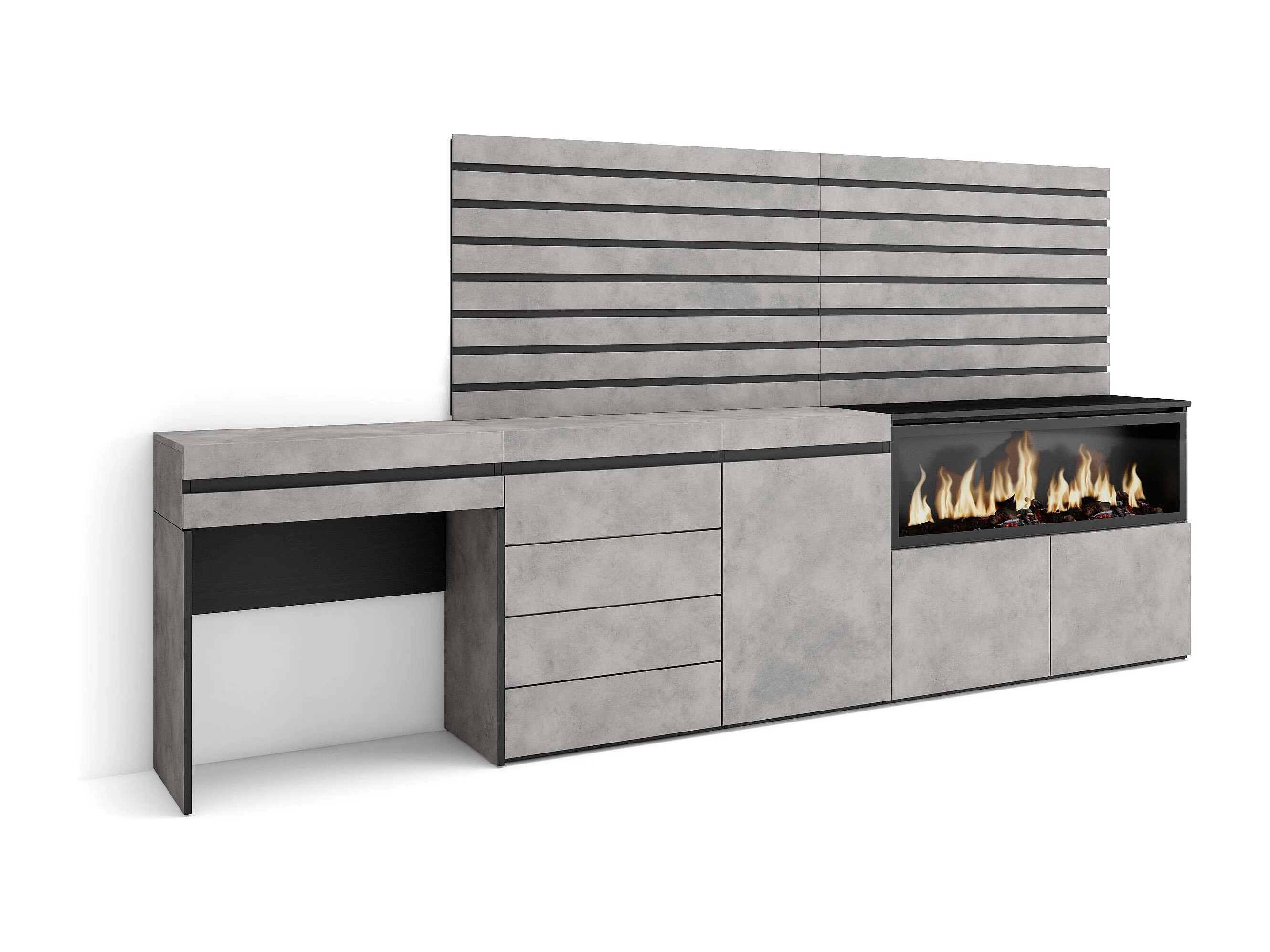 Coiffeuse, 284x35x145 cm, Avec tiroir, Cheminée électrique XXL, Commode, Buffet, Panneaux Muraux en Bois, Ciment