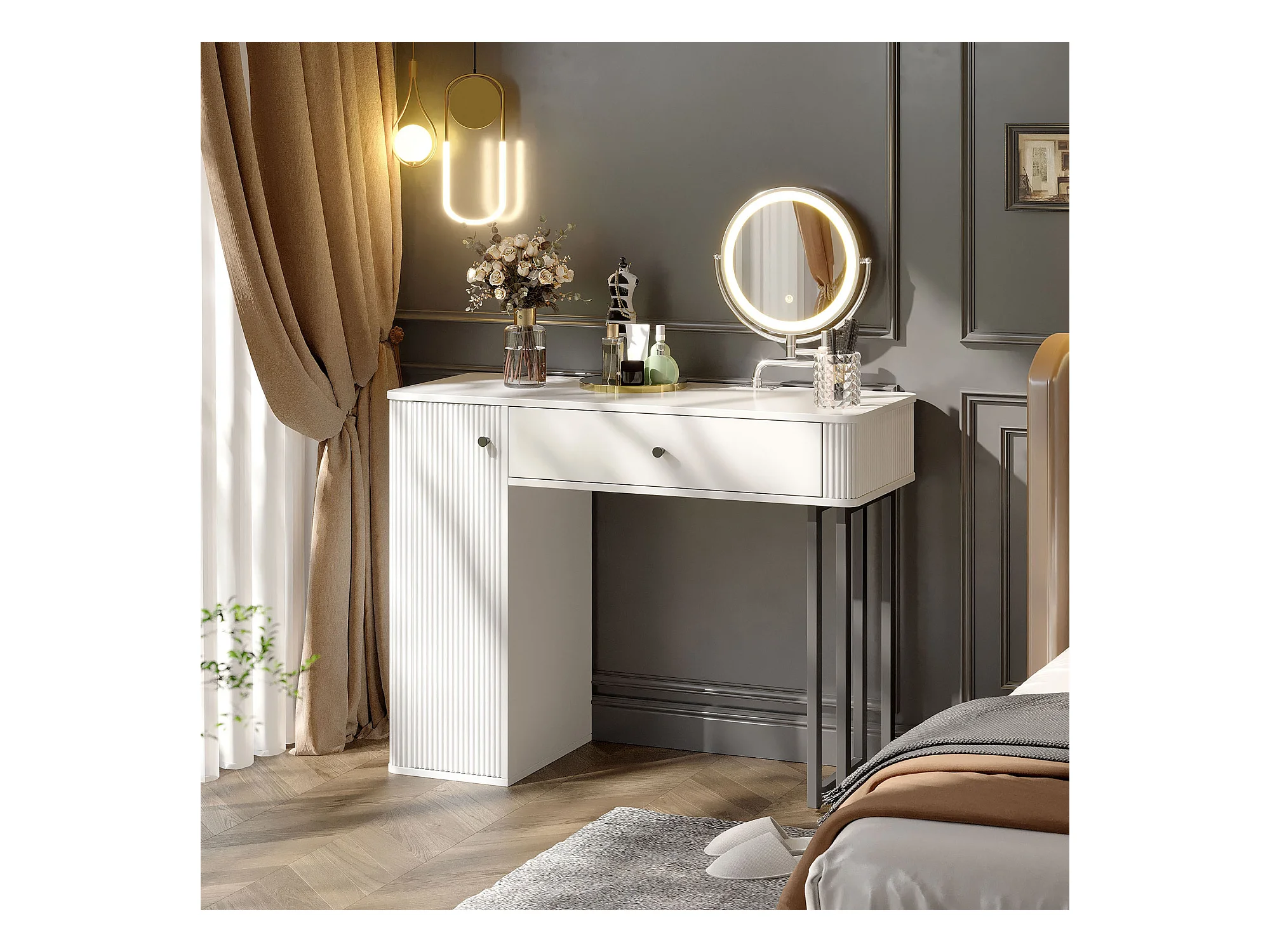 Coiffeuse avec miroir à LED - 2 tiroirs et une armoire amovible - Blanc (tabouret non inclus)