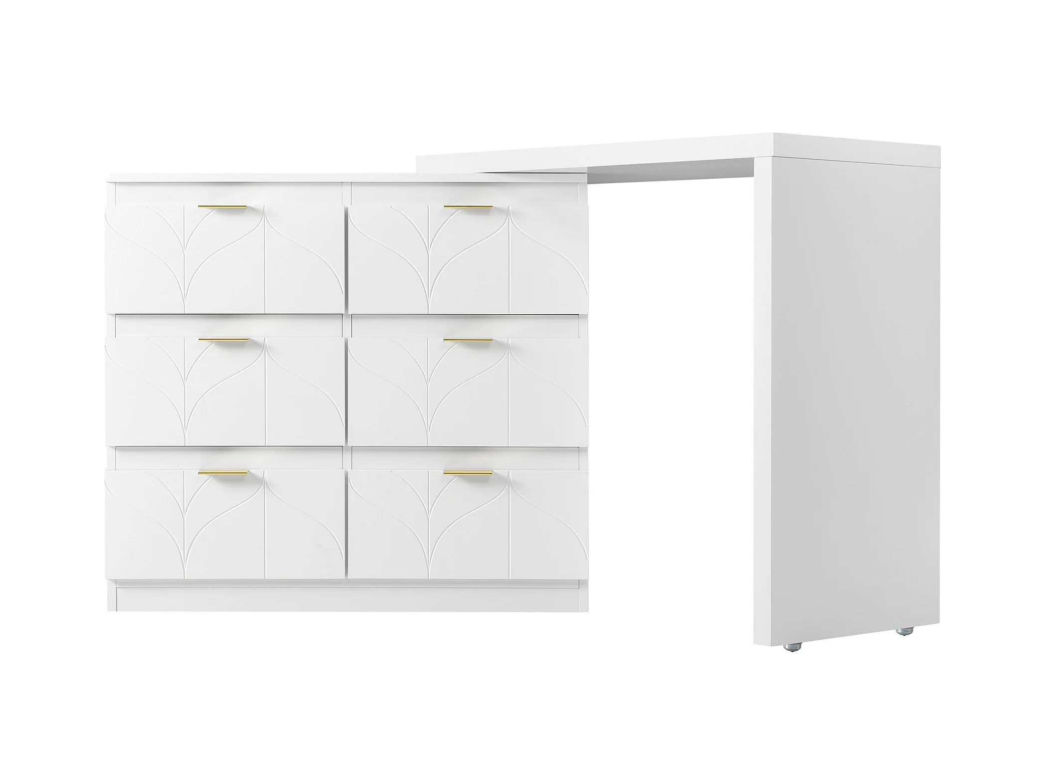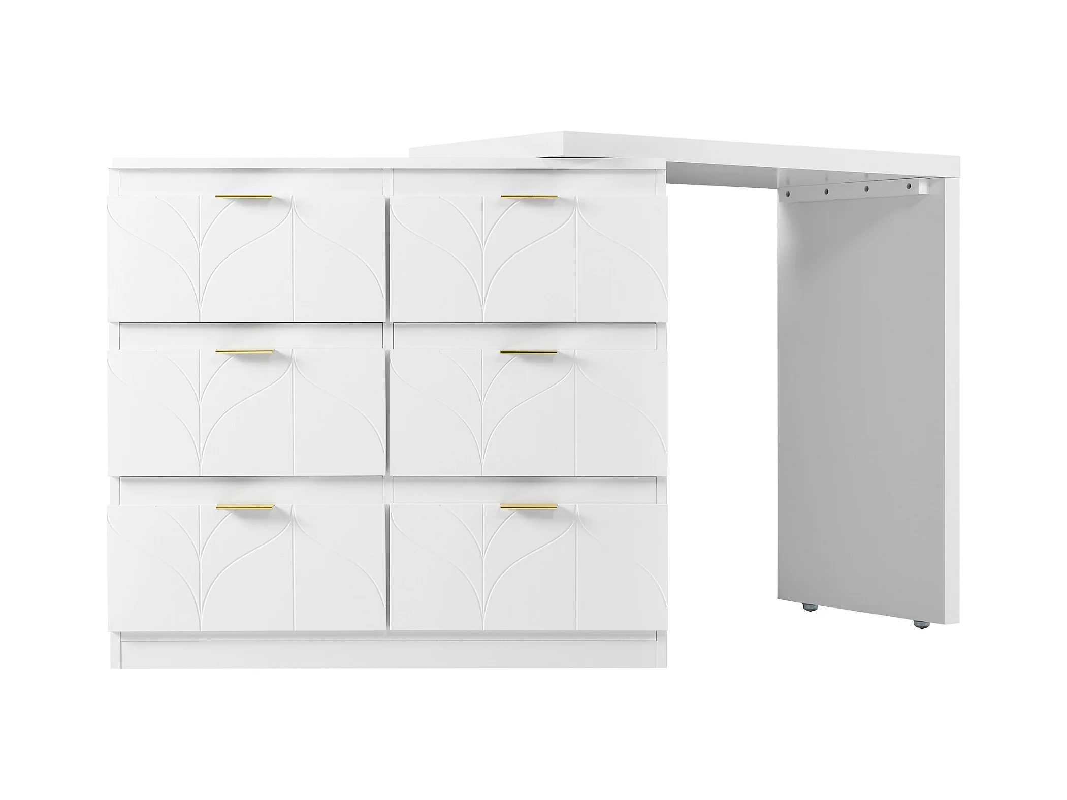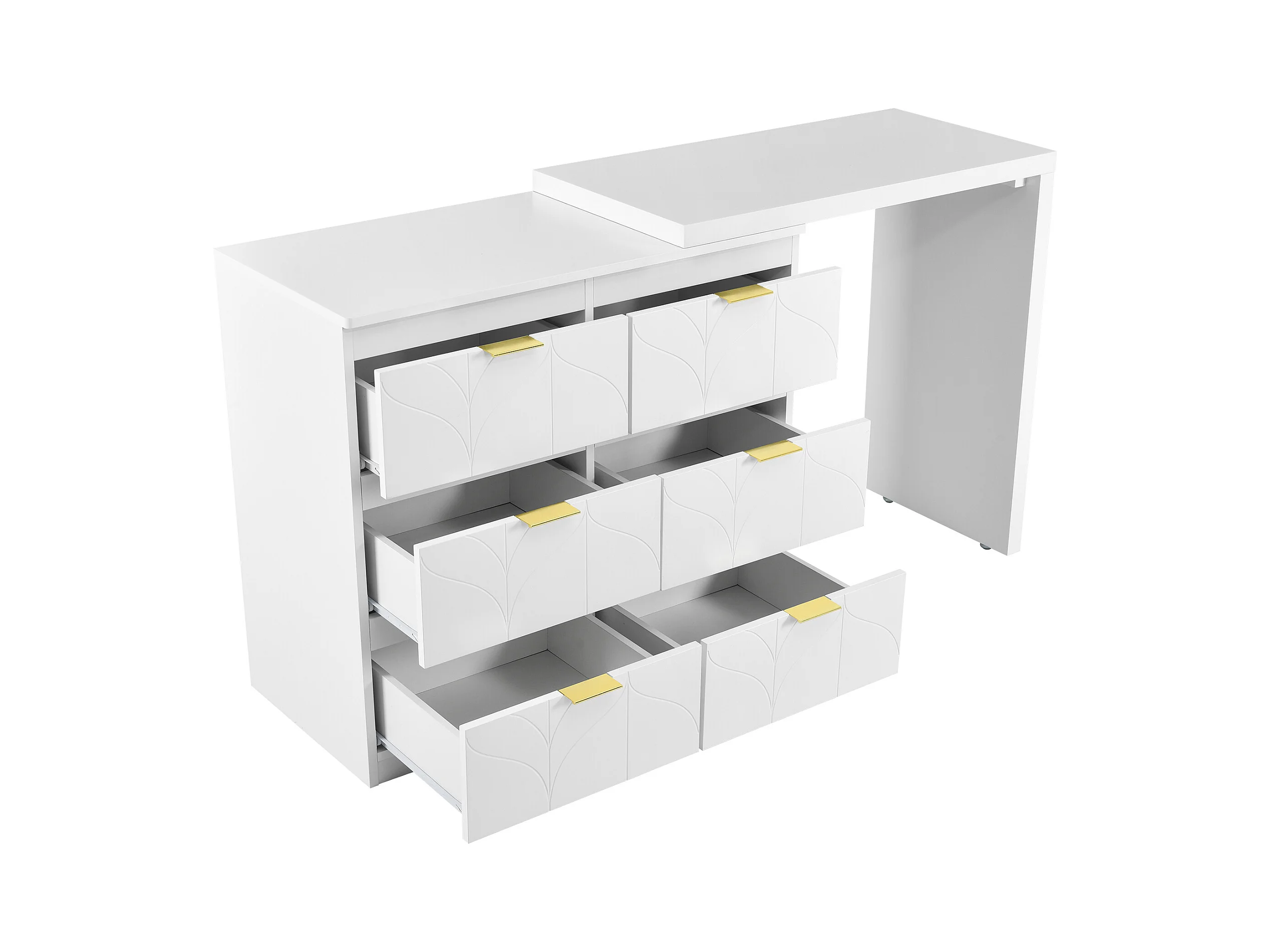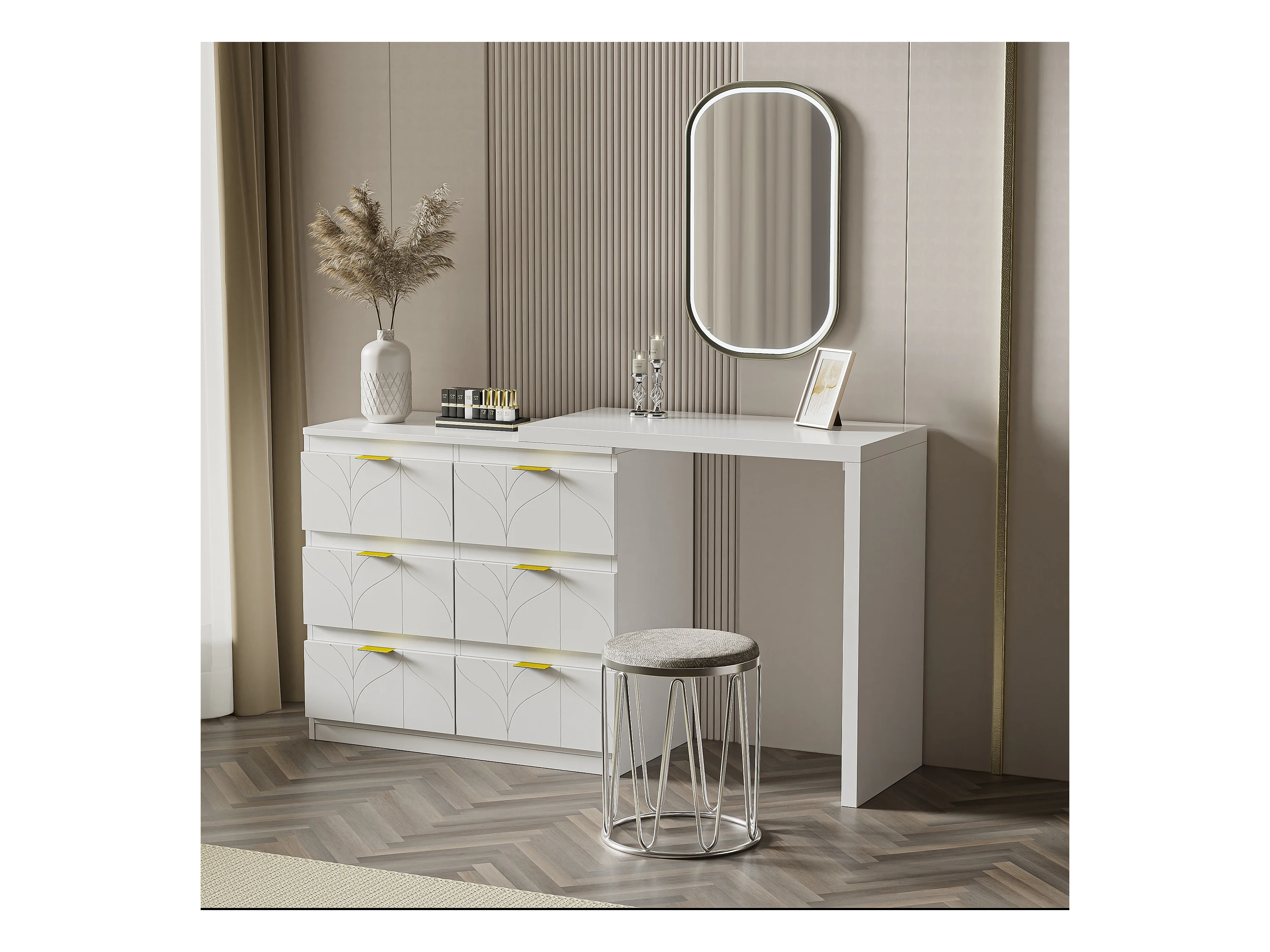 Coiffeuse blanche avec 5 tiroirs, design minimaliste, MDF, avec miroir à LED réglable et pieds dorés (90x40x73.5 cm)
