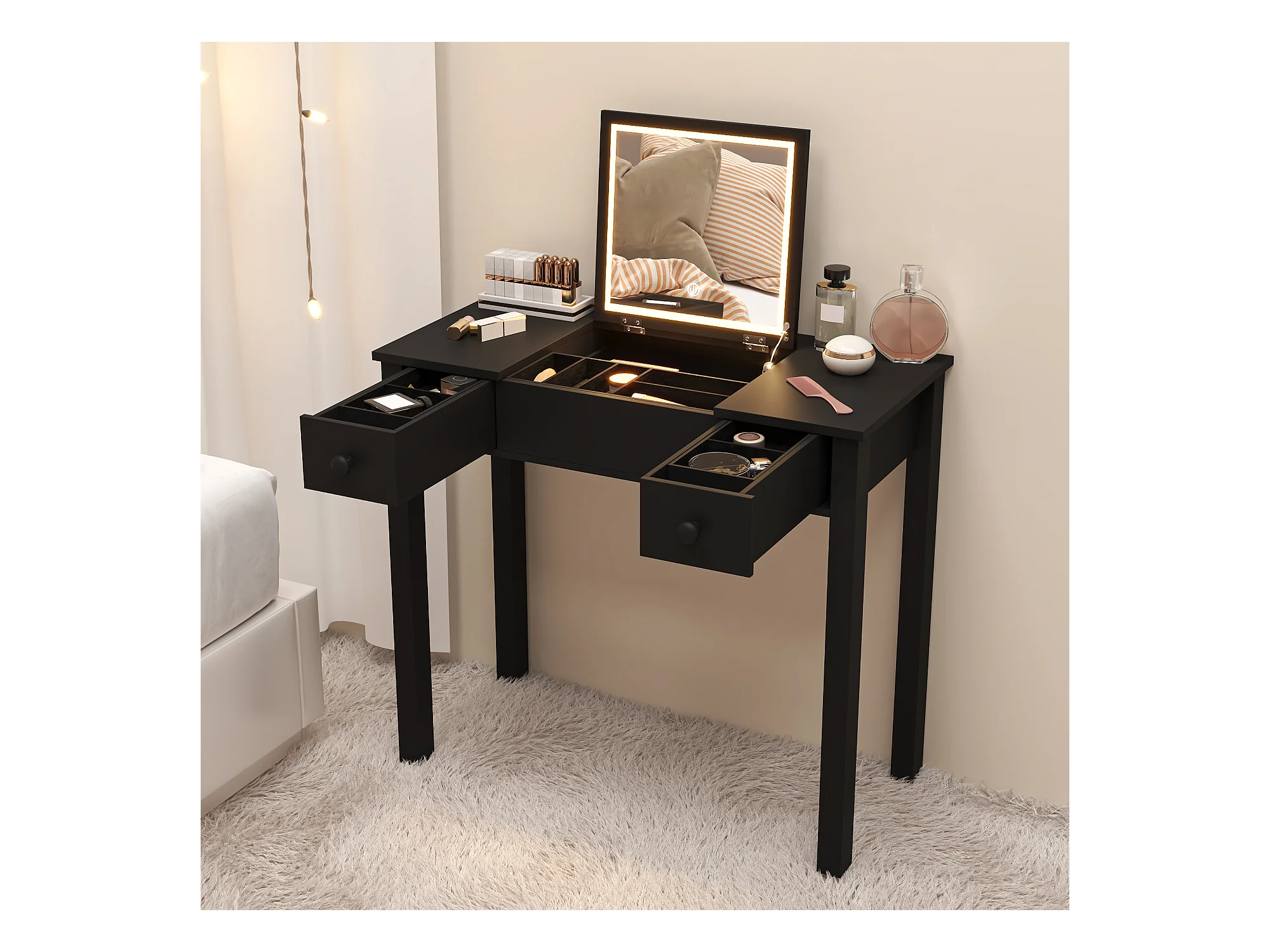 Coiffeuse noire avec miroir LED, design rabattable, MDF, avec 2 tiroirs pour bijoux (83.8x40x74.5 cm)