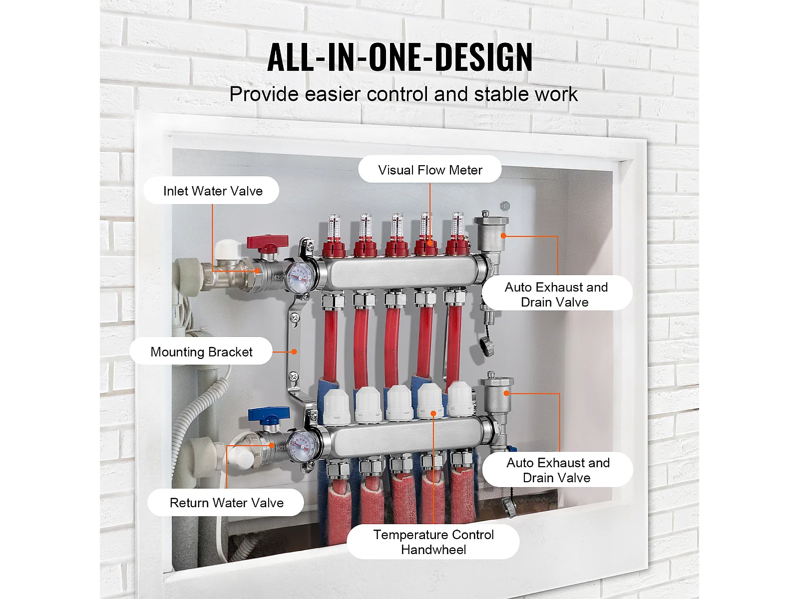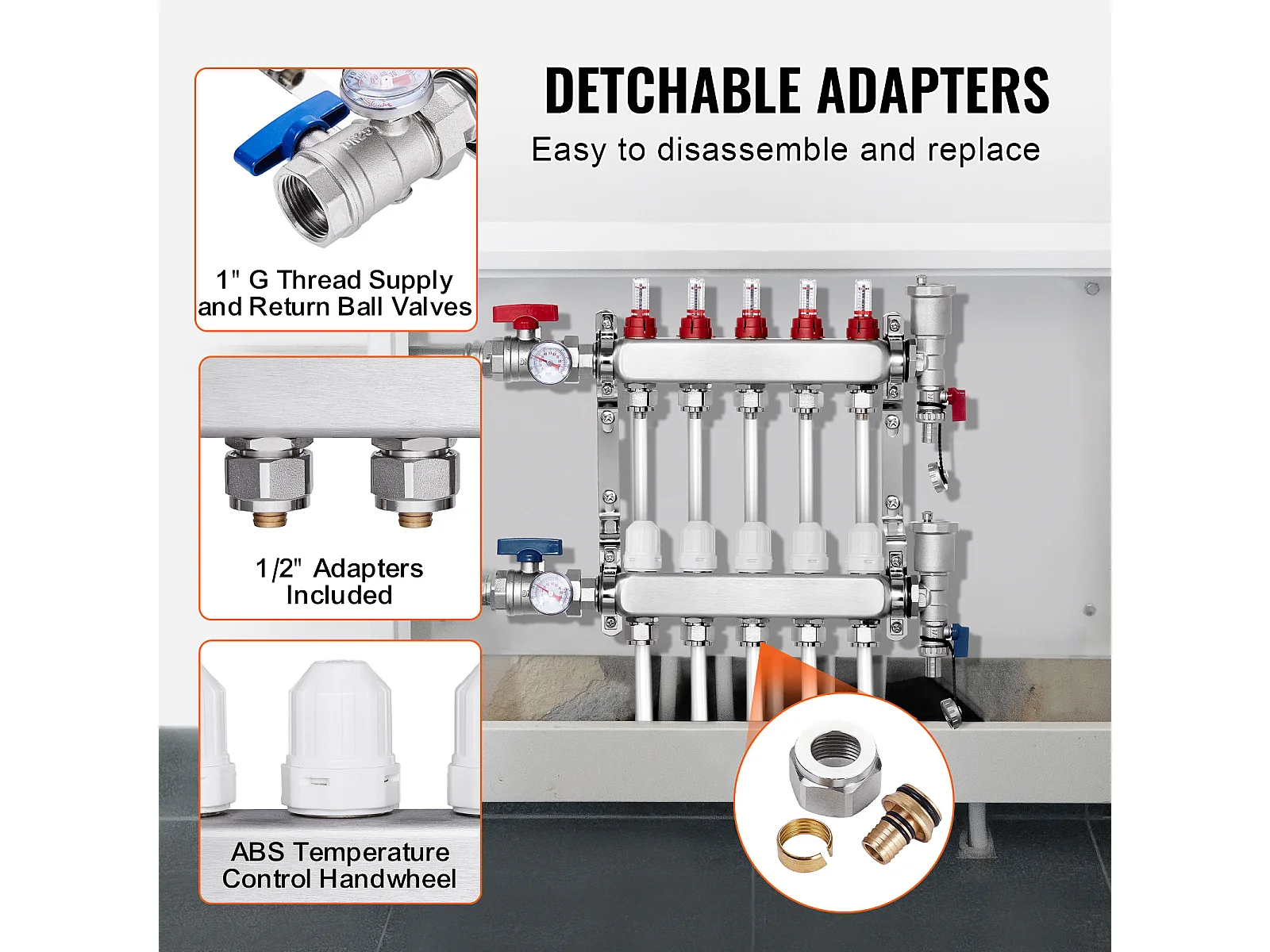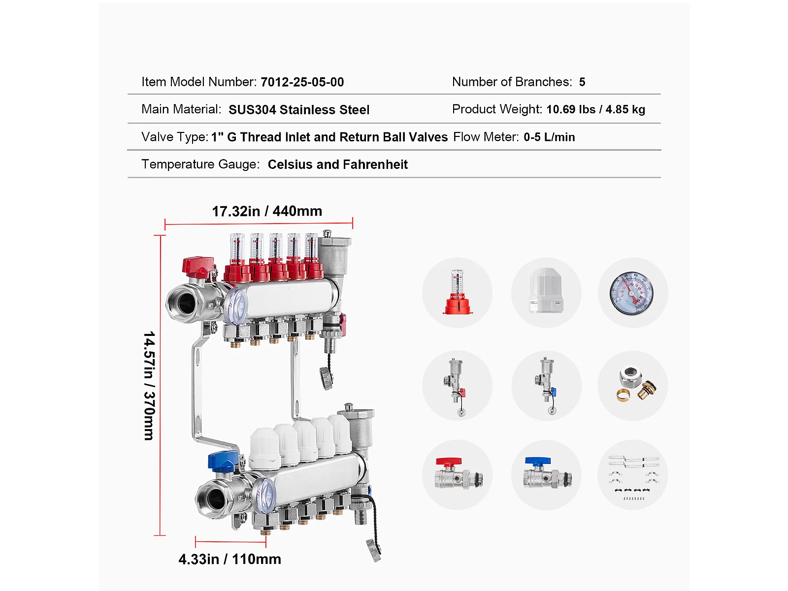Collecteur de Chauffage Radiant SucceBuy à 5 Branches Ensemble de Collecteur de Chauffage par le Sol avec Tubes PEX de 2.54/5.08cm