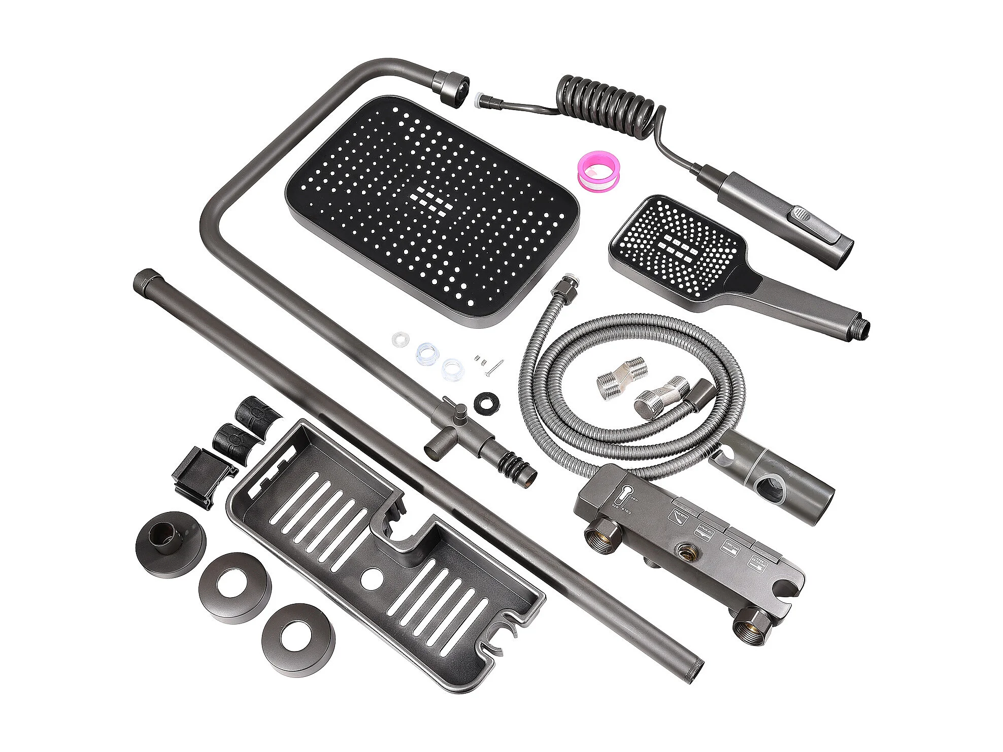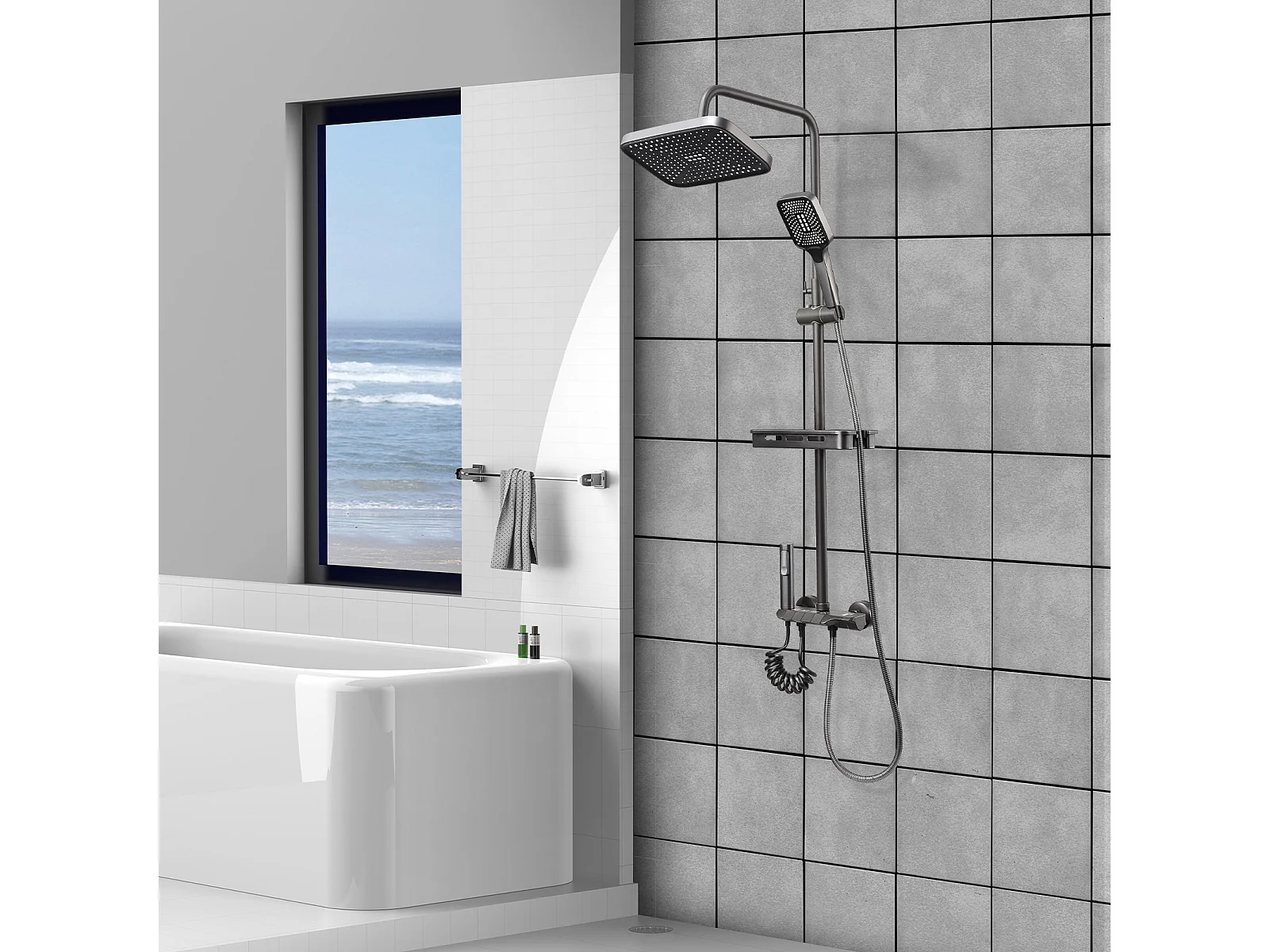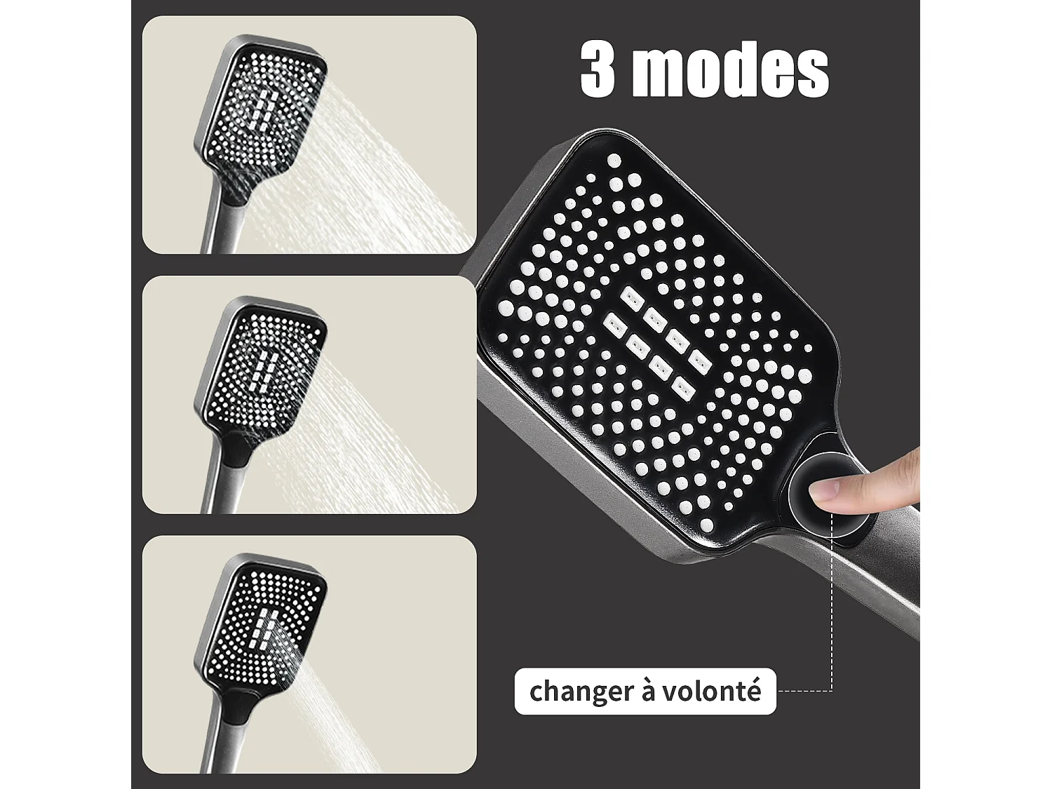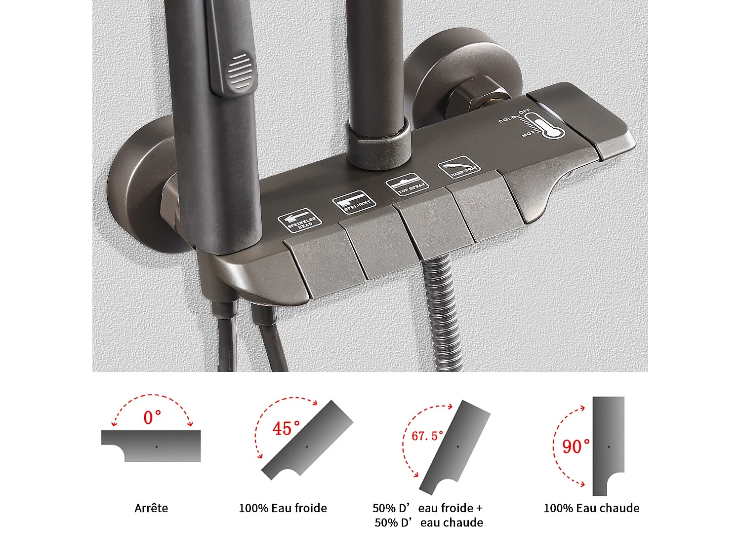 panneau de douche avec robinets noirs, Trois Fonctions en Effect Pierre gris, pommeau douche, douche à main, gets hydromassage, fixages, flexible
