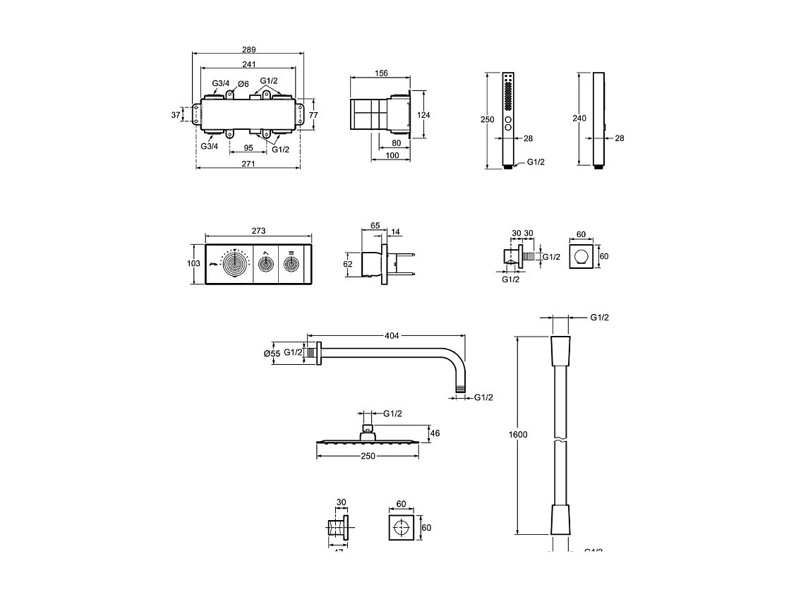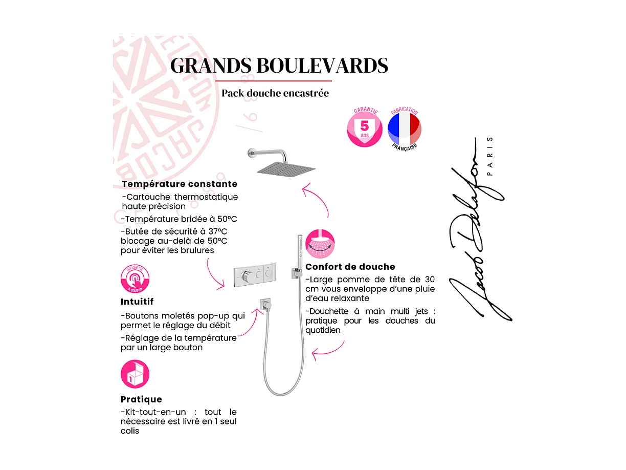Colonne de douche encastrée thermostatique JACOB DELAFON Grands Boulevards carrée chromée