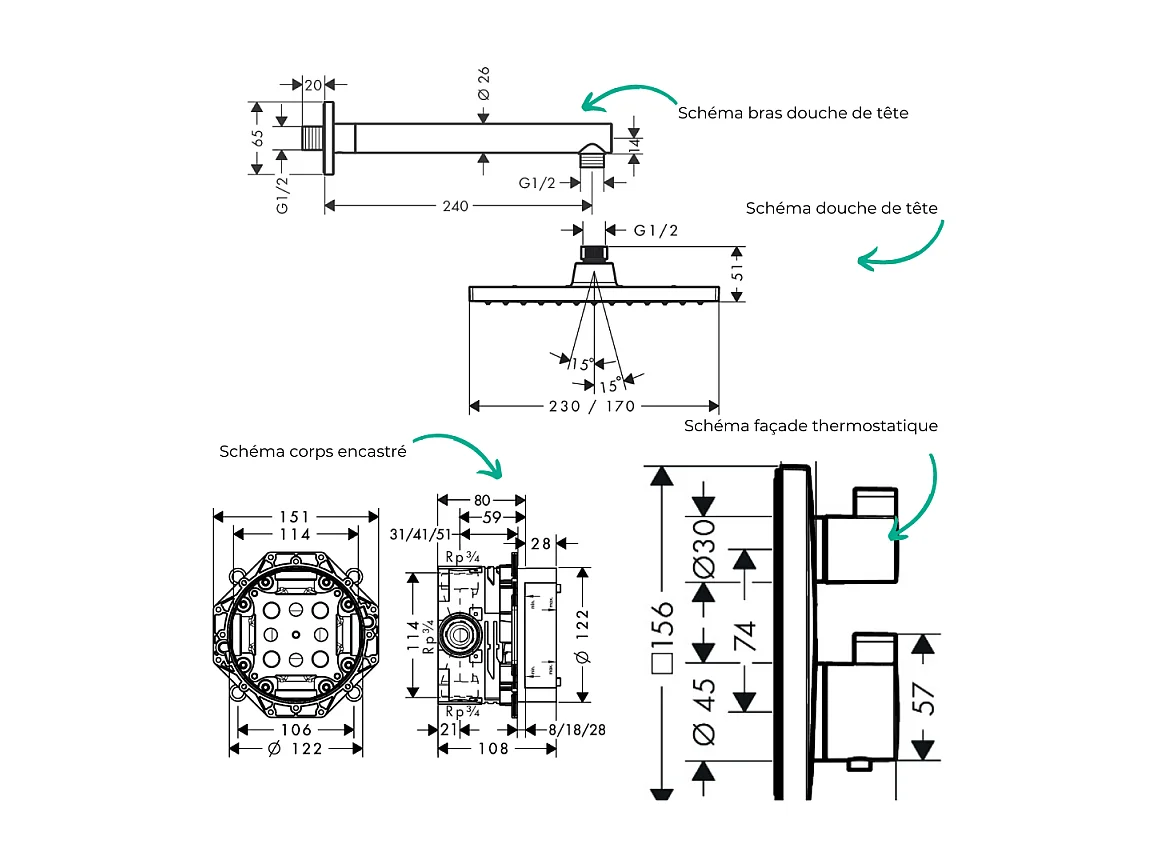 Colonne douche thermostatique HANSGROHE Ecostat Square Douche de tête Vernis Shape Flexible Metaflex Douchette Crometta chromé