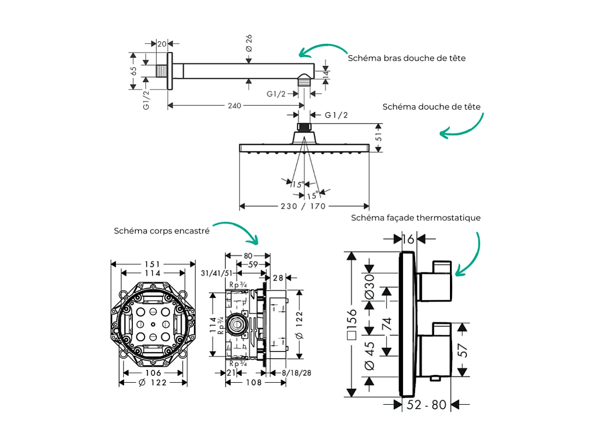 Colonne douche thermostatique HANSGROHE Ecostat Square Douche de tête Vernis Shape Flexible Metaflex Douchette Vernis Blend chromé