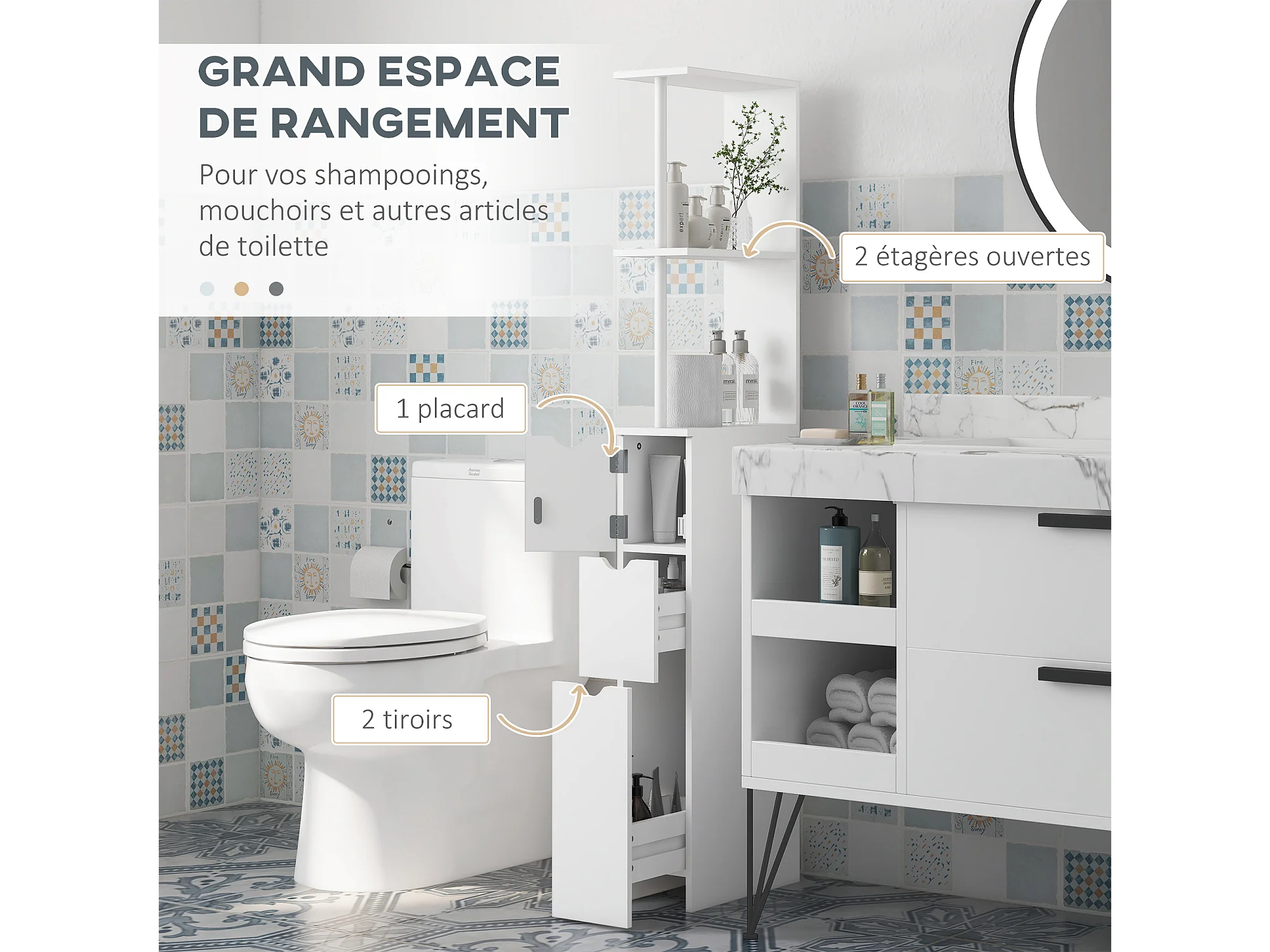 Colonne salle de bain style contemporain - 2 tiroirs, 2 étagères, porte - MDF métal blanc